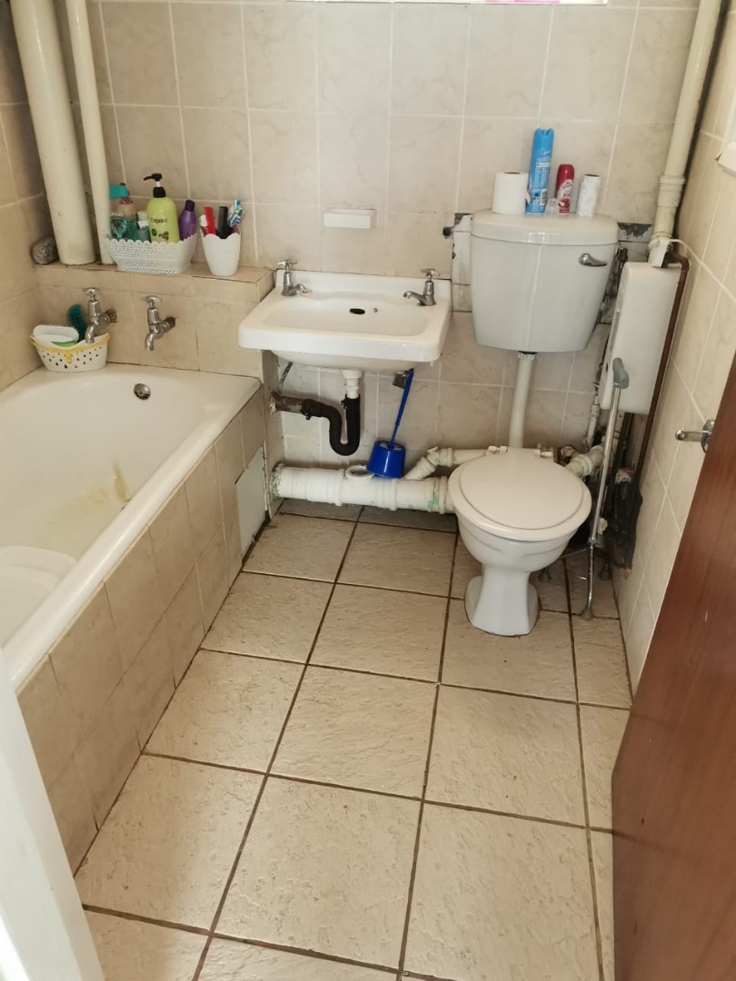 The residence comprises two well-proportioned bedrooms, each designed for practical comfort. The main bedroom benefits from excellent natural light and pleasant green views, featuring durable tiled flooring and a dedicated desk area. The single bathroom is fully tiled for straightforward upkeep and includes essential fixtures such as a bathtub, wall-mounted sink, and toilet.