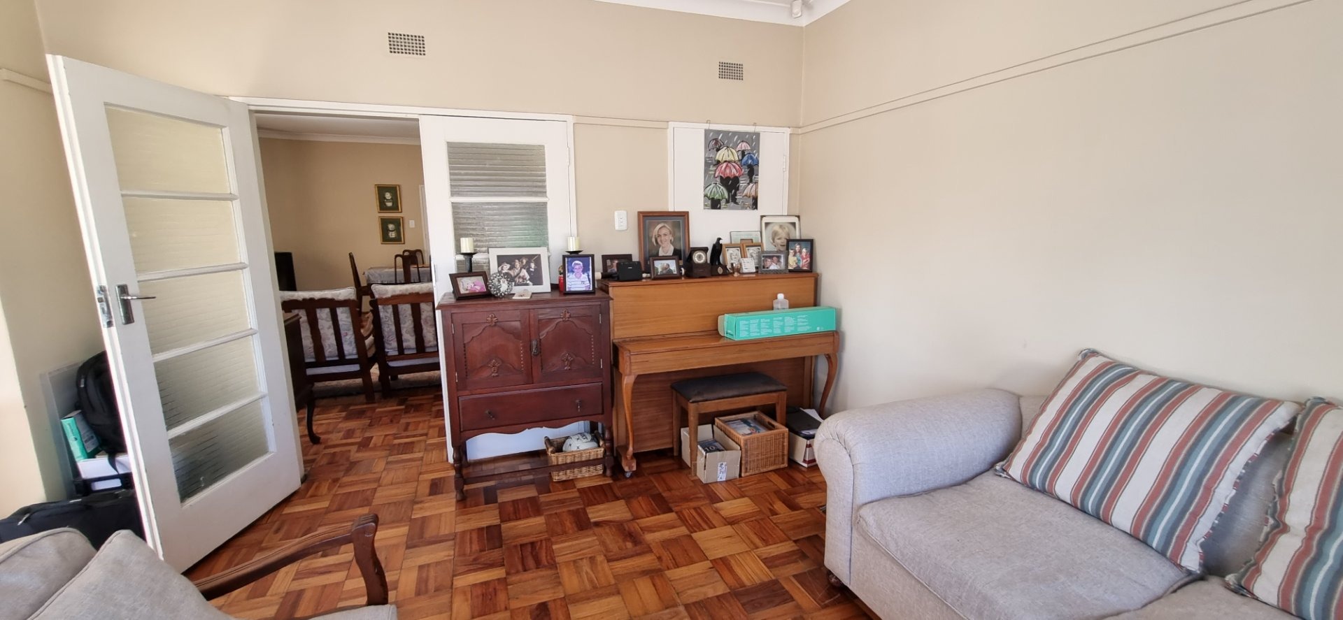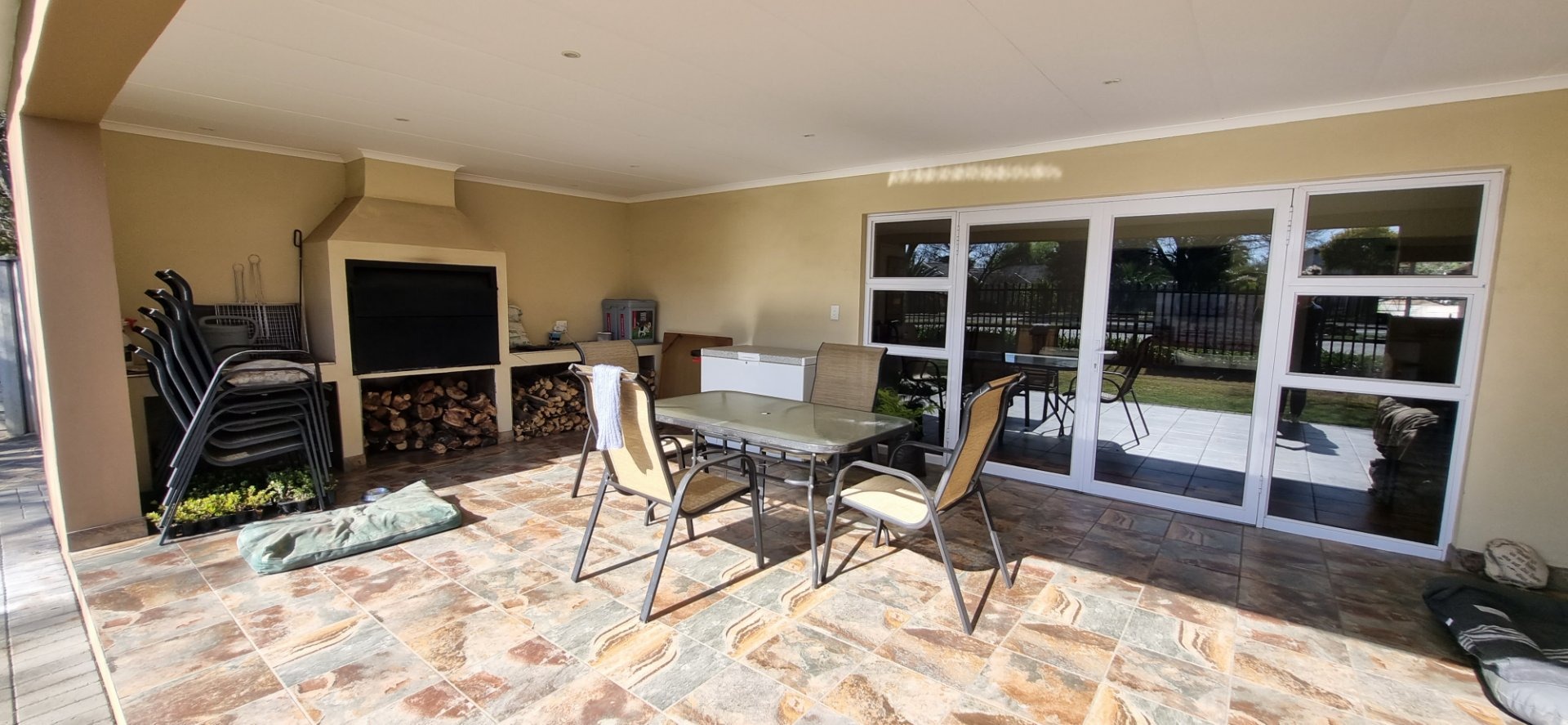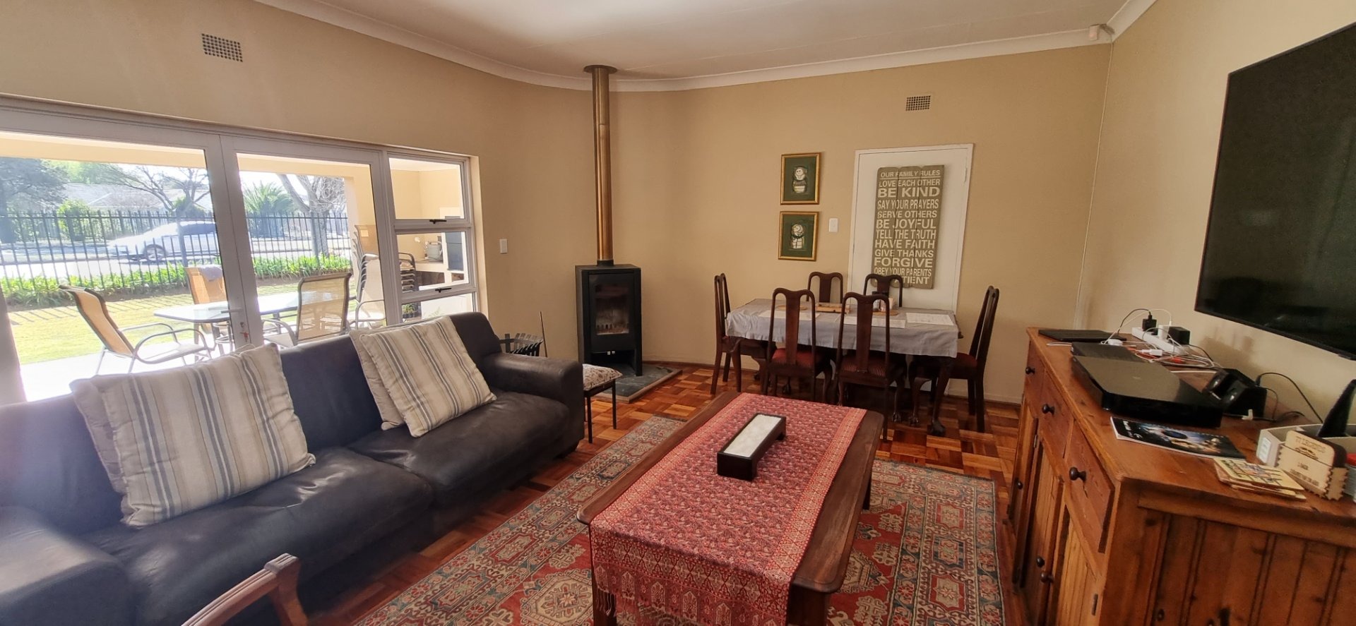 Discover this inviting family home located in the desirable Dan Pienaar suburb of Bloemfontein. The interior boasts a seamless flow, beginning with the spacious living and dining areas featuring classic parquet flooring. A cozy wood-burning stove adds warmth and character, while large sliding glass doors open to an outdoor patio, inviting natural light and extending your living space. The modern kitchen is a highlight, equipped with sleek white shaker-style cabinetry, dark countertops, and contemporary wood-look flooring. It includes a gas range, washing machine, and dishwasher, all complemented by a large window that ensures ample natural light. This residence offers three comfortable bedrooms, each featuring the same warm parquet flooring and large windows that fill the rooms with light. Built-in wardrobes provide practical storage solutions. The home further benefits from three well-appointed bathrooms, including one with a modern vessel sink set on a stylish vanity and decorative tiled walls, ensuring convenience for the entire household. Beyond the interior, the property provides excellent outdoor access, with a glass door leading to an additional outdoor area, perfect for relaxation or entertaining. The generous 800 sqm erf size offers potential for further landscaping or outdoor enhancements. Parking is well catered for with two garages and an additional two dedicated parking spaces, providing ample room for vehicles. For peace of mind, the home is fitted with security bars on windows. Situated in Dan Pienaar, a well-established area in Bloemfontein, this property offers a convenient and family-friendly lifestyle, close to local amenities and services. Key Features: * 3 Bedrooms, 3 Bathrooms * Spacious living and dining areas * Modern kitchen with gas range and appliances * Cozy wood-burning stove * Classic parquet flooring throughout * Ample natural light from large windows * Direct access to outdoor areas/patio * Two garages and two additional parking spaces * Generous 800 sqm erf size * Security bars on windows