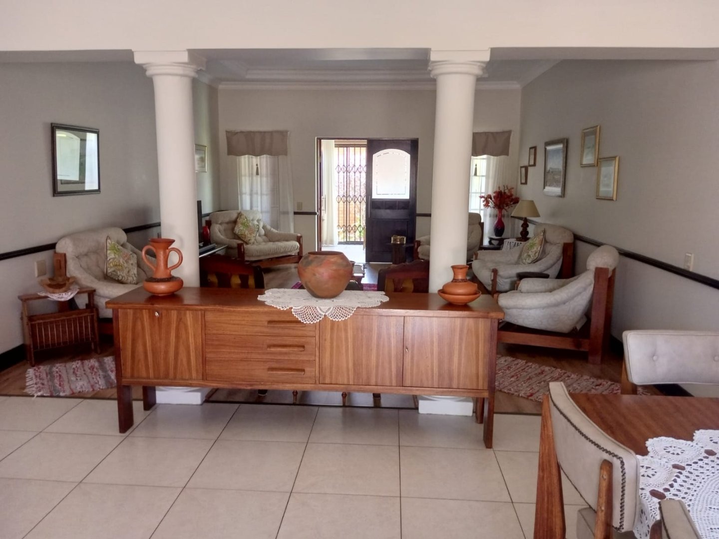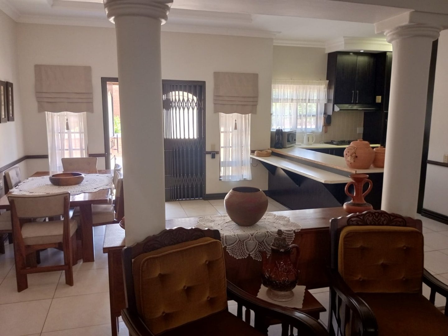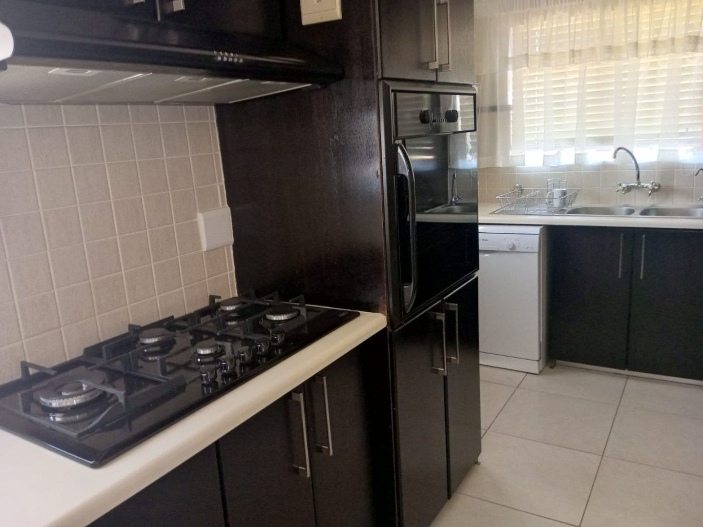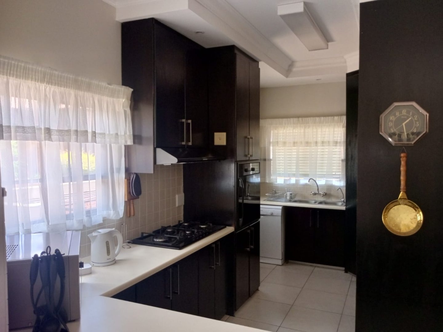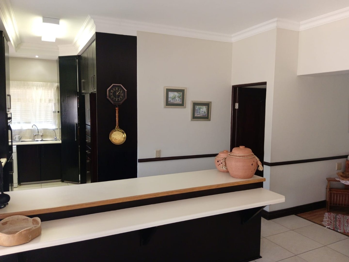 The interior features an inviting open-plan living and dining area. The modern kitchen is fitted with sleek dark cabinetry, integrated appliances, and a breakfast bar, ideal for comfortable everyday living and entertaining. A built-in braai further enhances the relaxed lifestyle on offer.