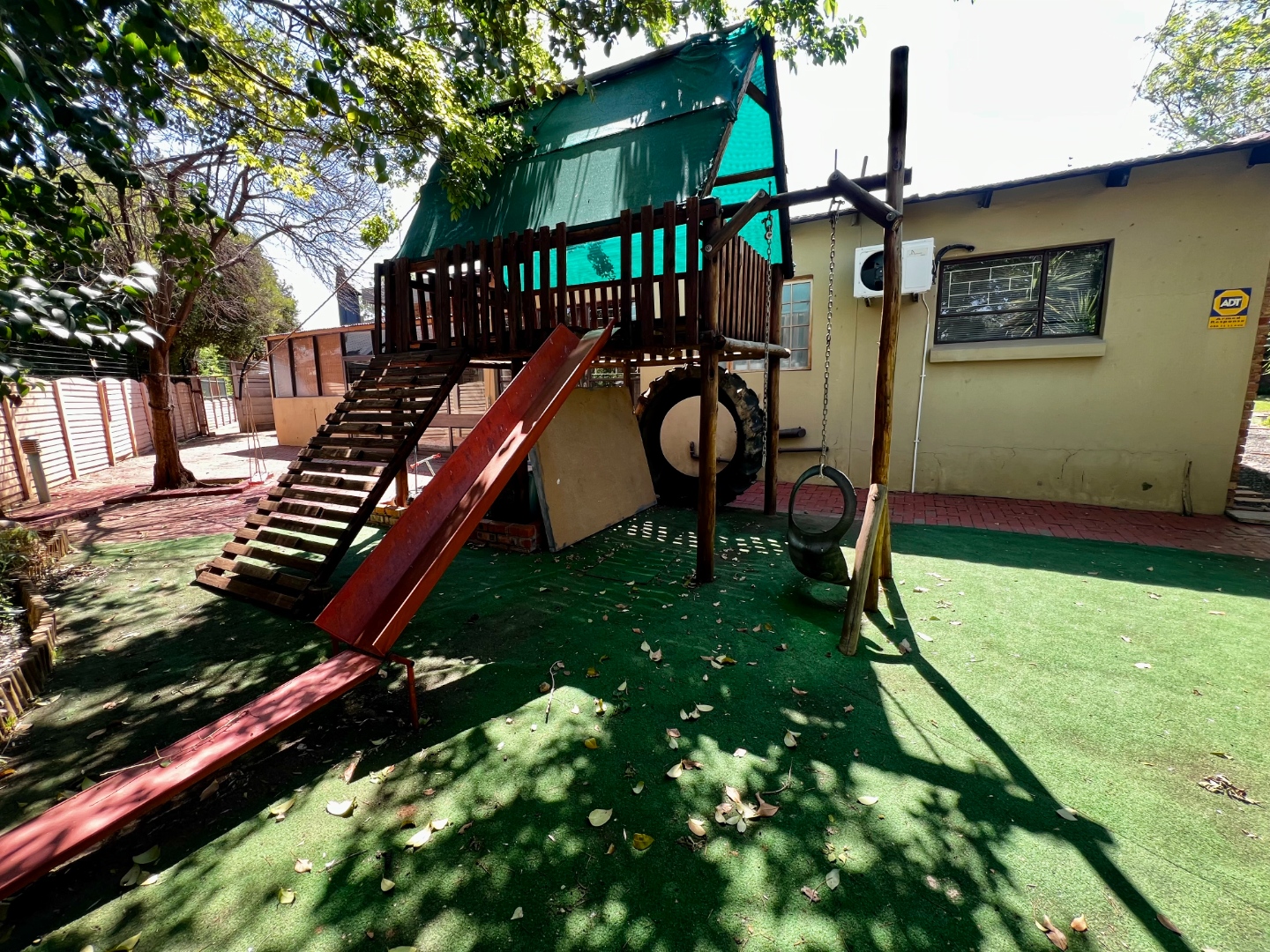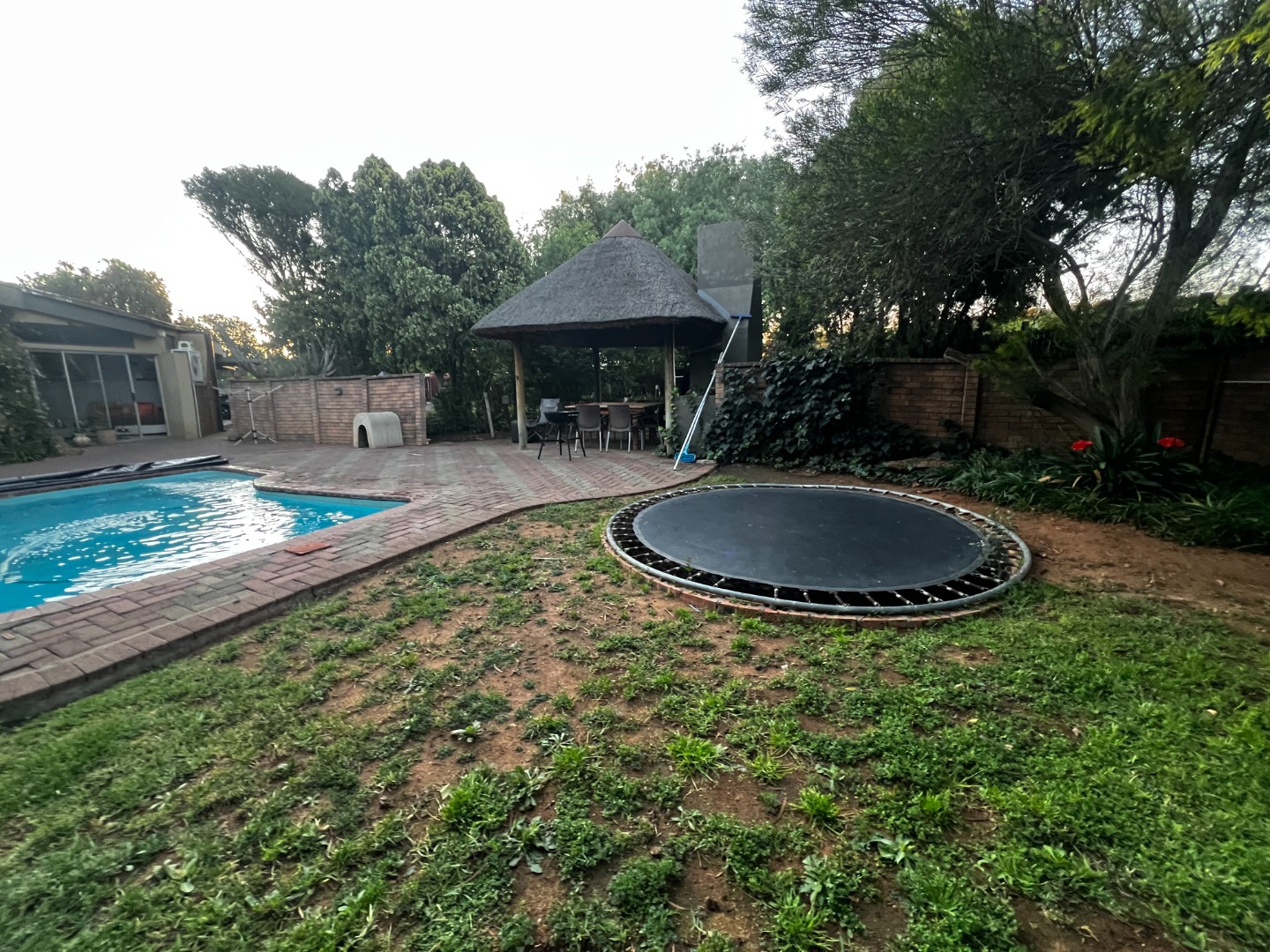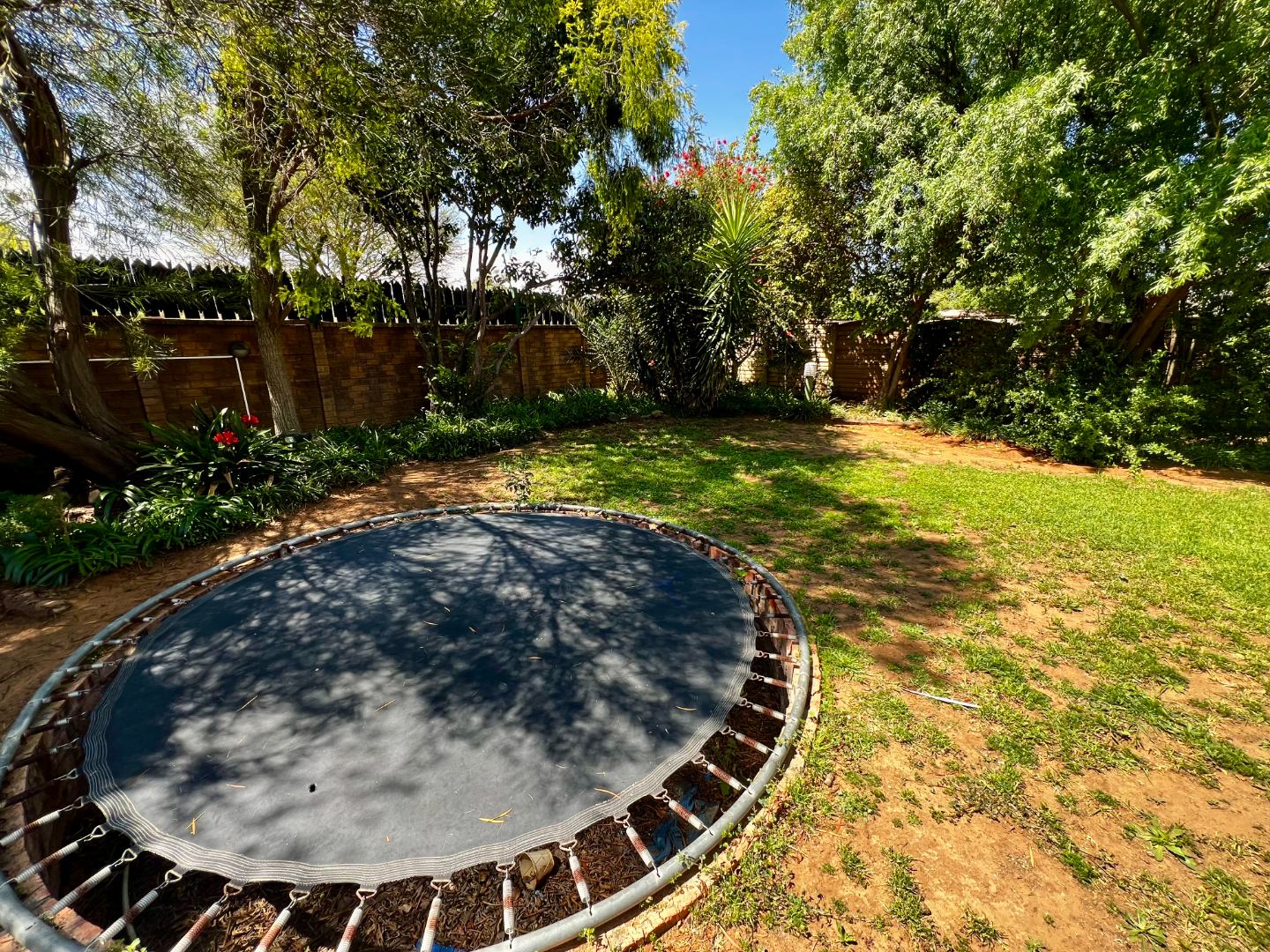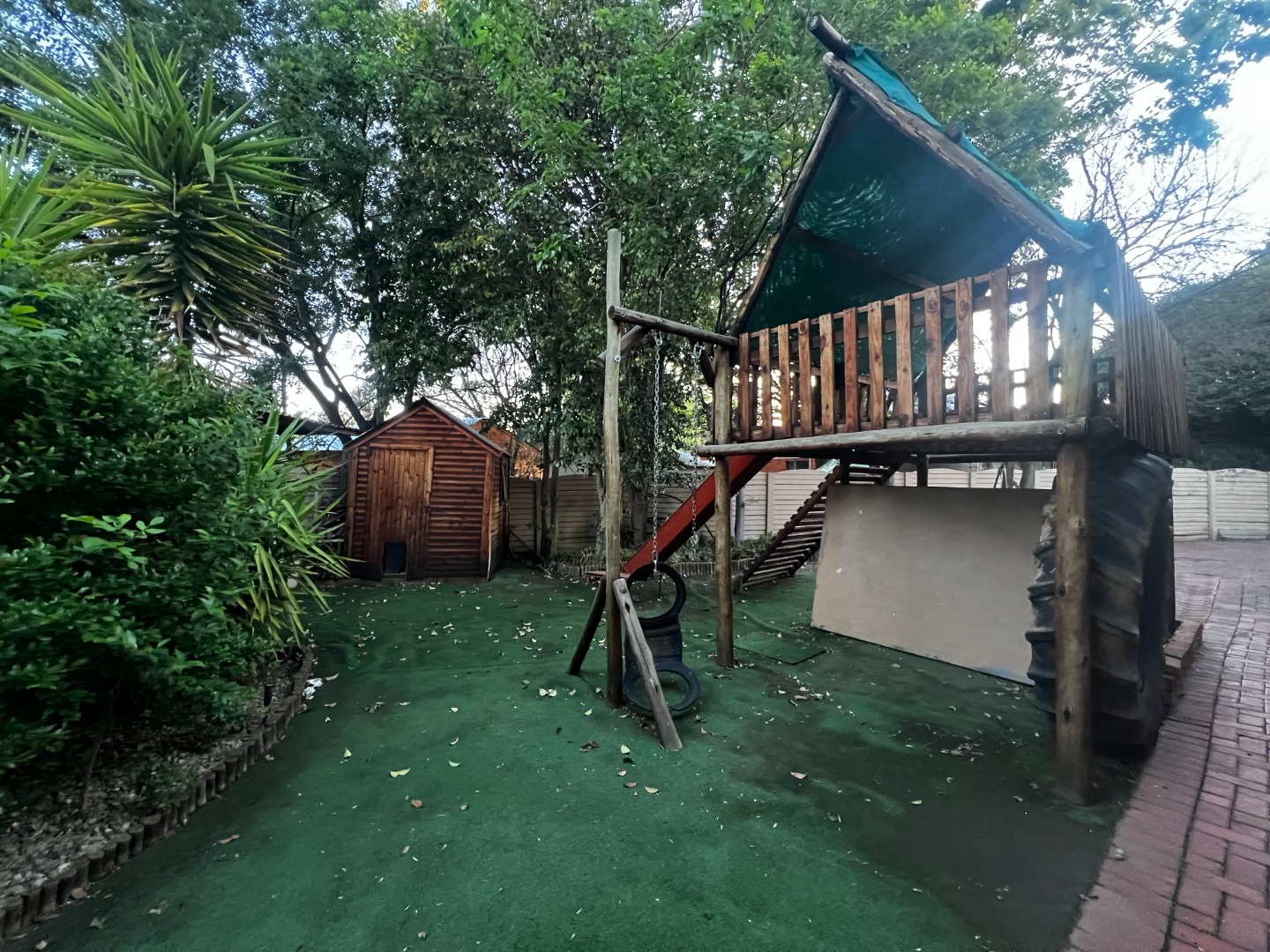 The outdoor area is designed for leisure and enjoyment. A sparkling swimming pool forms the centerpiece of the backyard, surrounded by a landscaped garden with an automated irrigation system. Children are catered for with their very own playhouse, while a Wendy house provides additional storage or workshop space.