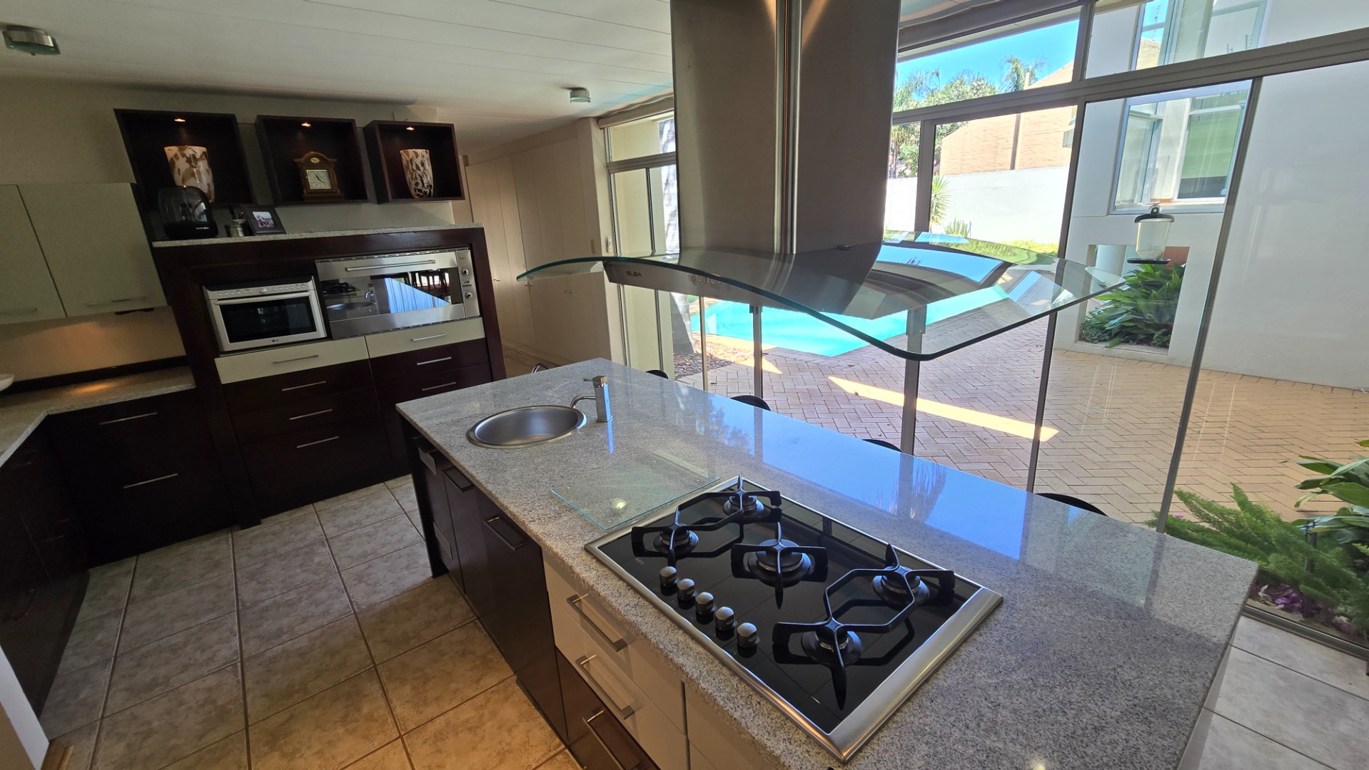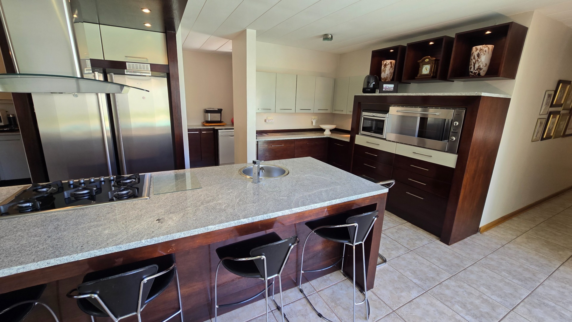 Discover this modern, multi-story residence in Heuwelsig, Bloemfontein, offering an expansive 571 sqm of living space on a generous 1670 sqm erf. The home features an inviting entrance hall, two spacious lounges, and a dedicated dining area, all designed with an open-plan flow. The contemporary kitchen is a highlight, boasting a large island with an integrated gas hob, sleek stainless steel appliances, ample two-tone cabinetry, and a convenient pantry.
