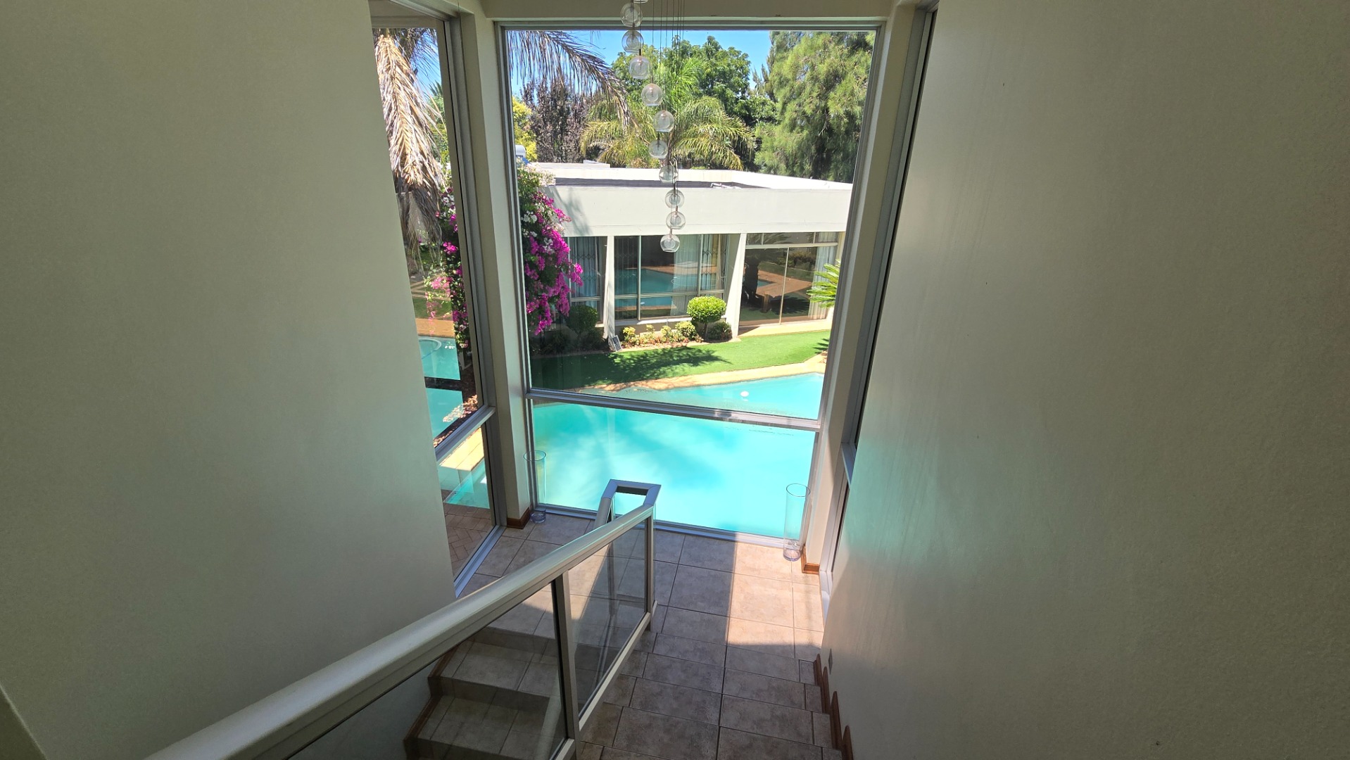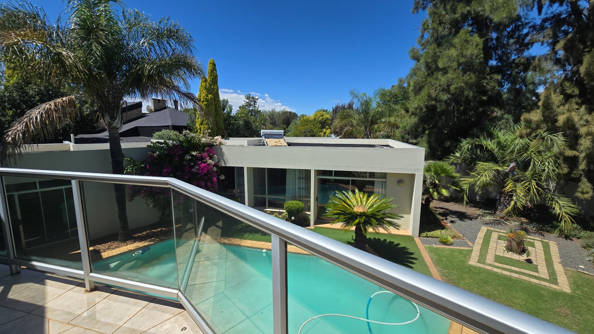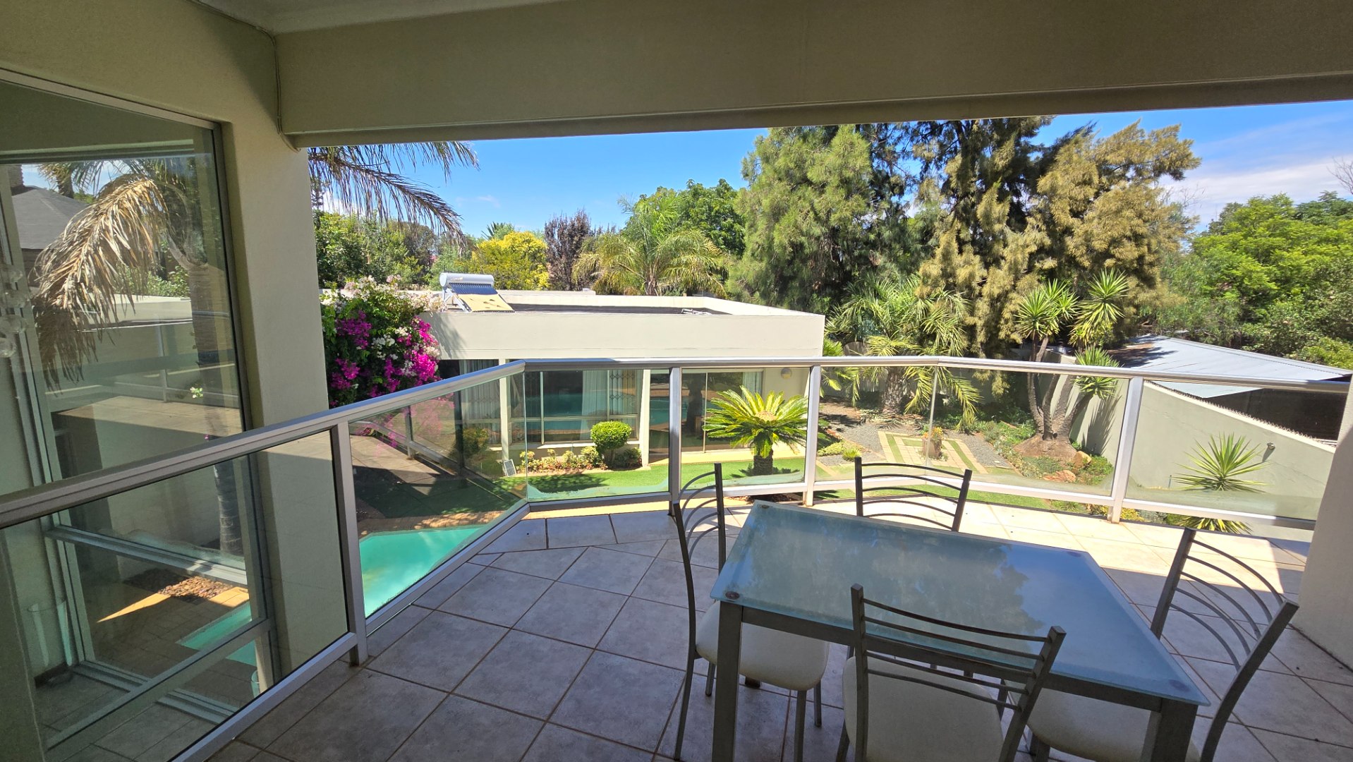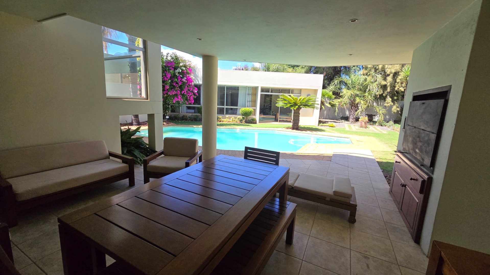 This property offers four well-appointed bedrooms and 2.5 bathrooms, including two en-suite, plus a dedicated study. Outside, a private oasis awaits with a sparkling swimming pool, lush tropical landscaping, and artificial turf. An expansive patio with a built-in braai and a balcony provide ideal entertaining spaces. Four garages, a well-maintained garden, and paved driveways complete the exterior.
