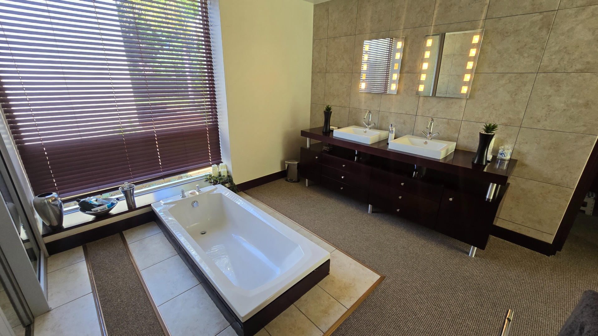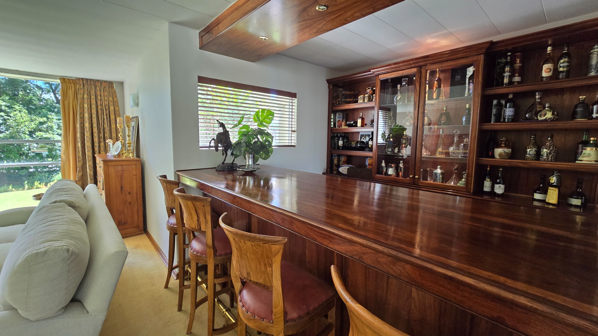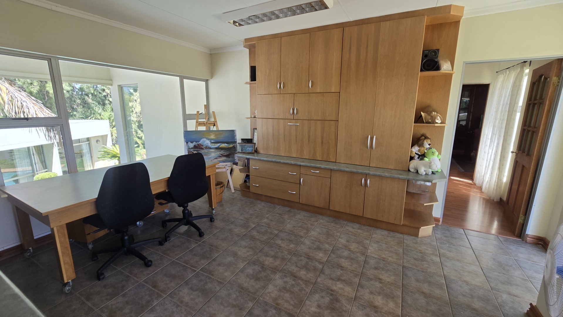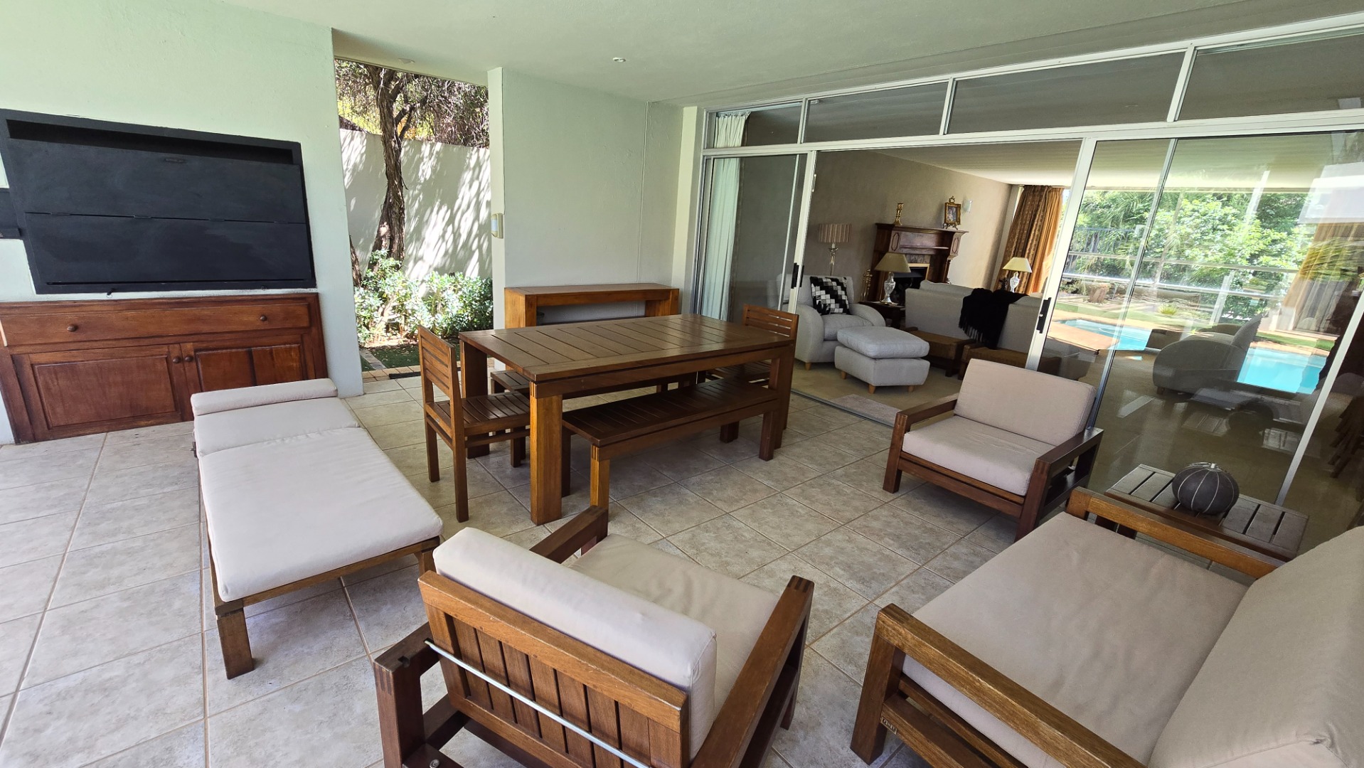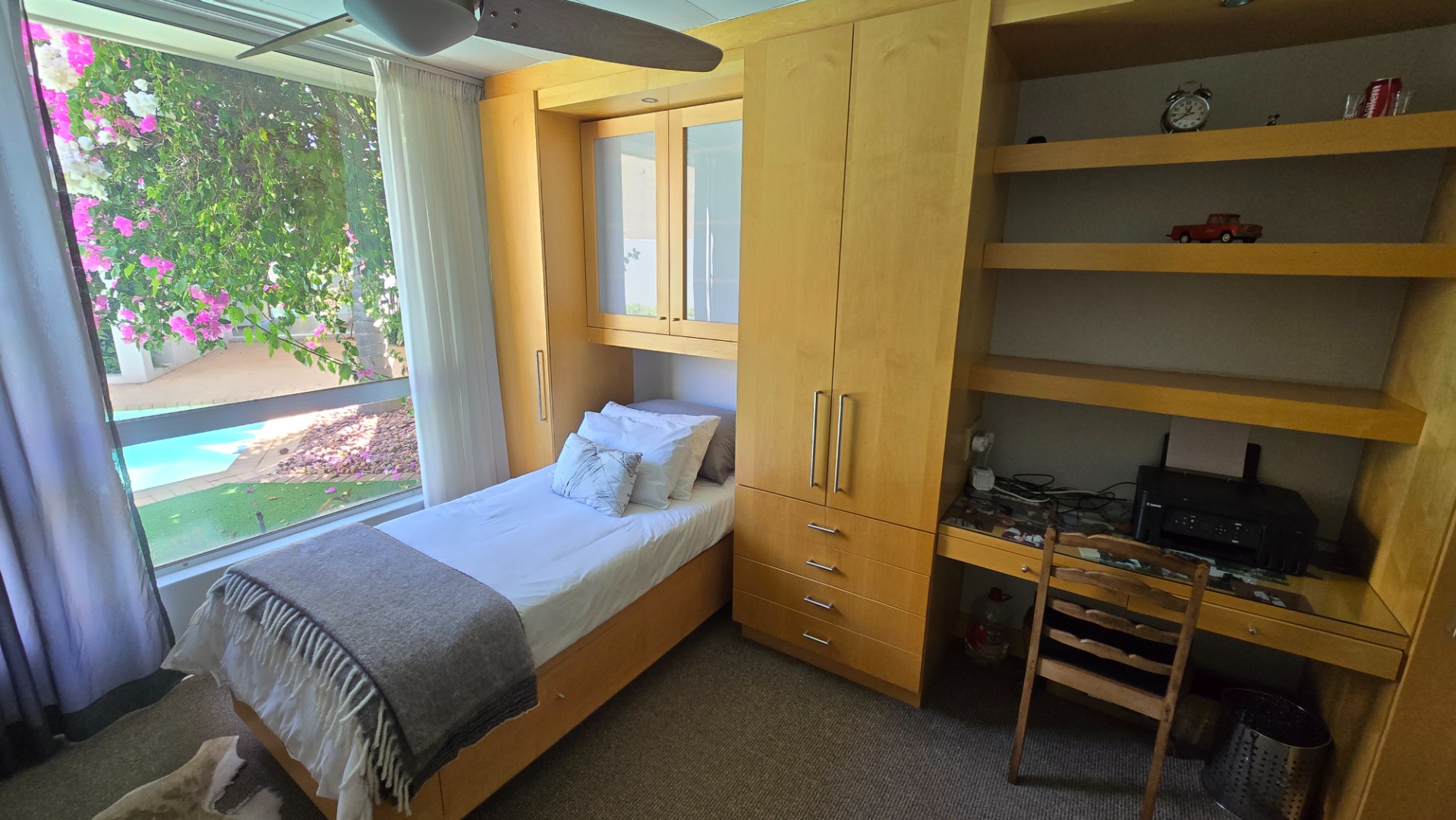 This property offers four well-appointed bedrooms and 2.5 bathrooms, including two en-suite, plus a dedicated study. Outside, a private oasis awaits with a sparkling swimming pool, lush tropical landscaping, and artificial turf. An expansive patio with a built-in braai and a balcony provide ideal entertaining spaces. Four garages, a well-maintained garden, and paved driveways complete the exterior.