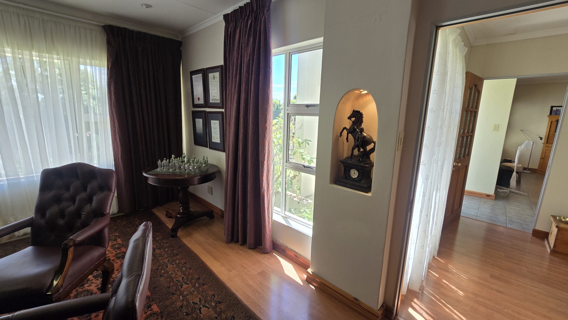 Security is paramount with an alarm system, access gate, burglar bars, and a totally walled perimeter. Enjoy year-round comfort with air conditioning and a fireplace, plus fibre connectivity, staff quarters, and a laundry area. Located in suburban Heuwelsig, this property promises a tranquil lifestyle within a well-established community.