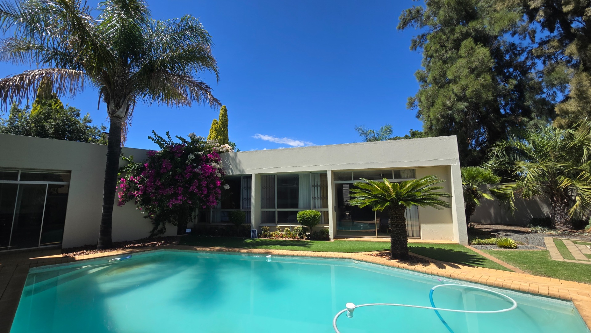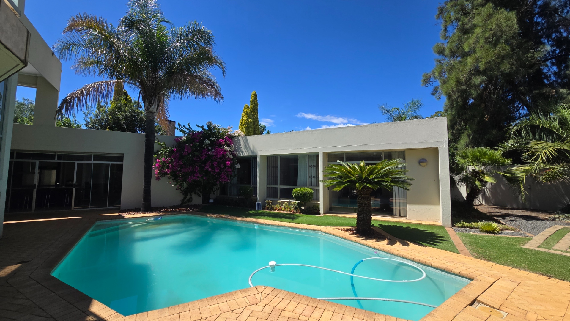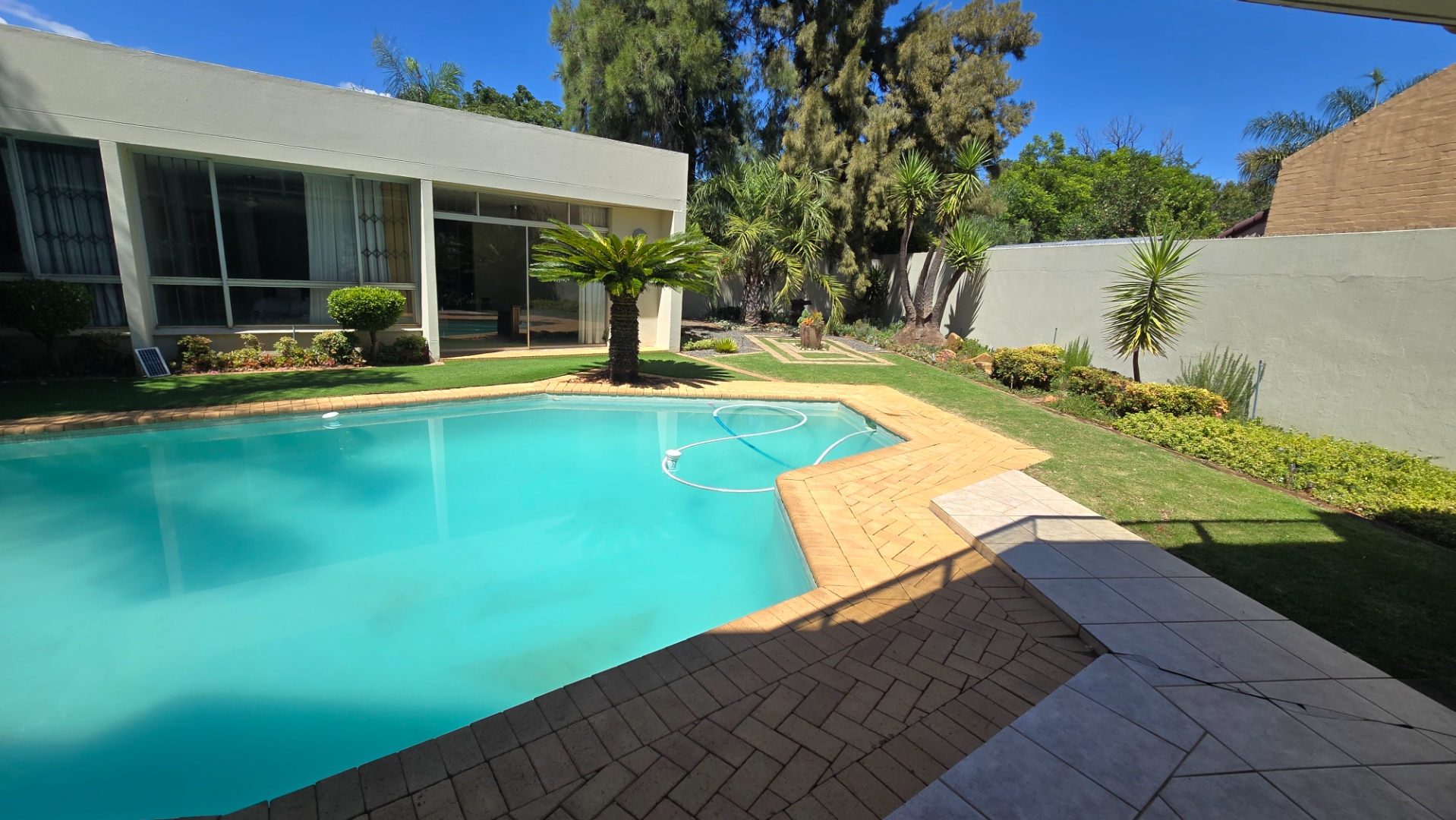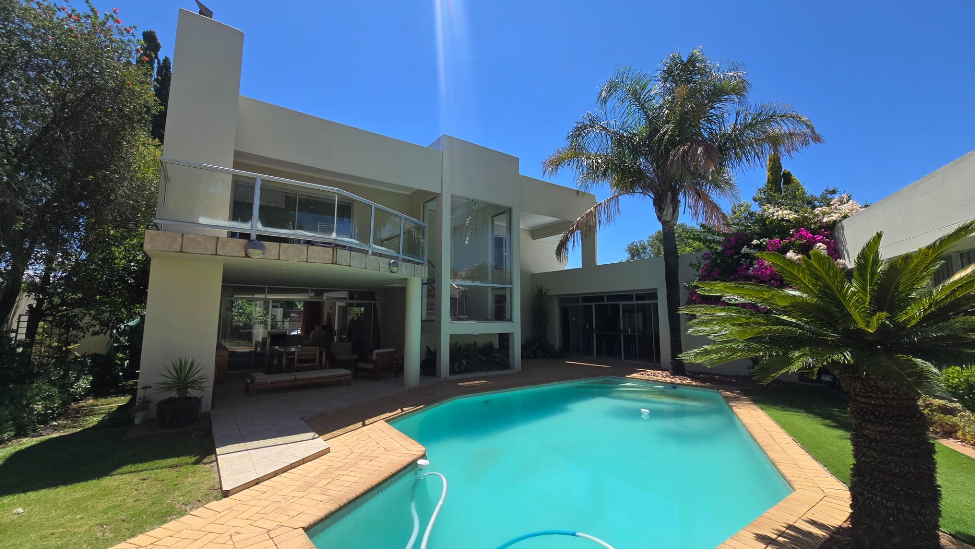 This property offers four well-appointed bedrooms and 2.5 bathrooms, including two en-suite, plus a dedicated study. Outside, a private oasis awaits with a sparkling swimming pool, lush tropical landscaping, and artificial turf. An expansive patio with a built-in braai and a balcony provide ideal entertaining spaces. Four garages, a well-maintained garden, and paved driveways complete the exterior.
