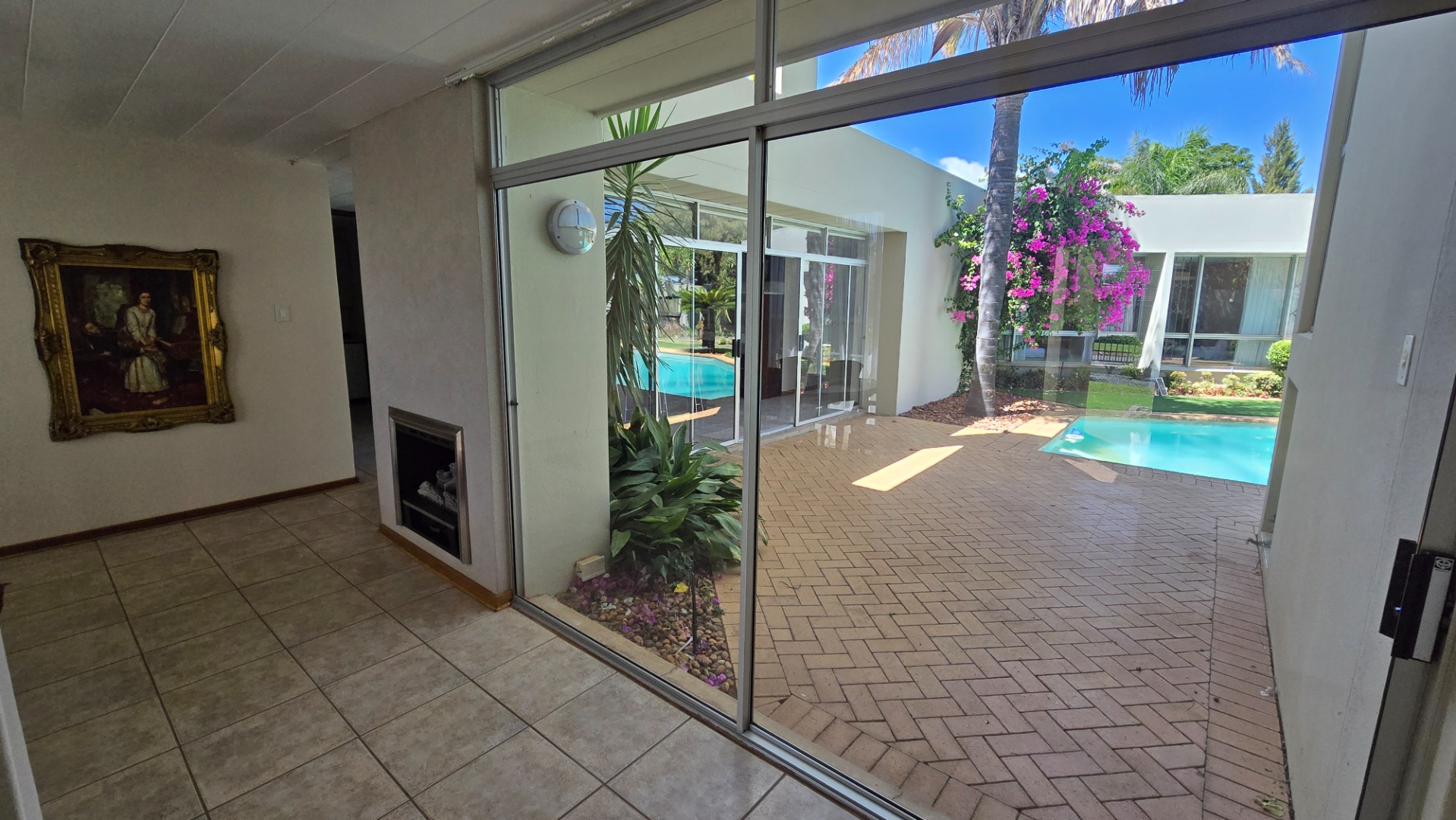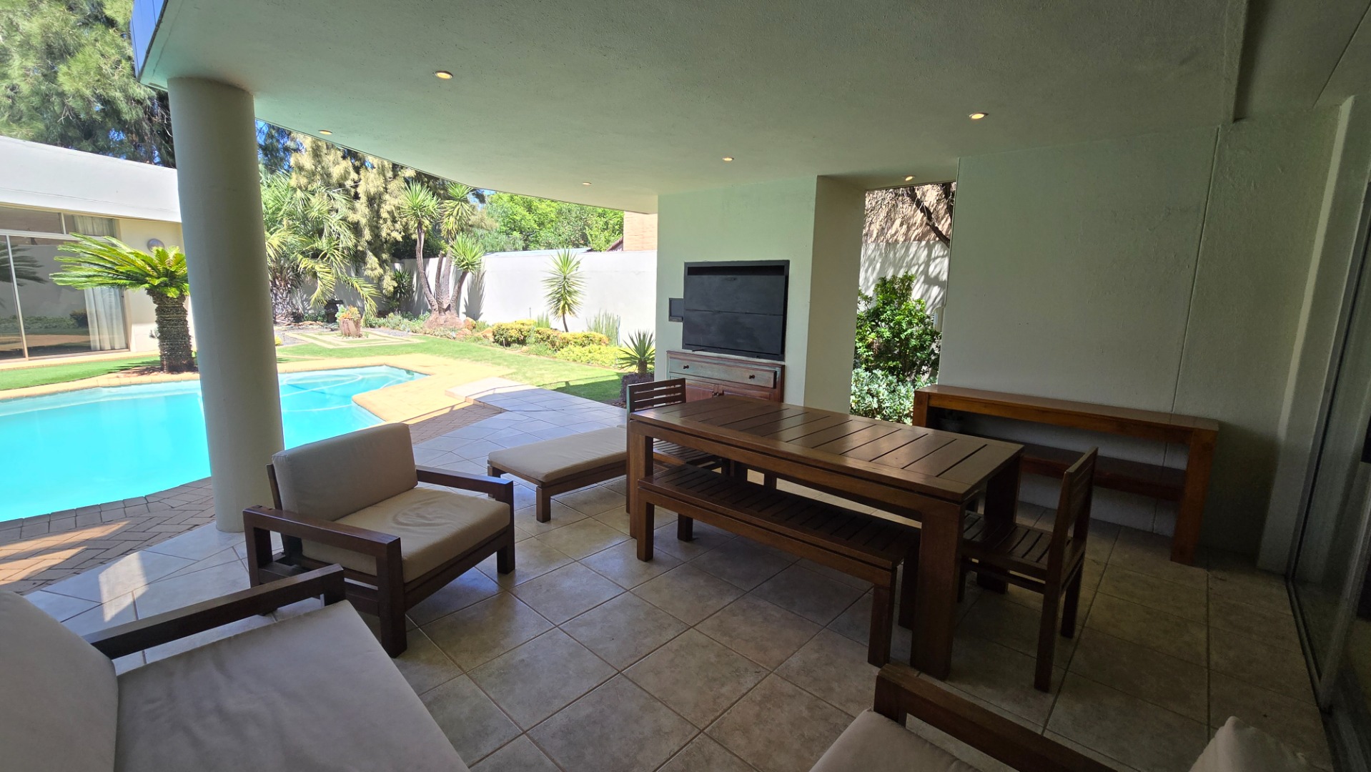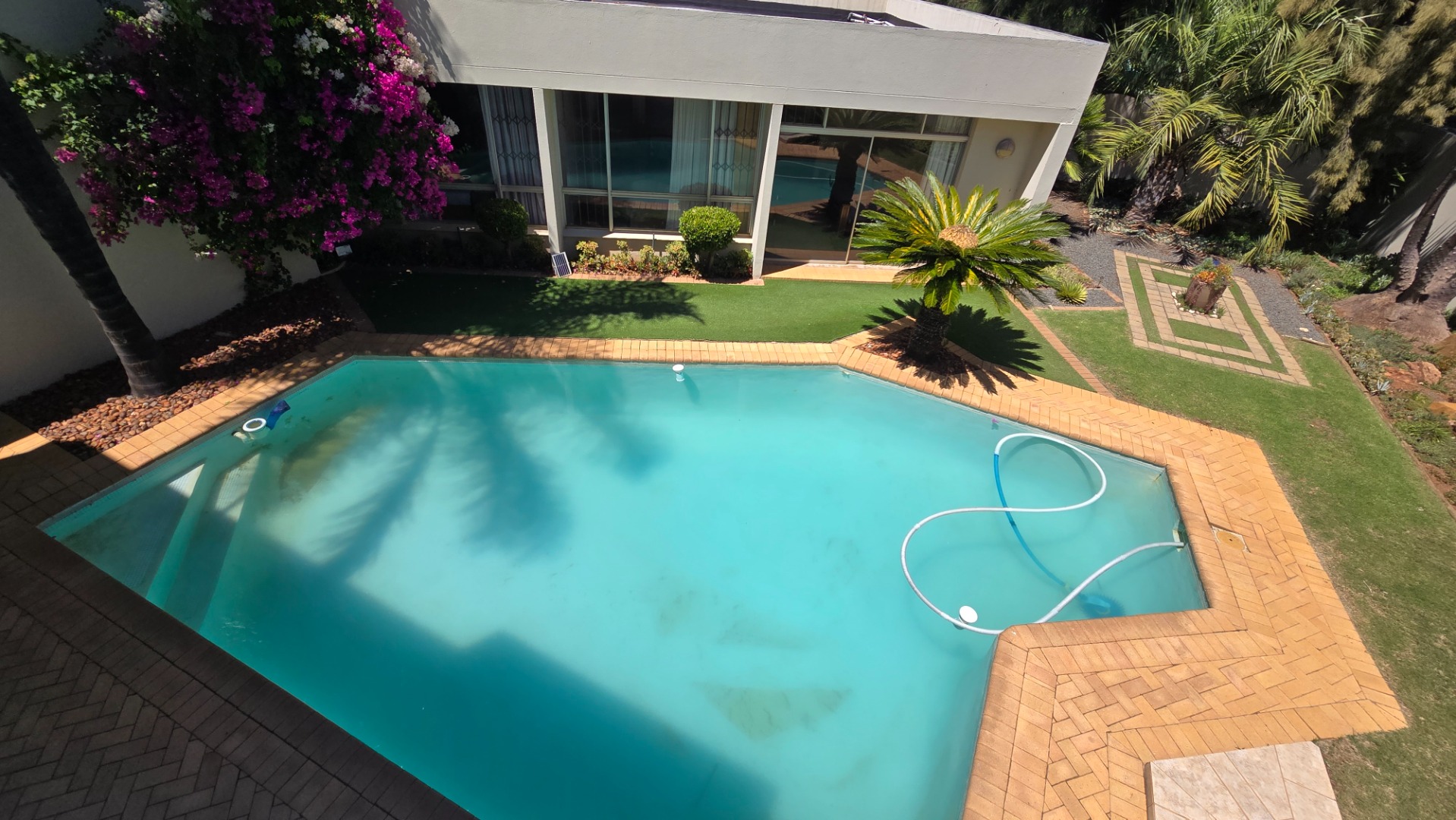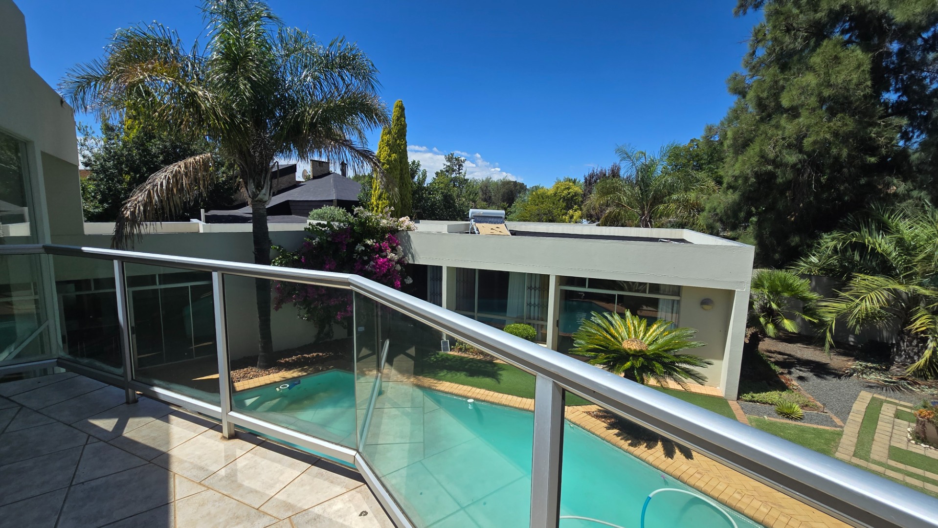 This property offers four well-appointed bedrooms and 2.5 bathrooms, including two en-suite, plus a dedicated study. Outside, a private oasis awaits with a sparkling swimming pool, lush tropical landscaping, and artificial turf. An expansive patio with a built-in braai and a balcony provide ideal entertaining spaces. Four garages, a well-maintained garden, and paved driveways complete the exterior.