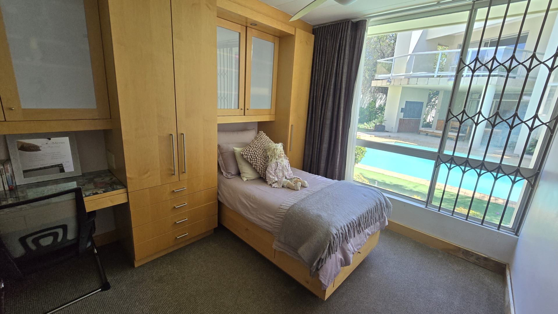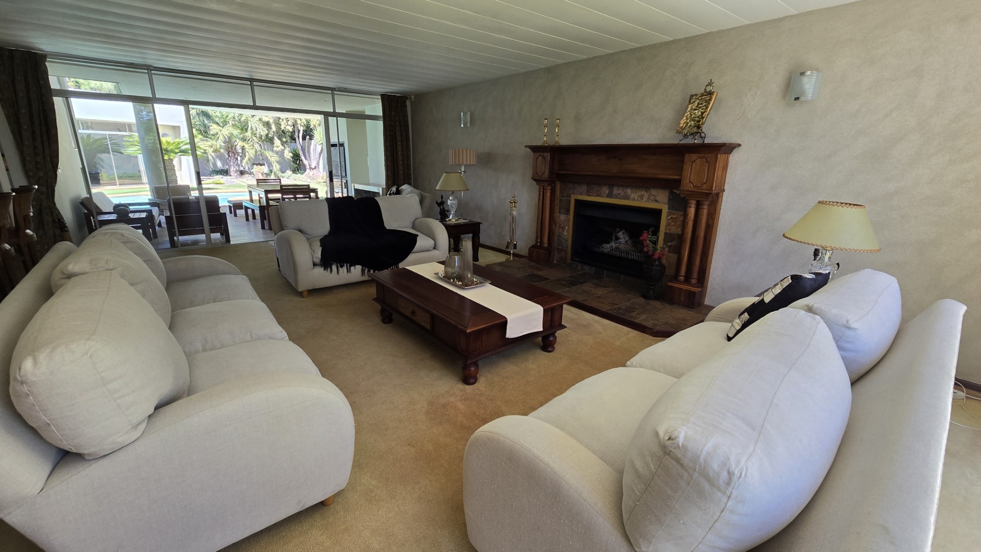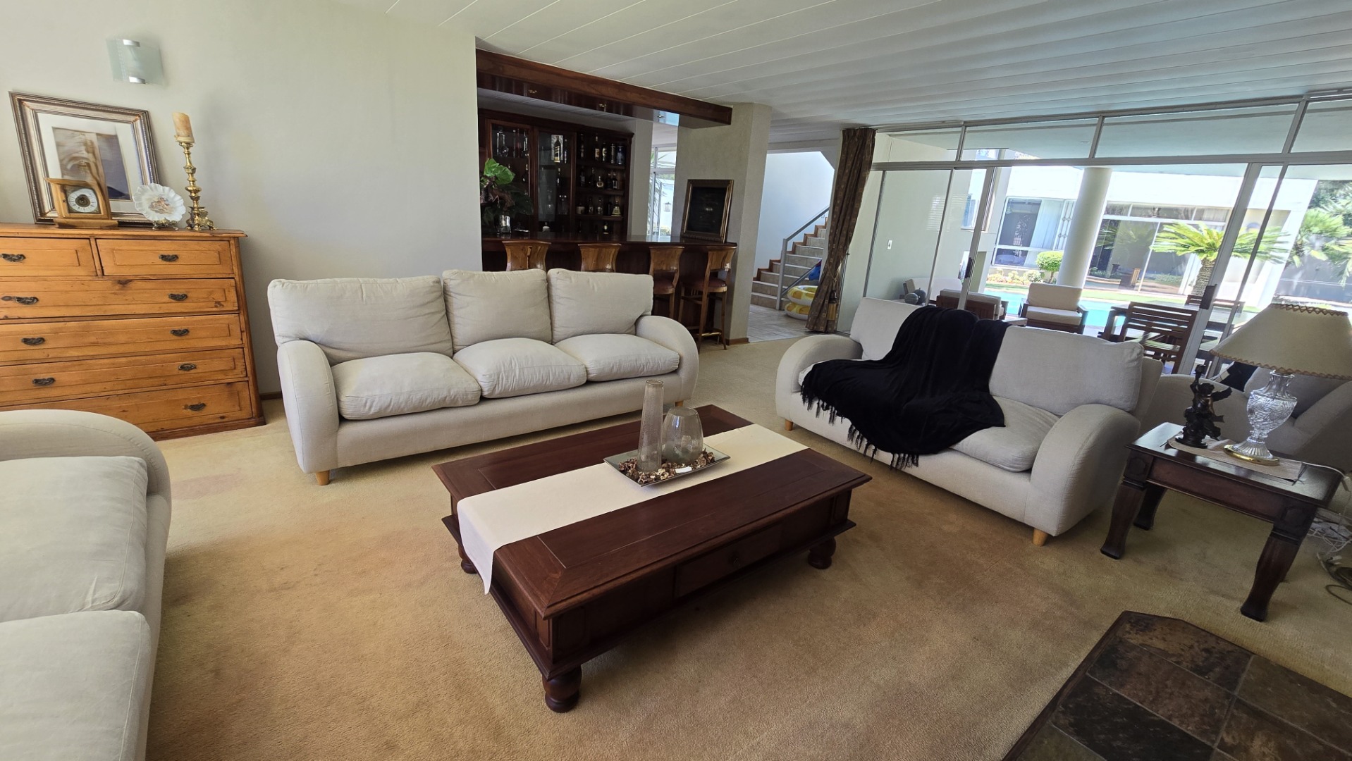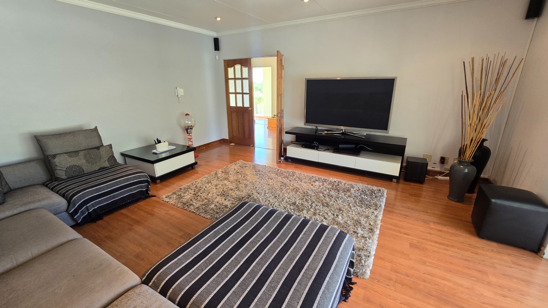 This property offers four well-appointed bedrooms and 2.5 bathrooms, including two en-suite, plus a dedicated study. Outside, a private oasis awaits with a sparkling swimming pool, lush tropical landscaping, and artificial turf. An expansive patio with a built-in braai and a balcony provide ideal entertaining spaces. Four garages, a well-maintained garden, and paved driveways complete the exterior.