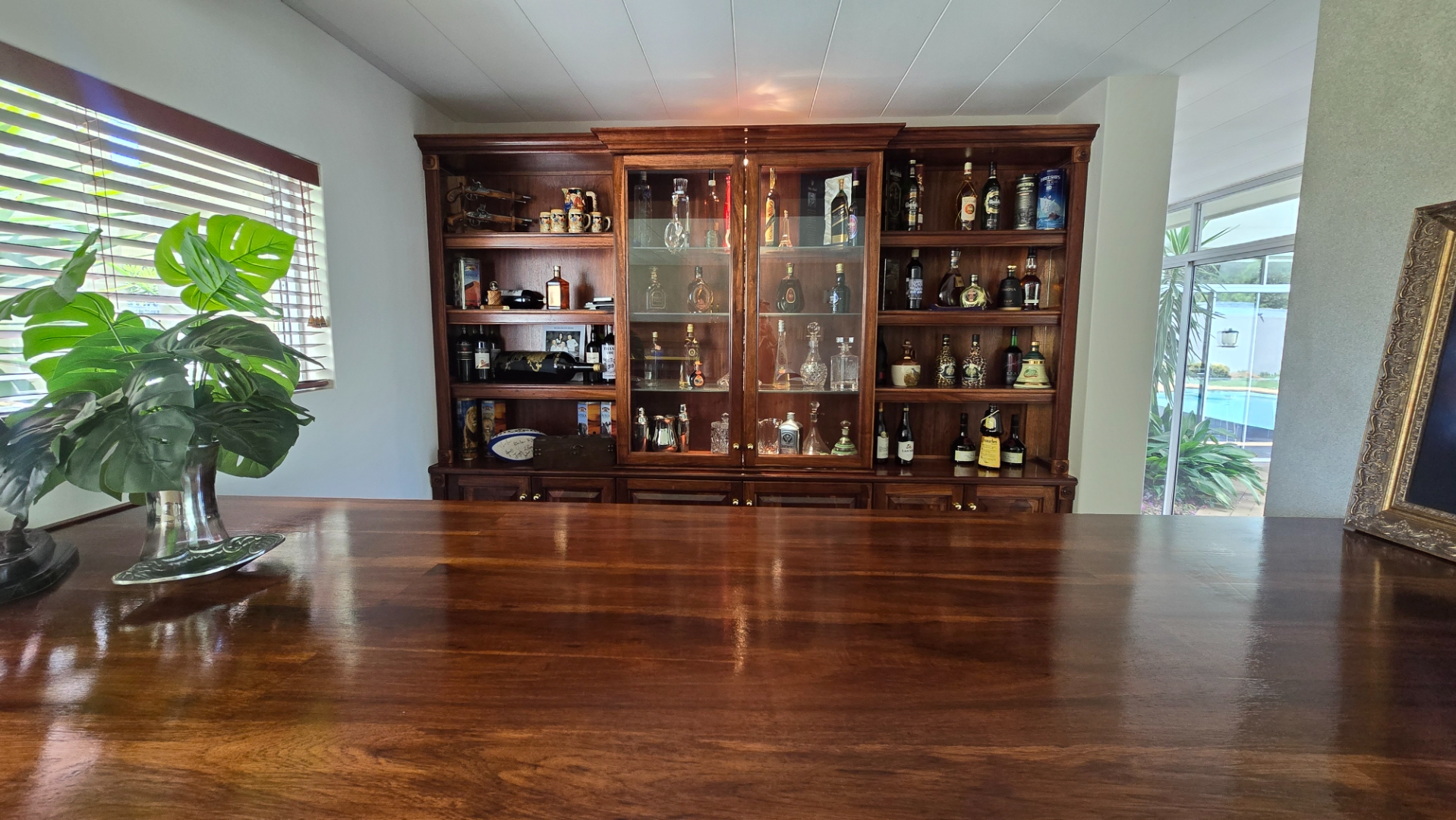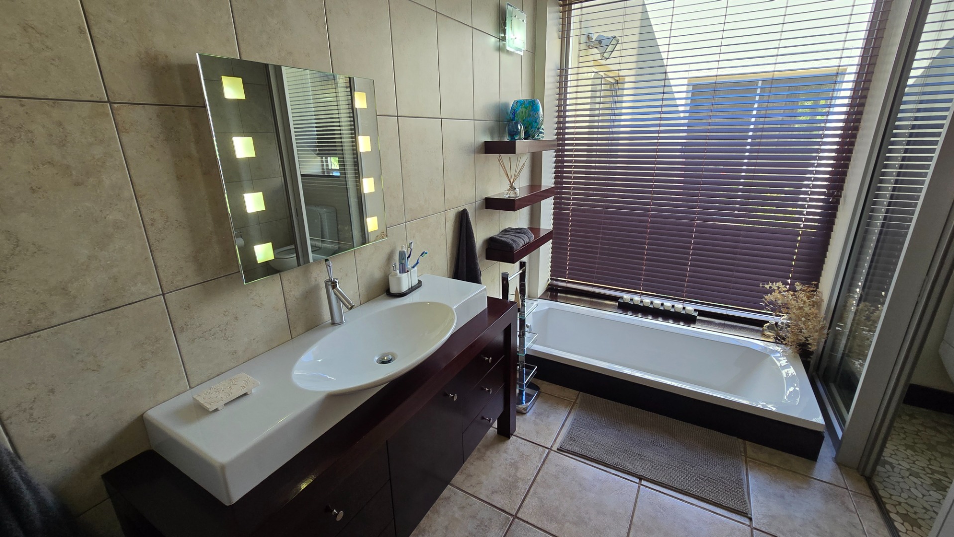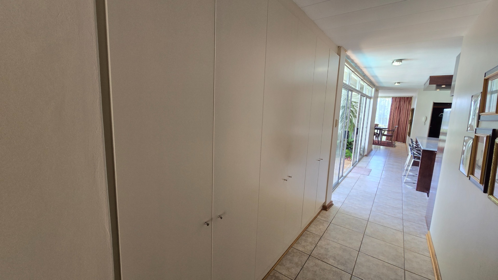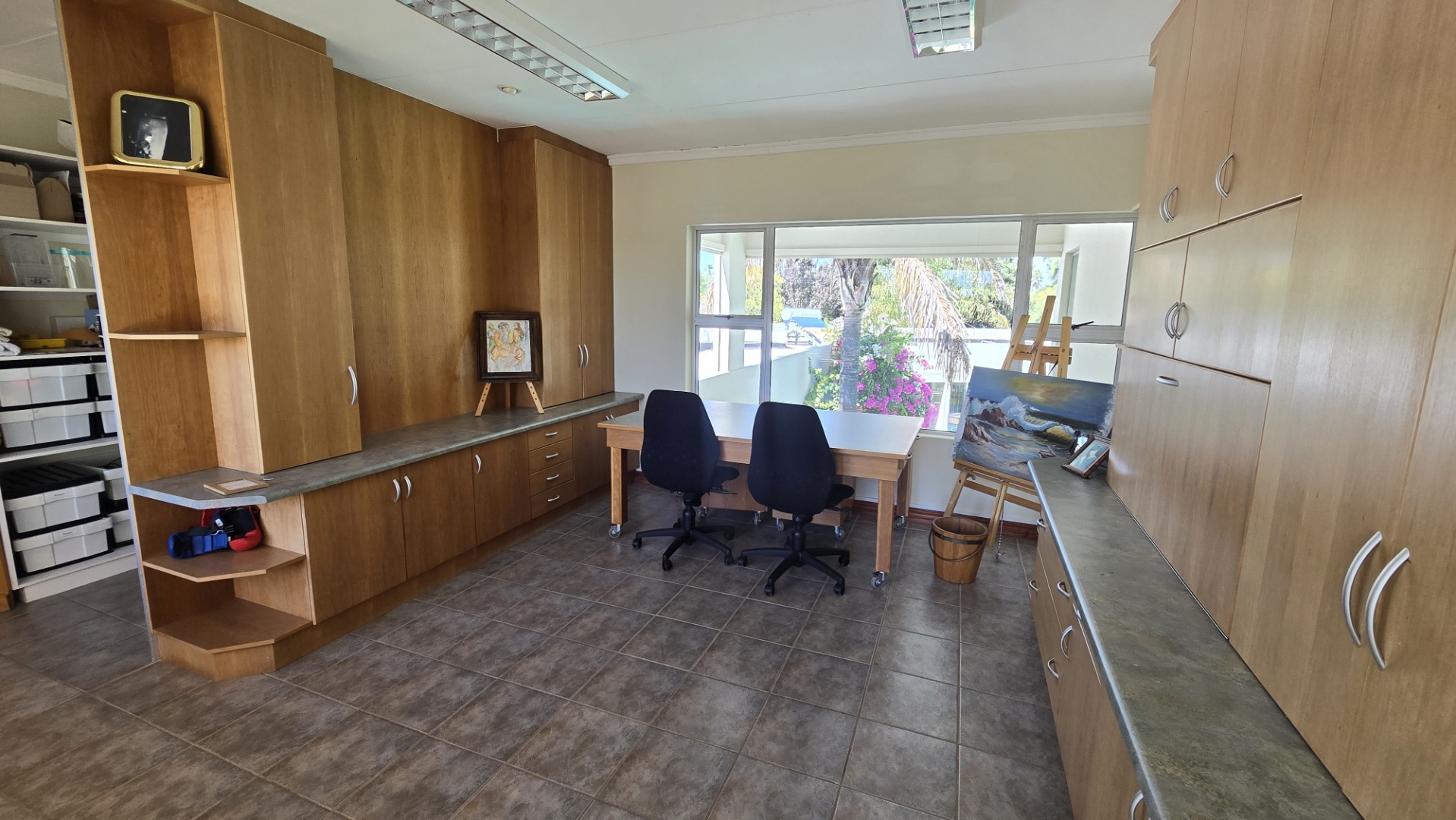 This property offers four well-appointed bedrooms and 2.5 bathrooms, including two en-suite, plus a dedicated study. Outside, a private oasis awaits with a sparkling swimming pool, lush tropical landscaping, and artificial turf. An expansive patio with a built-in braai and a balcony provide ideal entertaining spaces. Four garages, a well-maintained garden, and paved driveways complete the exterior.