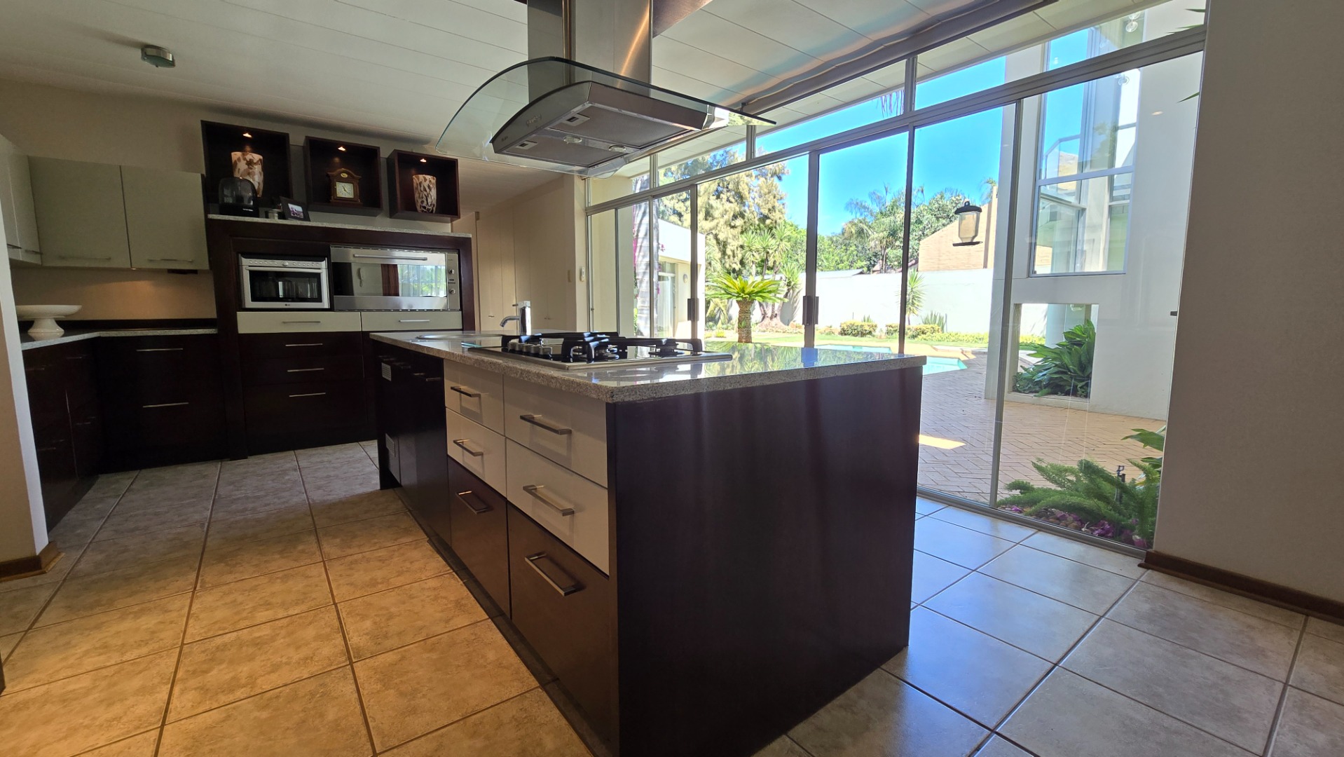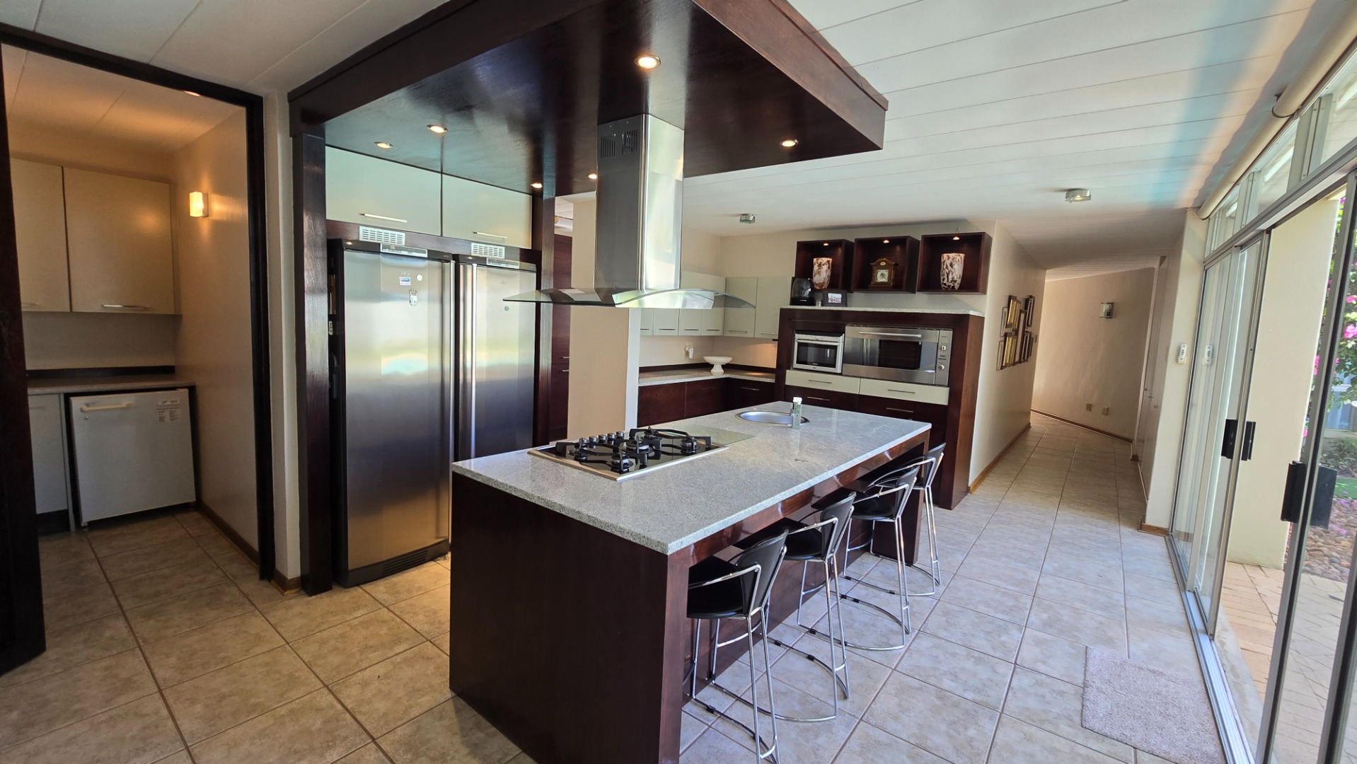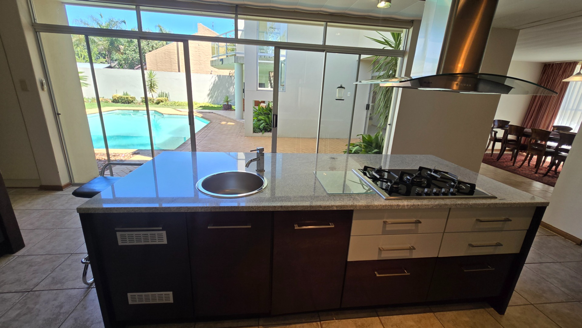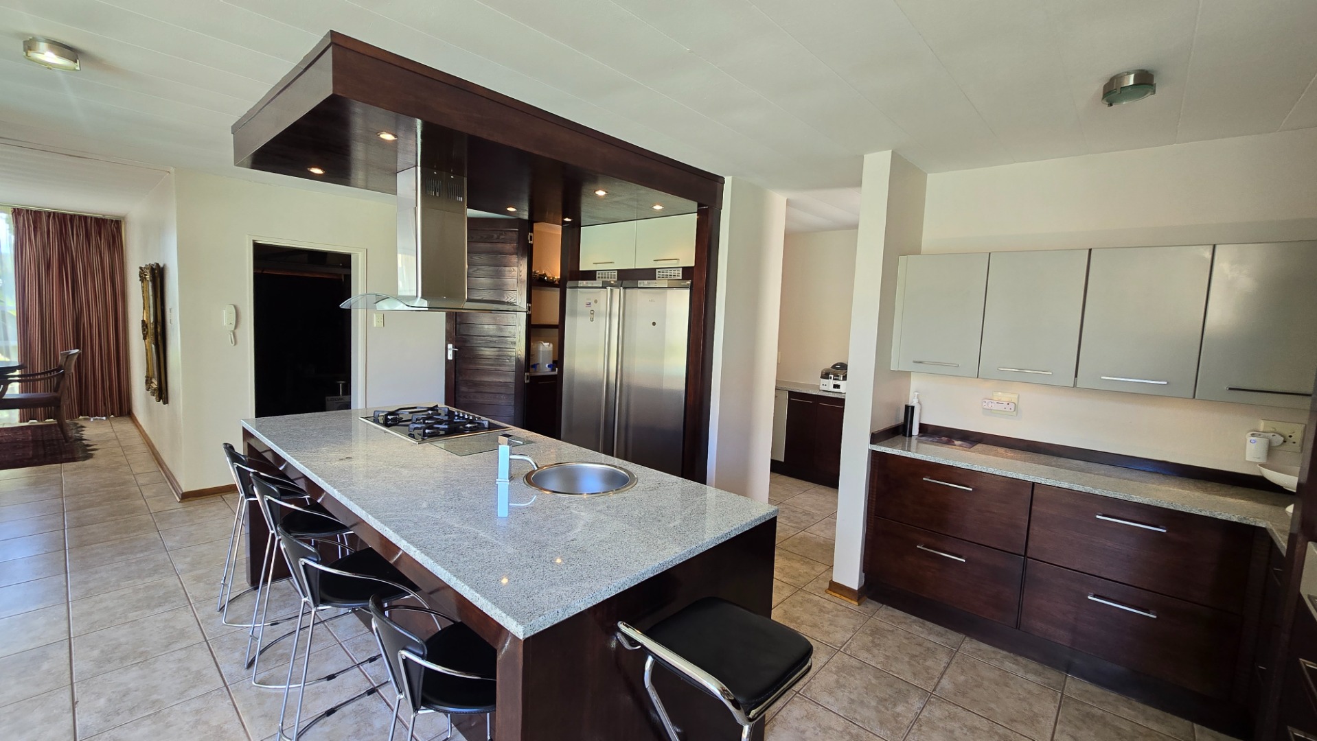 Discover this modern, multi-story residence in Heuwelsig, Bloemfontein, offering an expansive 571 sqm of living space on a generous 1670 sqm erf. The home features an inviting entrance hall, two spacious lounges, and a dedicated dining area, all designed with an open-plan flow. The contemporary kitchen is a highlight, boasting a large island with an integrated gas hob, sleek stainless steel appliances, ample two-tone cabinetry, and a convenient pantry.