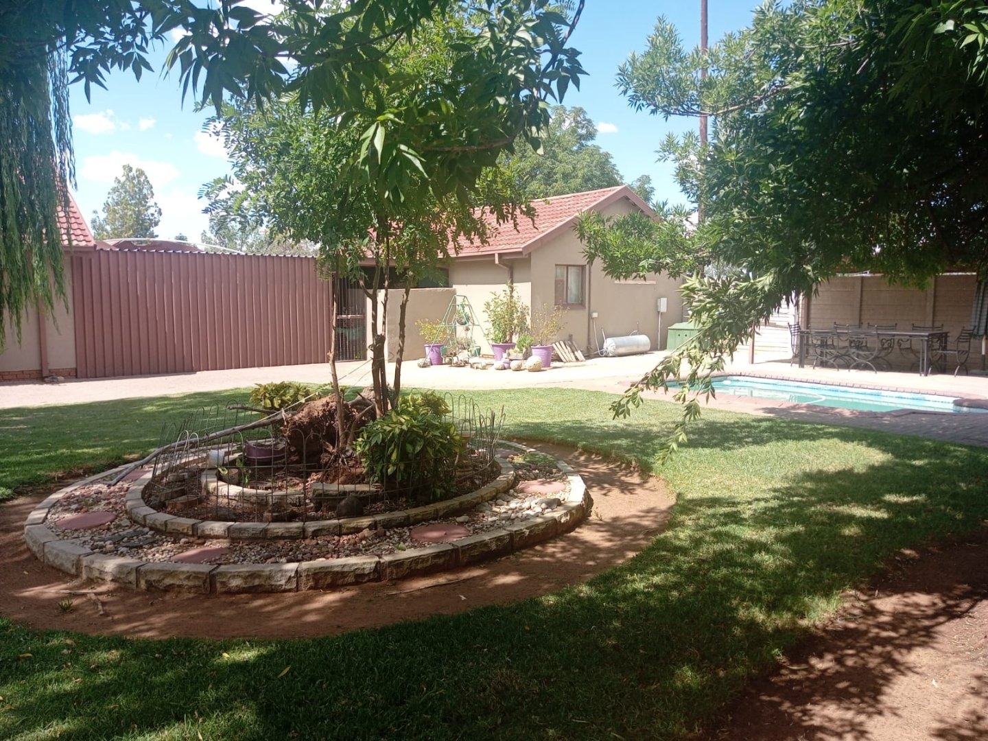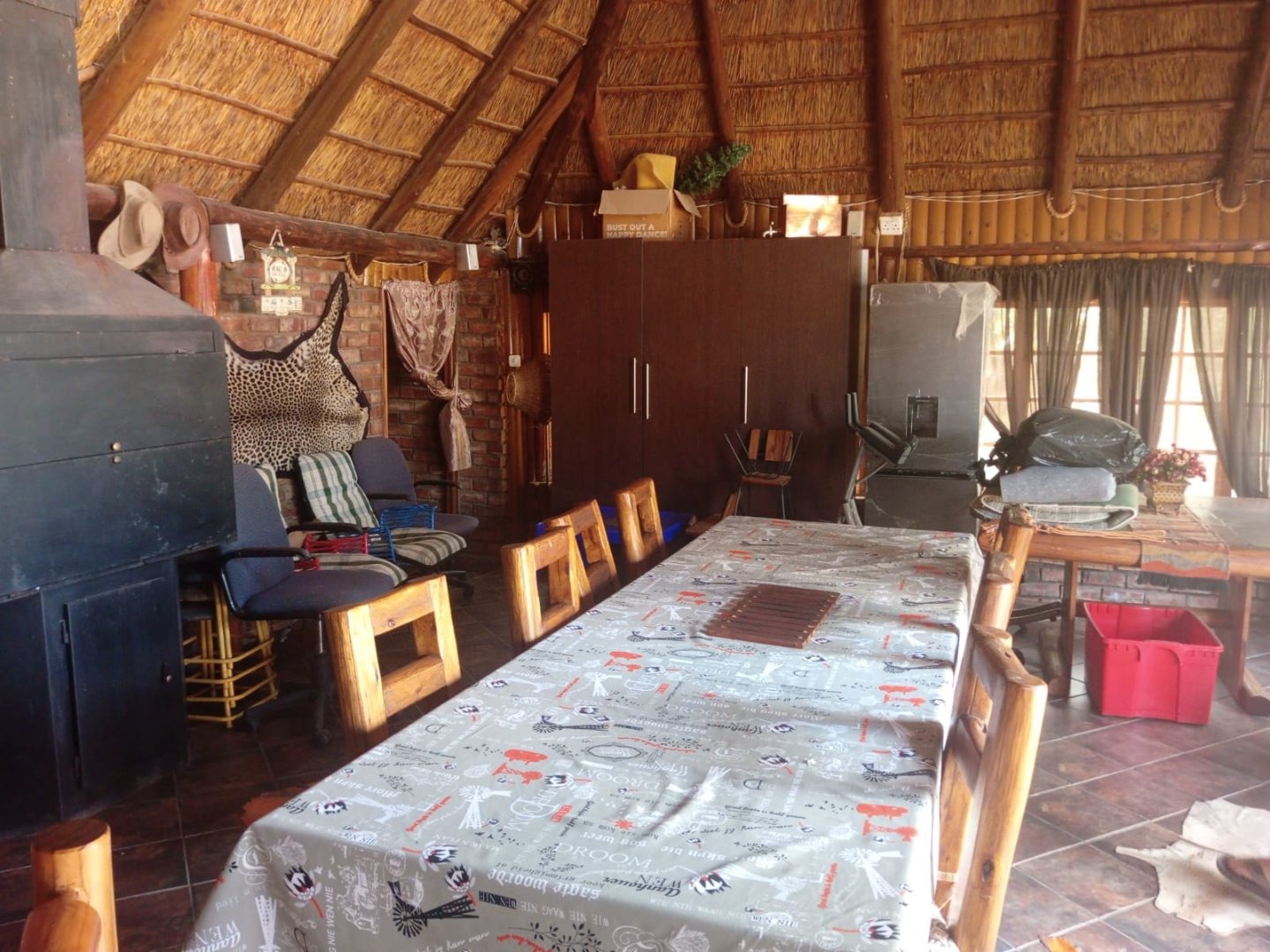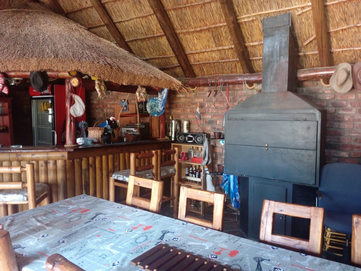 Outdoor features include a thatched Lapa with built-in braai and toilet, swimming pool with covered seating area, and secure lock-up undercover parking.