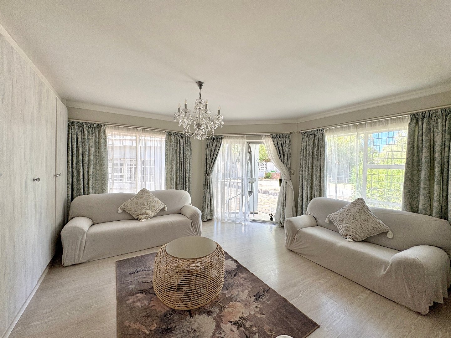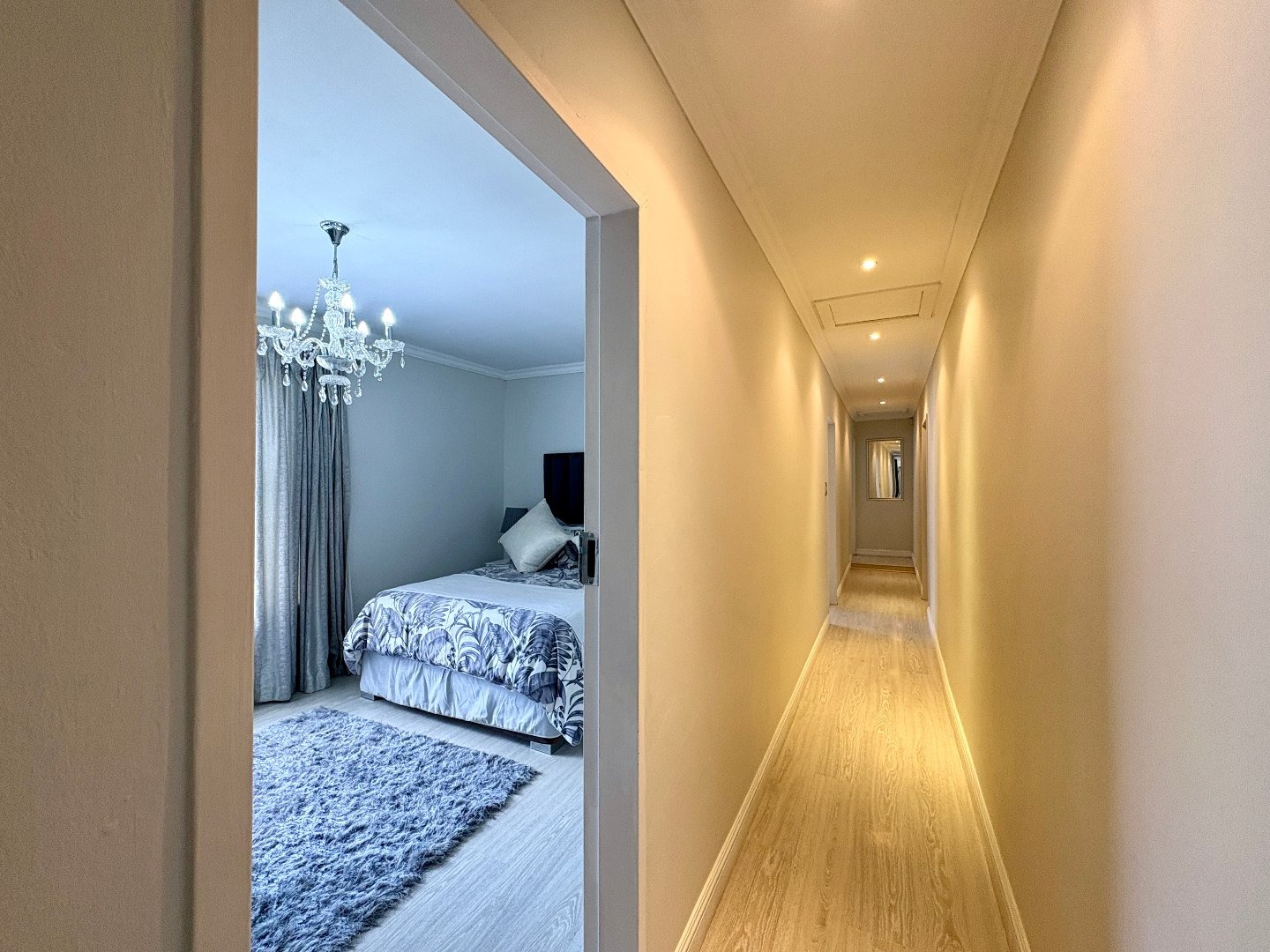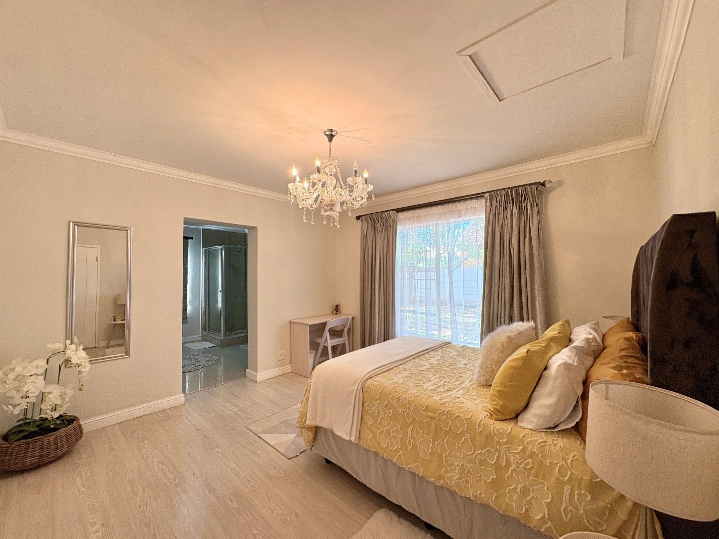 The home features four spacious bedrooms, all fitted with laminated flooring and built-in cupboards. There are three modern bathrooms, two of which are en-suite. The main bedroom enjoys a full en-suite bathroom, while the second en-suite includes a shower, toilet, and basin. A third full bathroom with a lovely bath serves the remaining bedrooms.