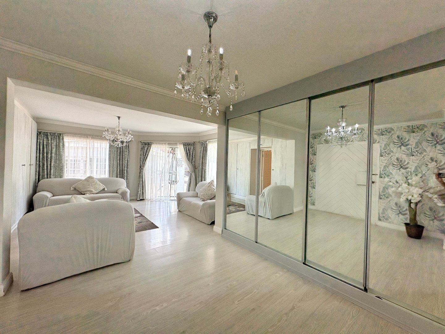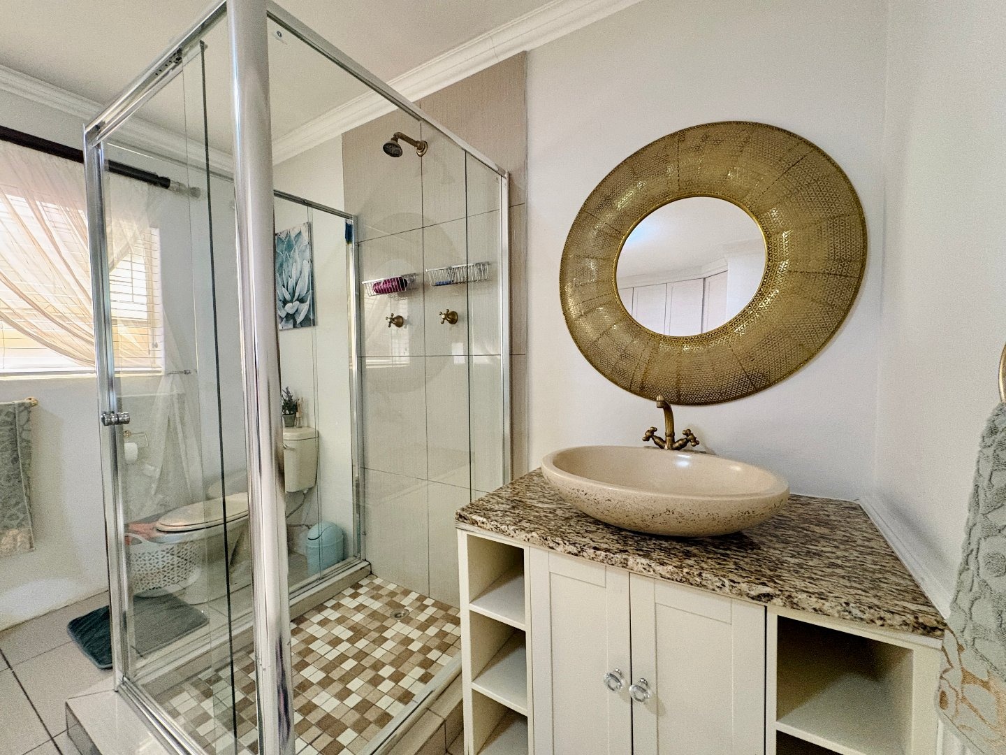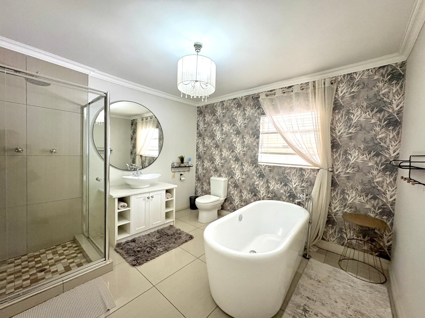 The home features four spacious bedrooms, all fitted with laminated flooring and built-in cupboards. There are three modern bathrooms, two of which are en-suite. The main bedroom enjoys a full en-suite bathroom, while the second en-suite includes a shower, toilet, and basin. A third full bathroom with a lovely bath serves the remaining bedrooms.