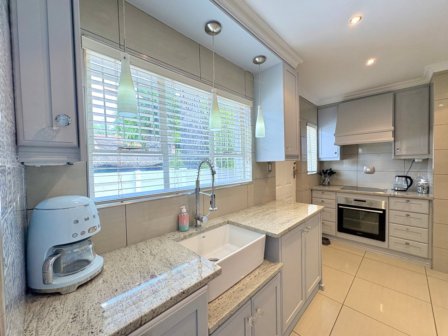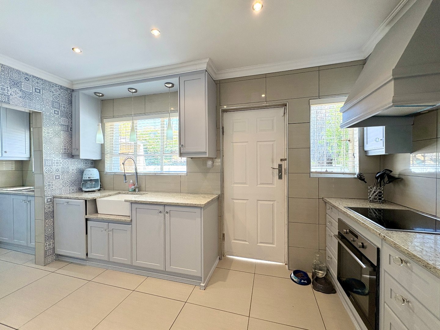 The modern kitchen is designed for both practicality and style, offering granite countertops, ample built-in cupboards, and a separate pantry, making it ideal for family living.