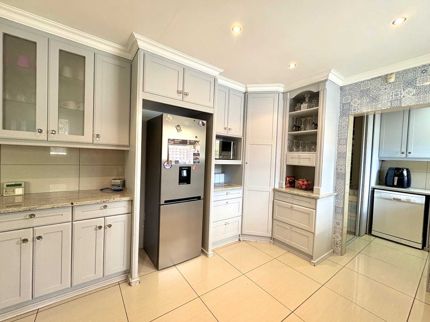 The modern kitchen is designed for both practicality and style, offering granite countertops, ample built-in cupboards, and a separate pantry, making it ideal for family living.