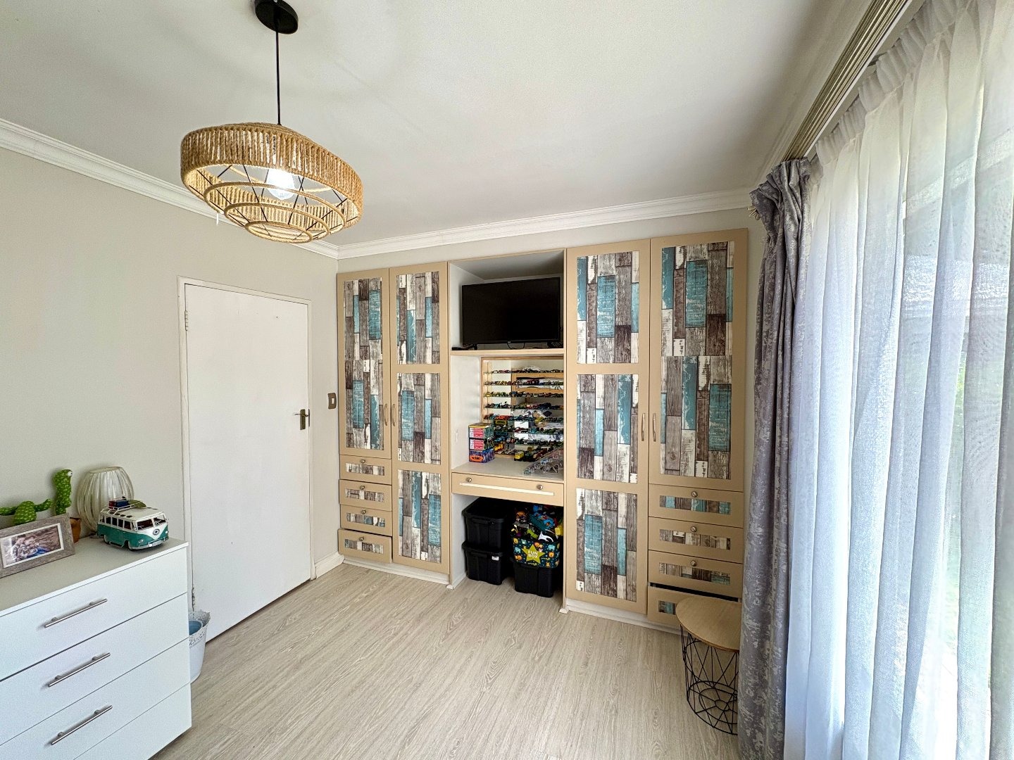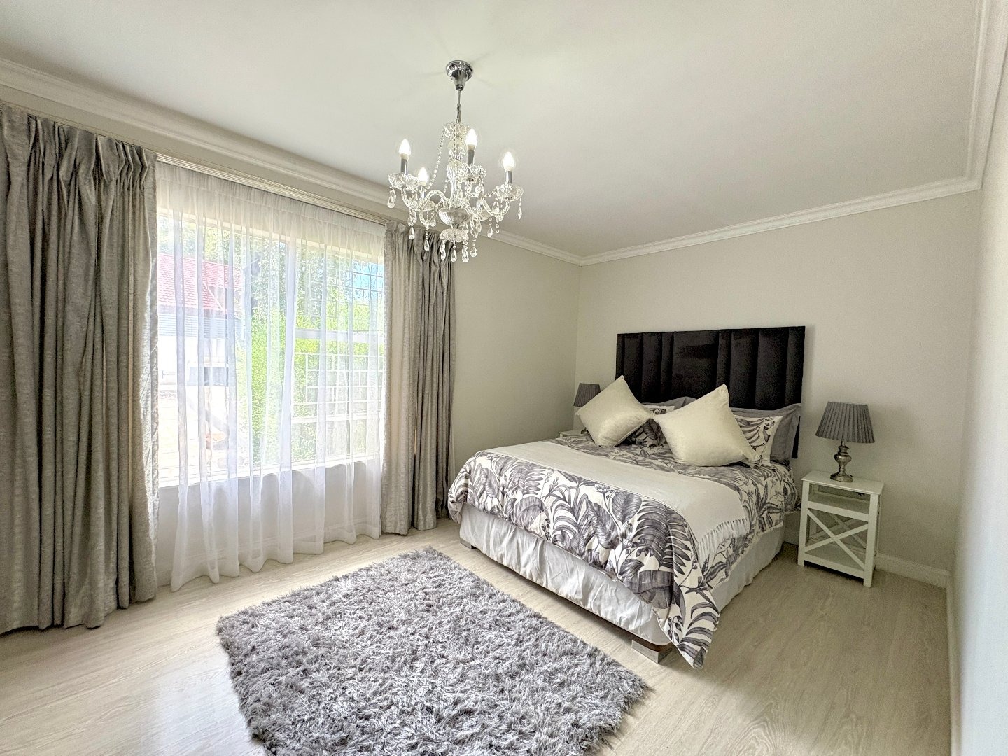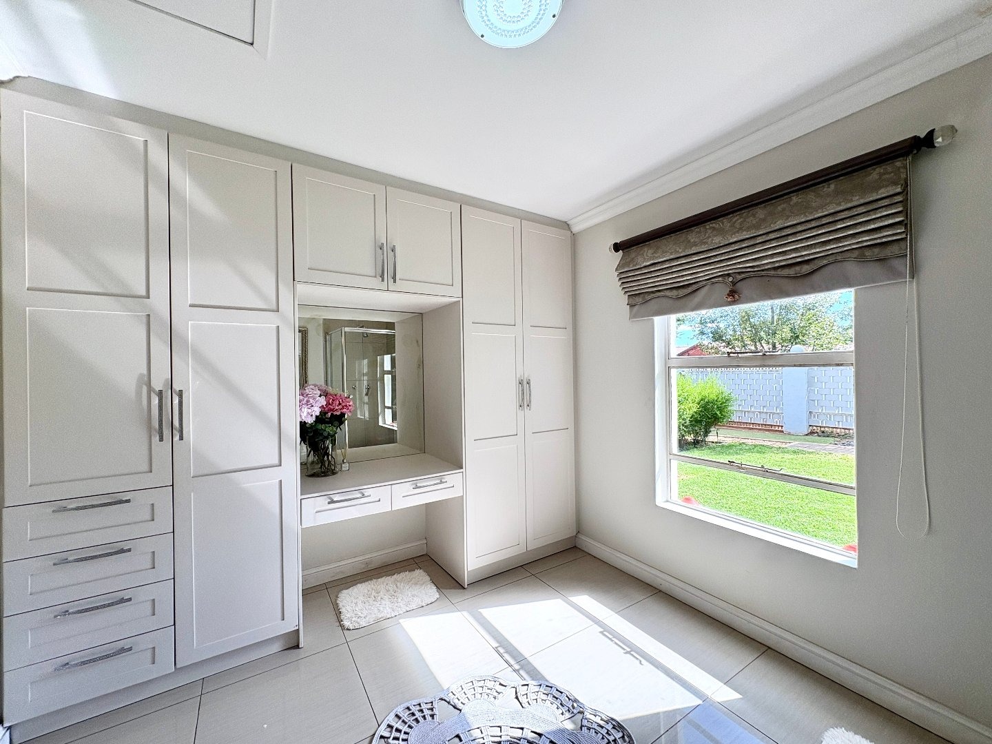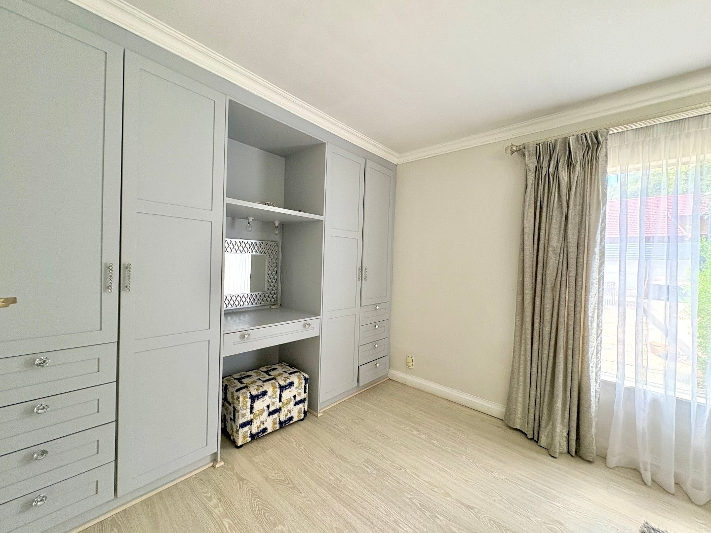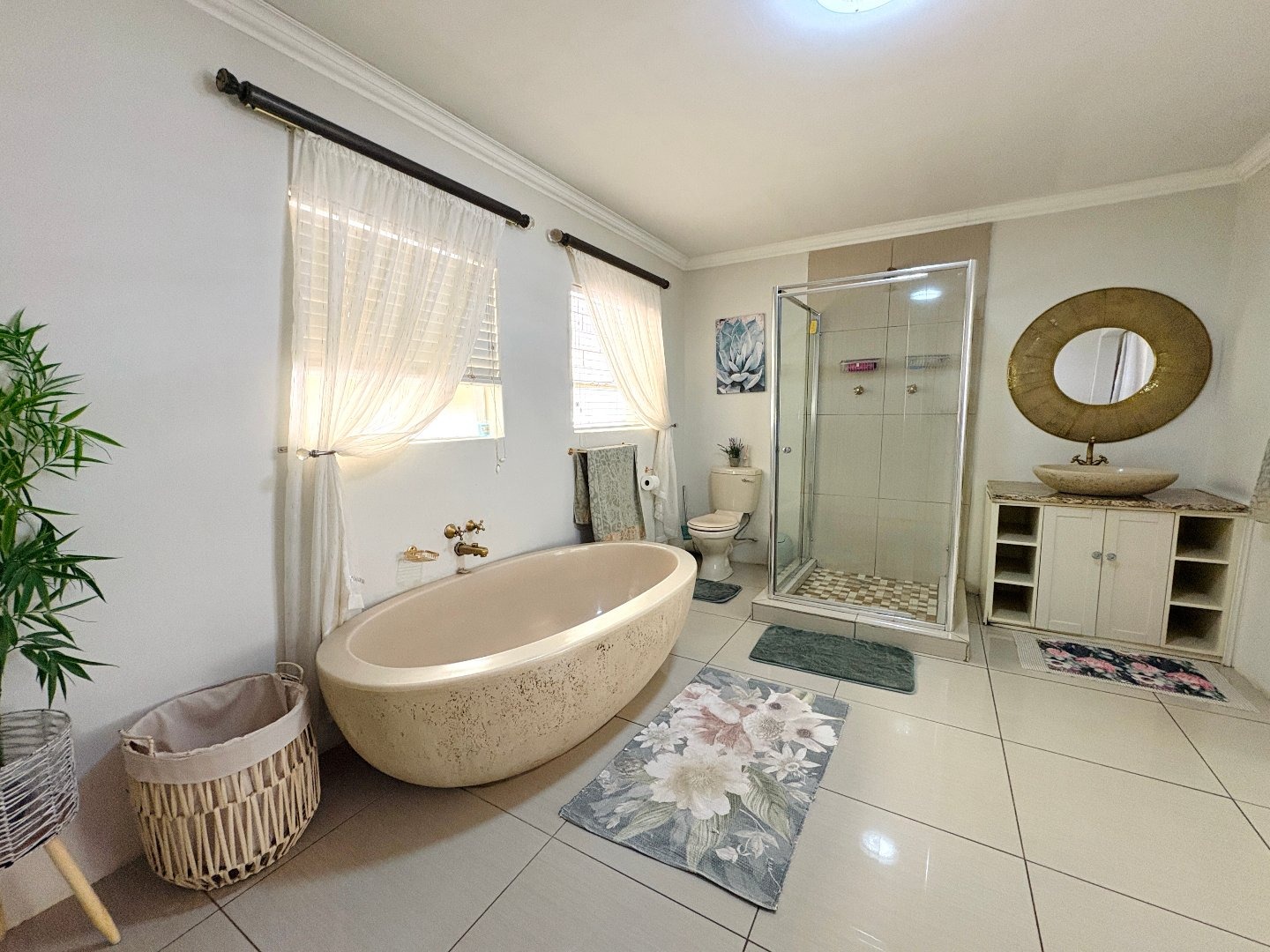 The home features four spacious bedrooms, all fitted with laminated flooring and built-in cupboards. There are three modern bathrooms, two of which are en-suite. The main bedroom enjoys a full en-suite bathroom, while the second en-suite includes a shower, toilet, and basin. A third full bathroom with a lovely bath serves the remaining bedrooms.