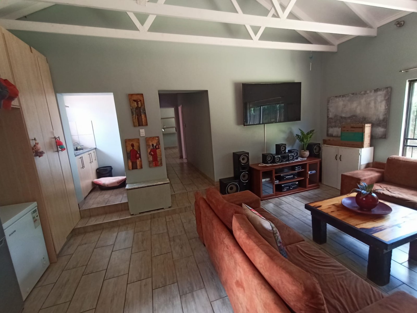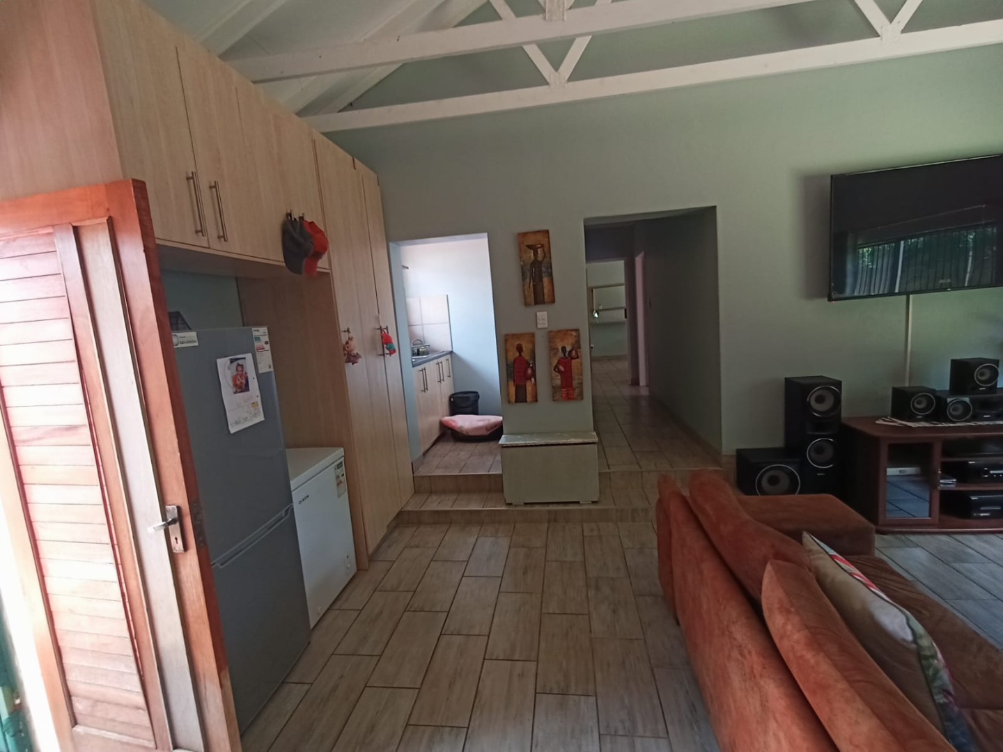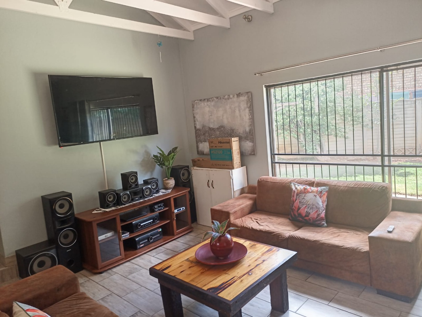 Spanning 110 sqm on a 627 sqm erf, this residence features an open-plan layout with high vaulted ceilings and exposed trusses, enhancing the sense of space. The modern kitchen boasts light wood cabinetry, dark countertops, and build-in stove, flowing seamlessly into the dining and lounge areas. Enjoy comfortable living with tiled flooring throughout and a dedicated entertainment setup. Security bars on windows provide peace of mind.