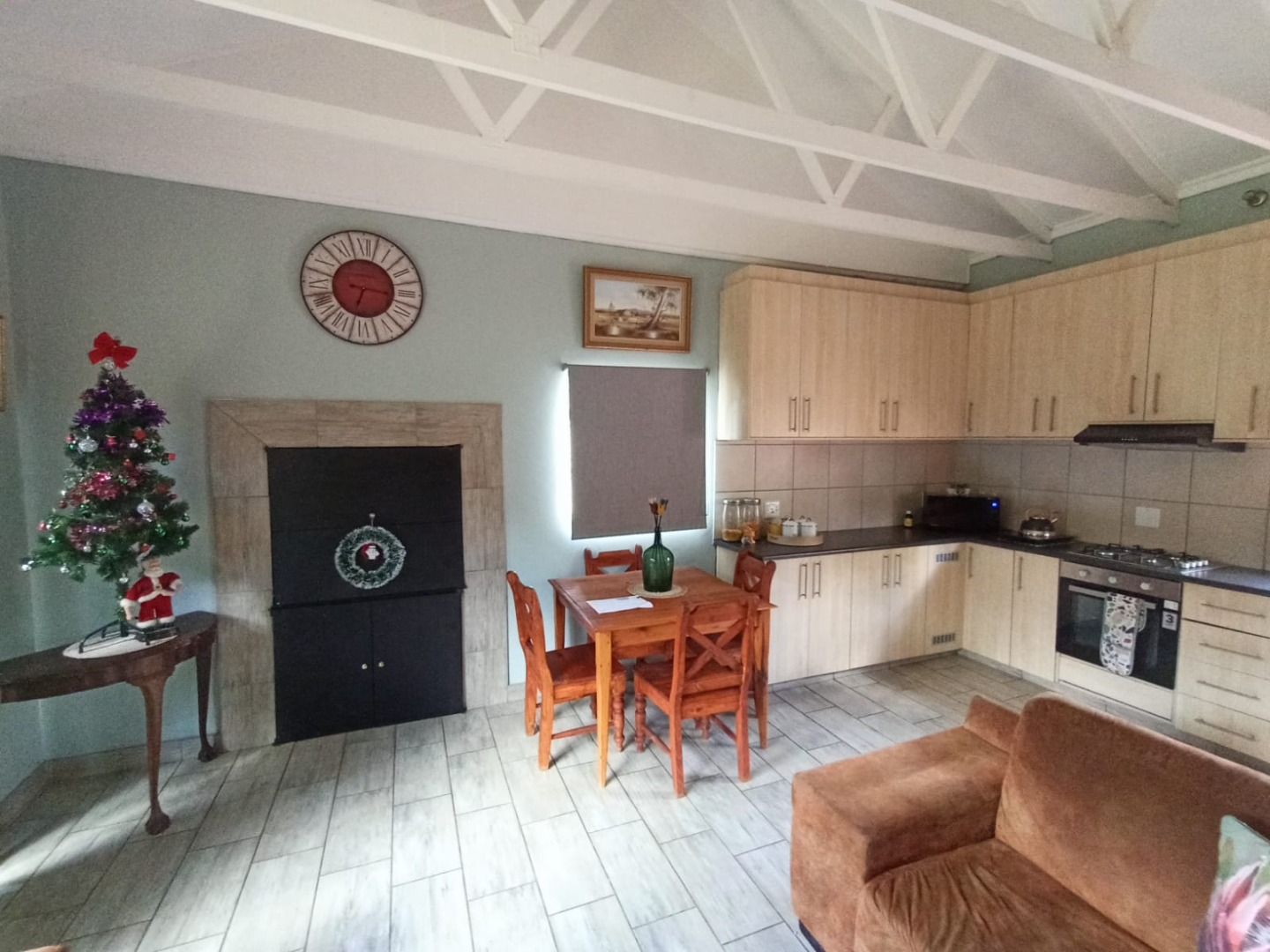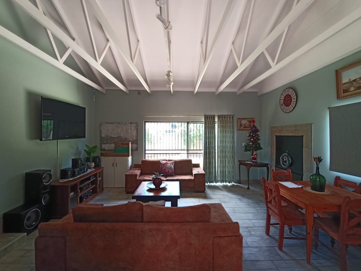 Spanning 110 sqm on a 627 sqm erf, this residence features an open-plan layout with high vaulted ceilings and exposed trusses, enhancing the sense of space. The modern kitchen boasts light wood cabinetry, dark countertops, and build-in stove, flowing seamlessly into the dining and lounge areas. Enjoy comfortable living with tiled flooring throughout and a dedicated entertainment setup. Security bars on windows provide peace of mind.