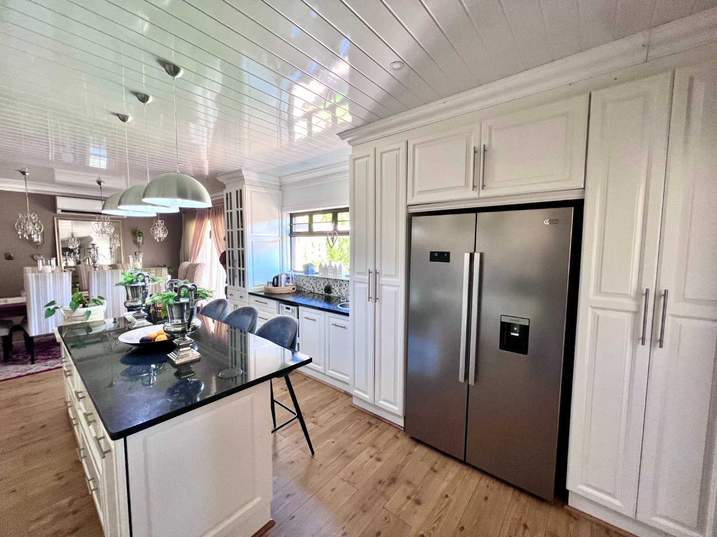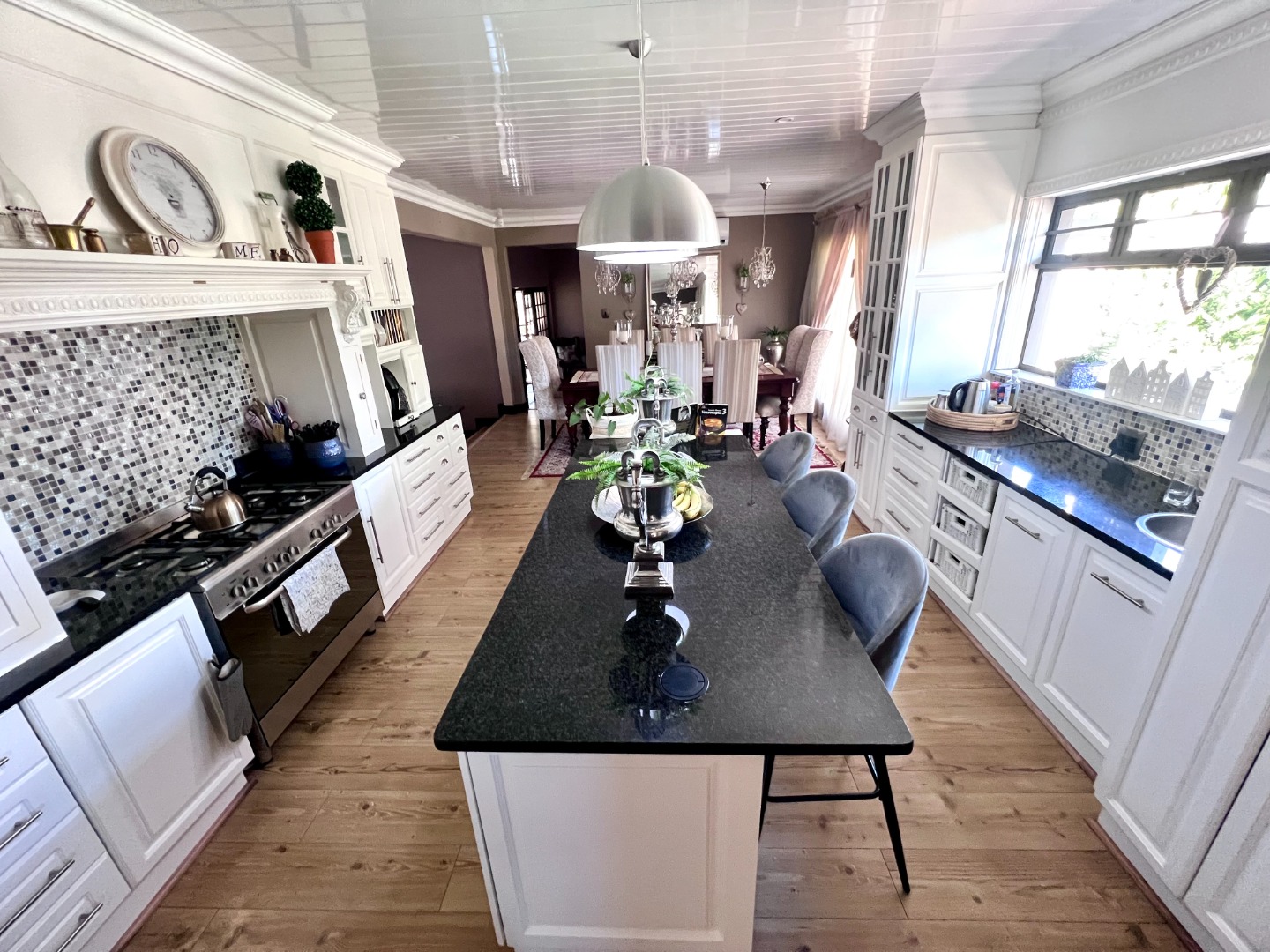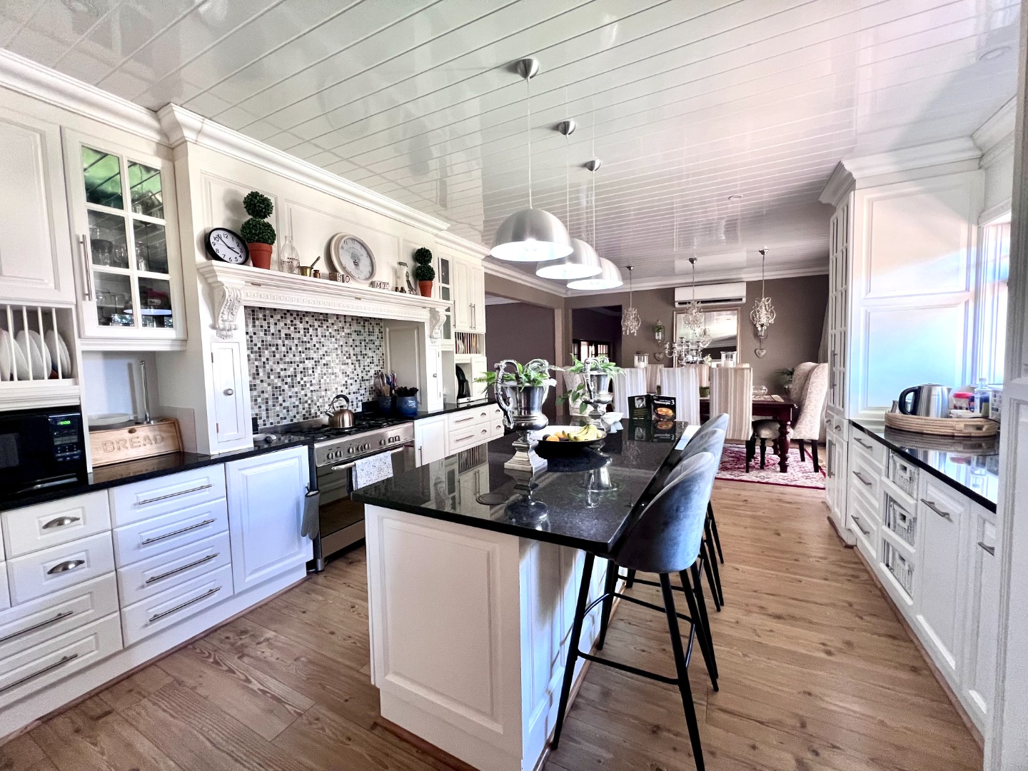 This immaculate 3/4 -bedroom residence offers sophisticated living with beautiful modern finishes throughout. The stylish kitchen features granite countertops, a central island, and a separate scullery — perfect for any home chef. An elegant dining area with a chandelier flows seamlessly into spacious living and TV rooms, complete with a cozy fireplace and air-conditioning for year-round comfort.