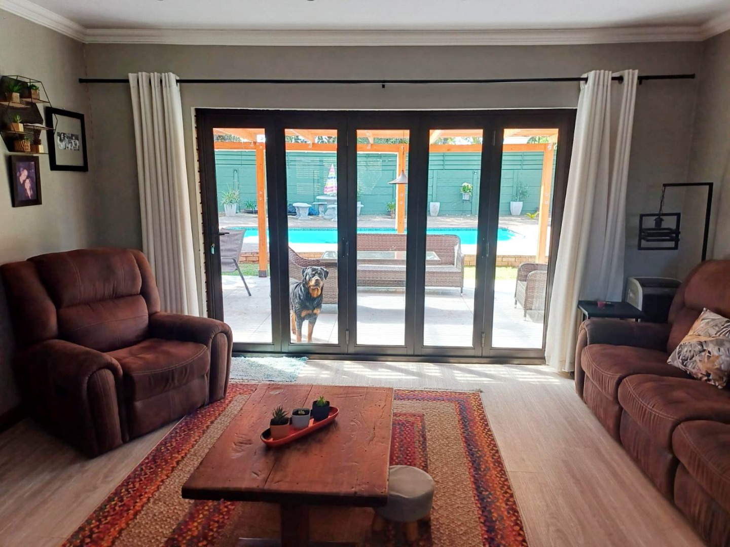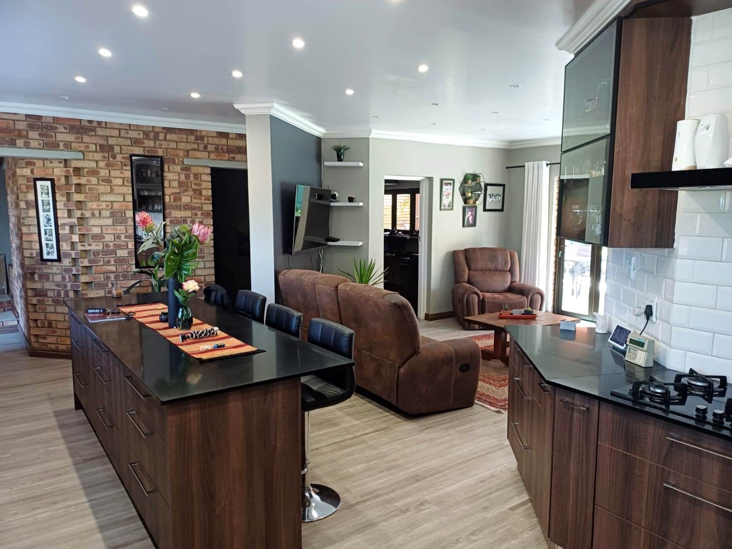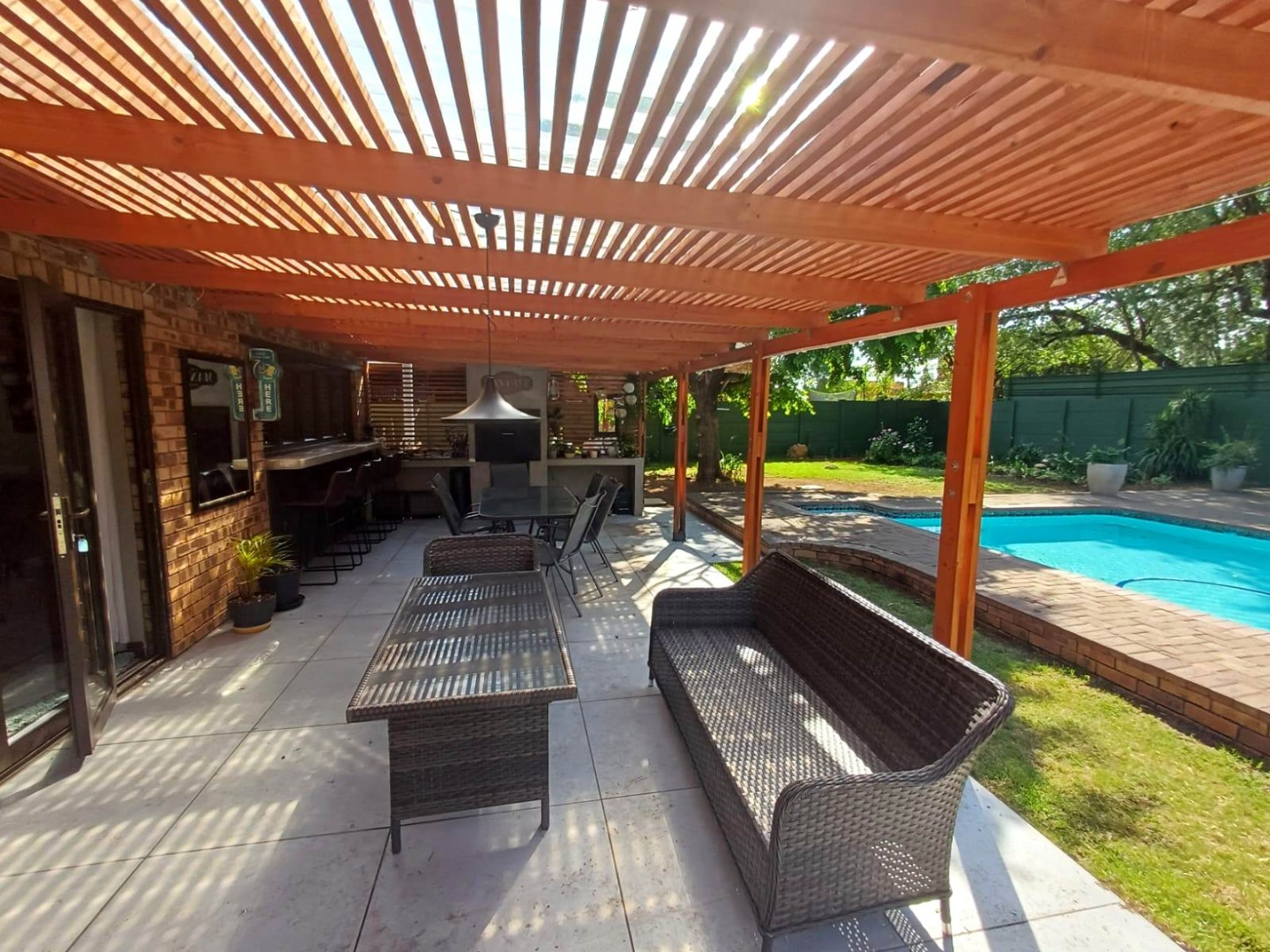 At the heart of the main residence is a dream kitchen designed for entertainers, featuring sleek modern cabinetry, granite countertops, a gas stove and oven, laminated floors, and a separate scullery. The kitchen flows effortlessly into spacious open-plan living and dining areas, which connect to the patio through stacker doors. This sun-drenched outdoor space is complete with a built-in braai and overlooks the sparkling pool and manicured garden, creating the perfect setting for gatherings. The adjoining bar room, with stacker windows opening onto the patio, enhances the sense of indoor-outdoor living and can easily serve as a study, TV lounge, or additional entertainment space.
