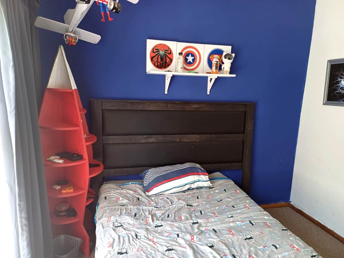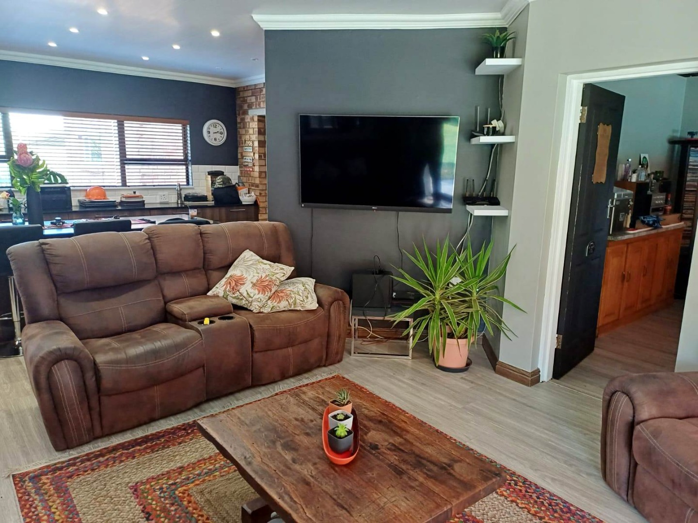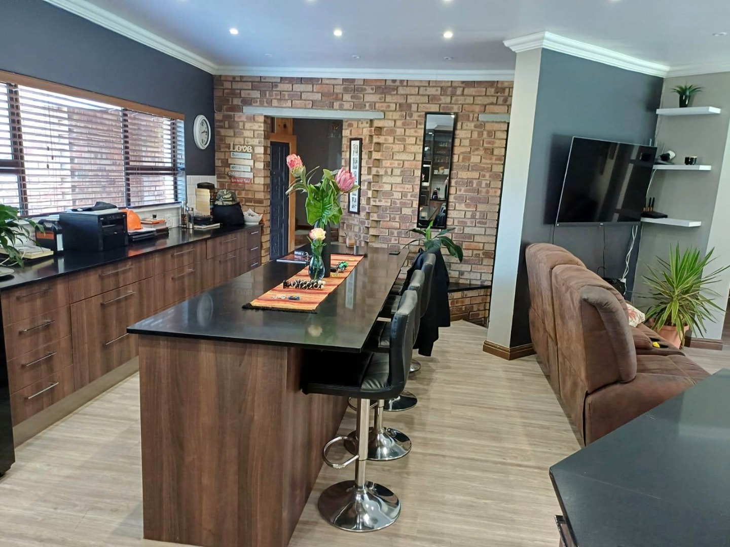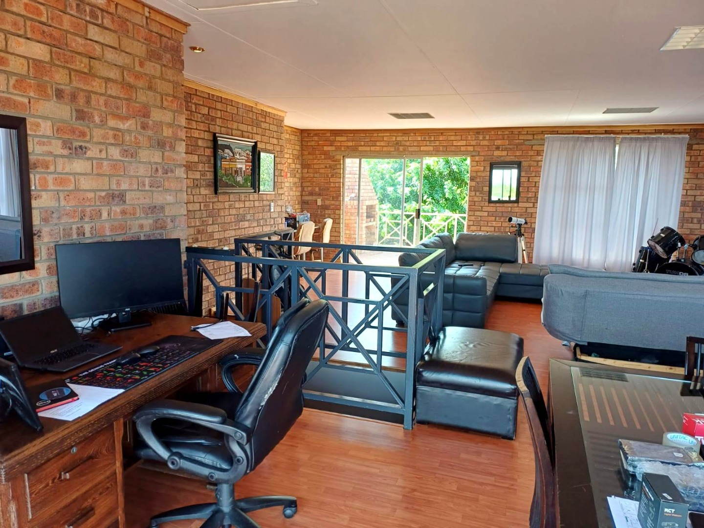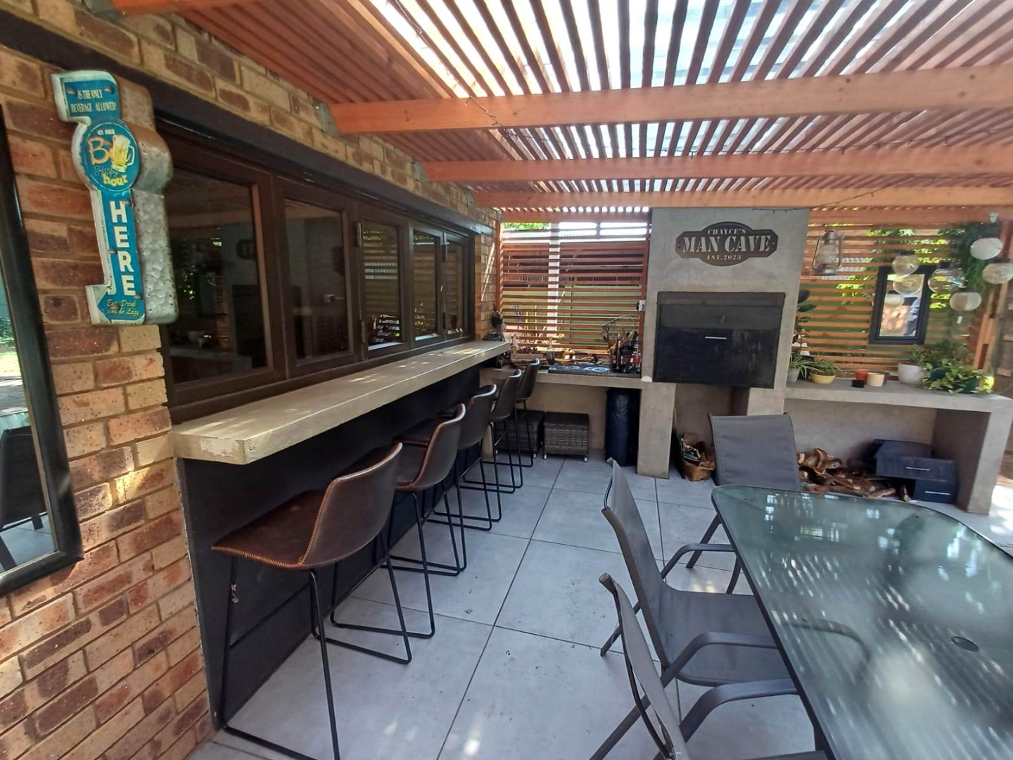 Upstairs, a versatile entertainment lounge opens onto two balconies, one north-facing and one south-facing. The north balcony is fitted with a built-in braai and enjoys spectacular views over the garden, while the space itself offers endless possibilities—whether as a bachelor’s flat, playroom, or self-contained rental unit.