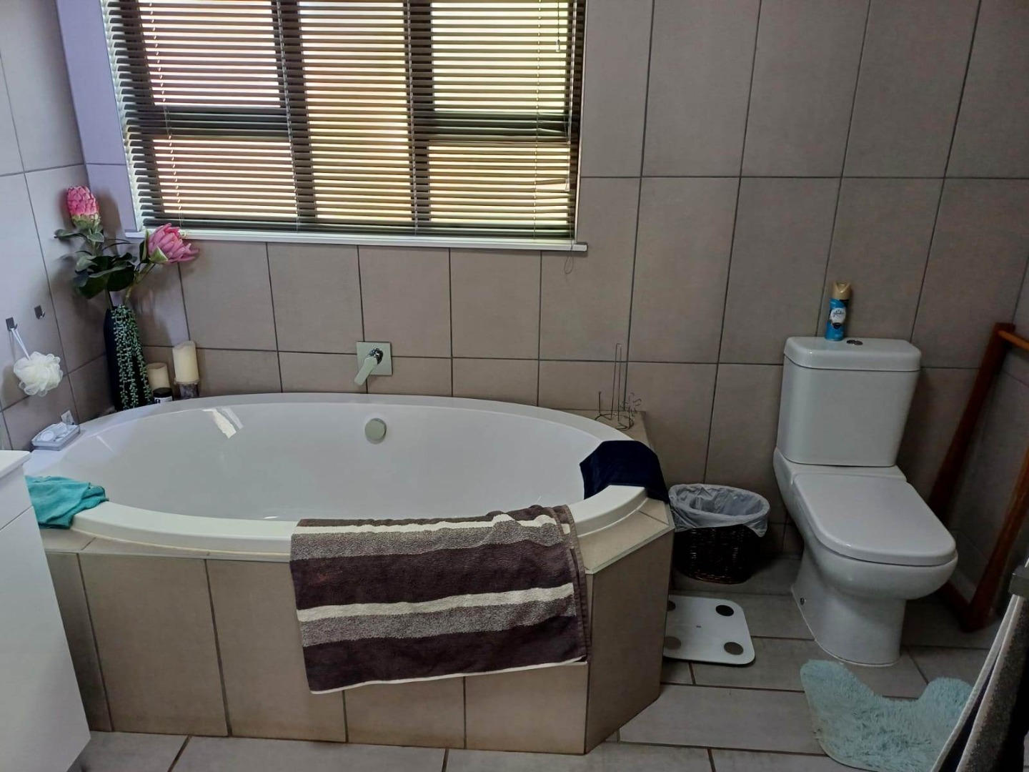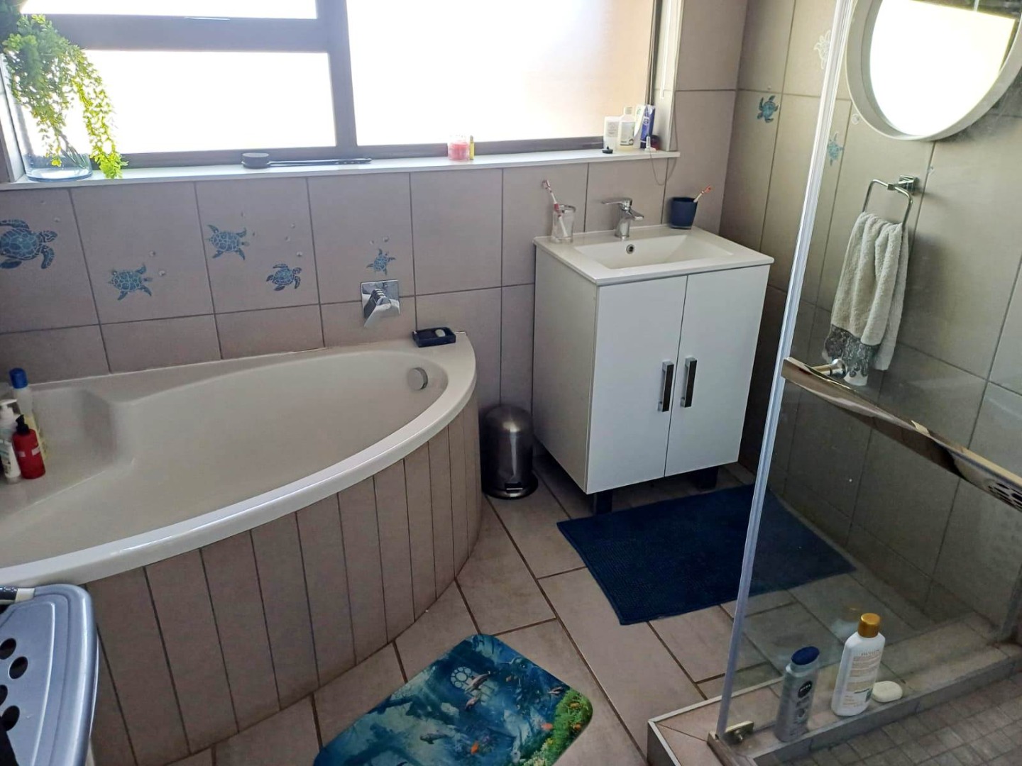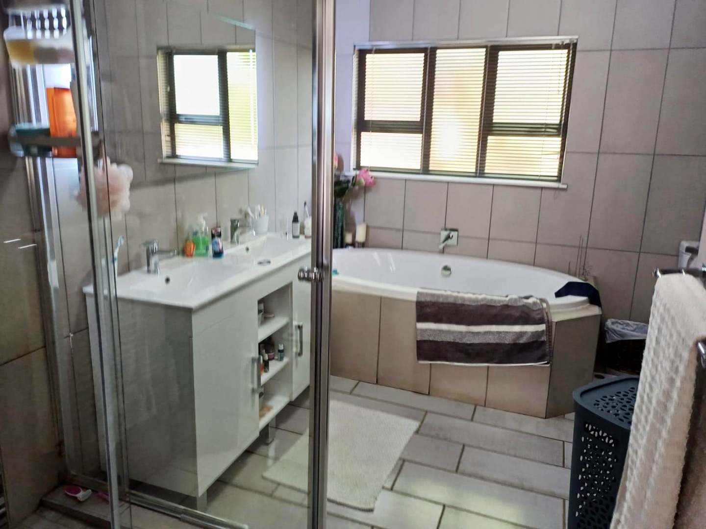 The home offers four generously sized bedrooms, all with built-in cupboards. The main bedroom is a private retreat with a walk-in closet, air conditioning, and a luxurious en-suite bathroom that includes a bath, shower, toilet, and basin. Two further bedrooms feature new cupboards and air conditioning, while a modern family bathroom with a rain shower and a separate toilet serves the rest of the home. A downstairs study provides flexibility to be used as a fourth bedroom if desired.