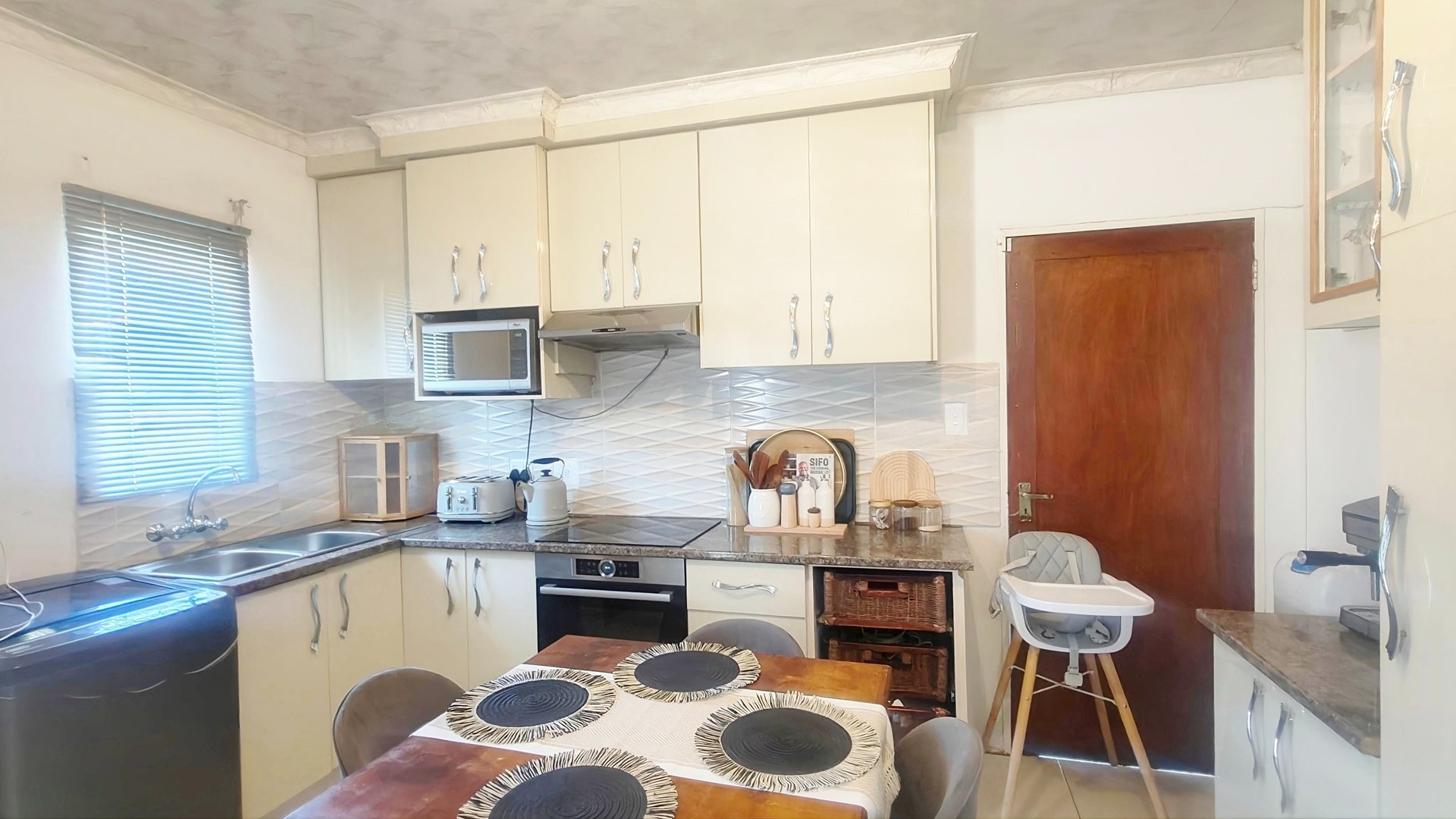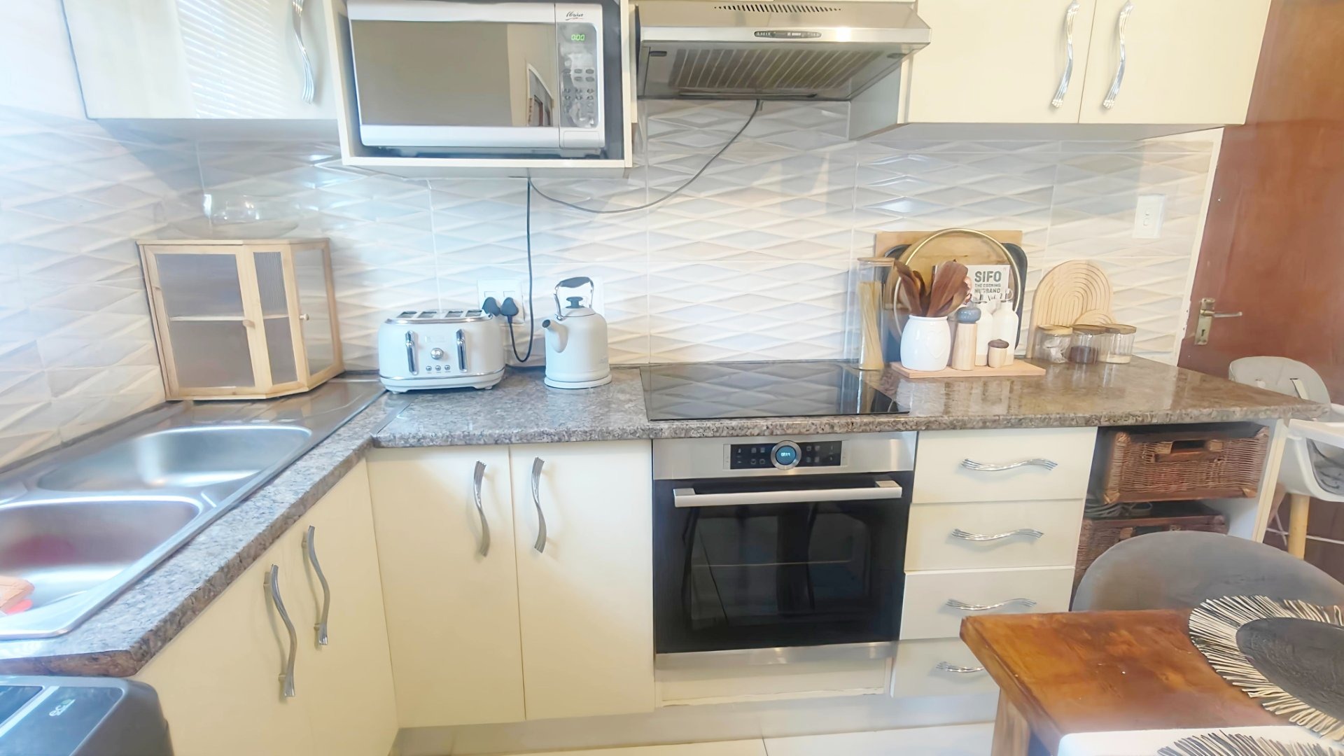 The modern kitchen is neatly designed with ample cupboard space, quality countertops, and a stylish tiled backsplash, complemented by a built-in oven, hob, and extractor. It offers both functionality and charm for effortless meal preparation.