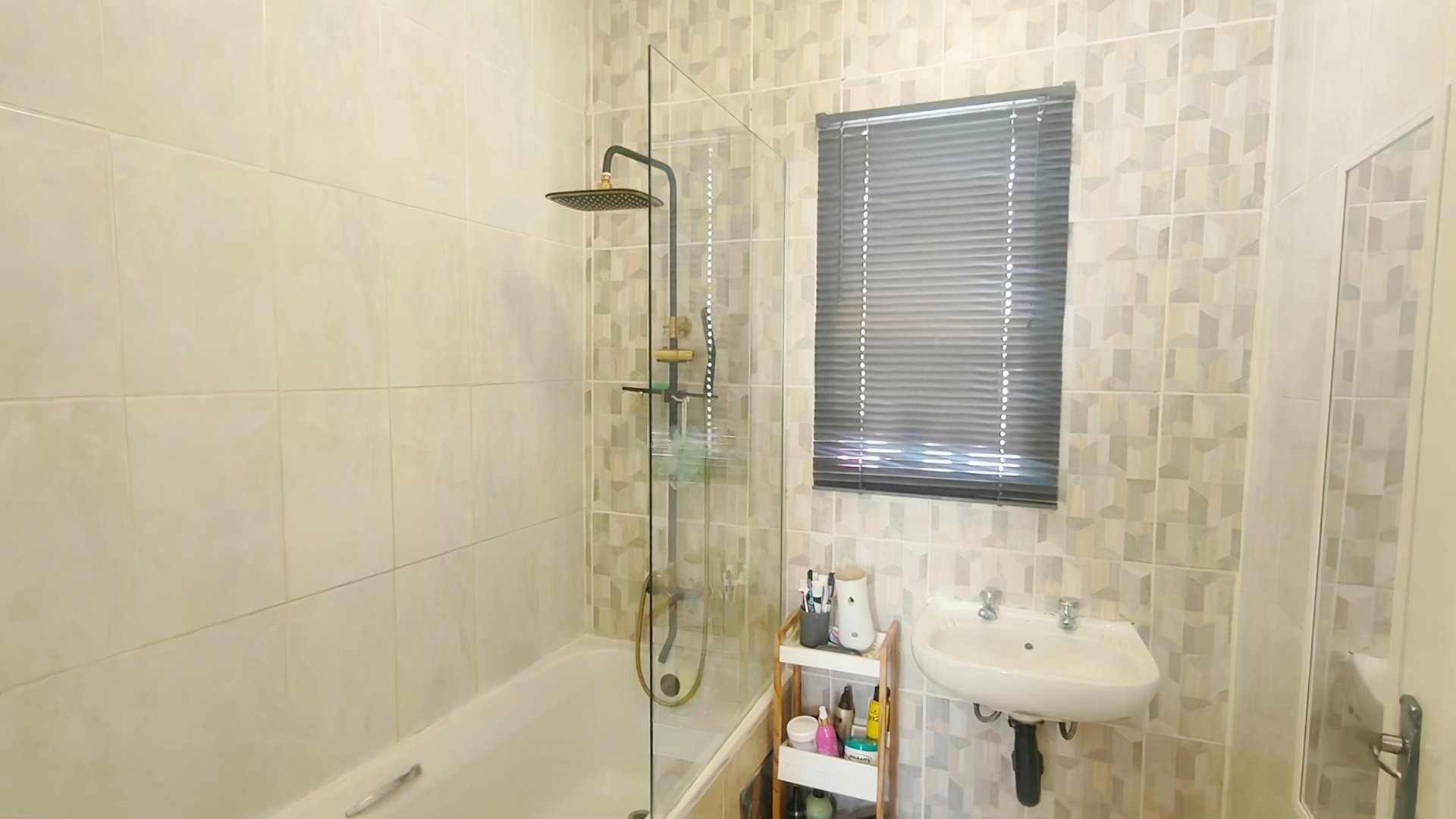 The bathroom is beautifully finished with contemporary tiles, a sleek basin, and a glass-panel bath/shower combination, giving it a clean, elegant feel.