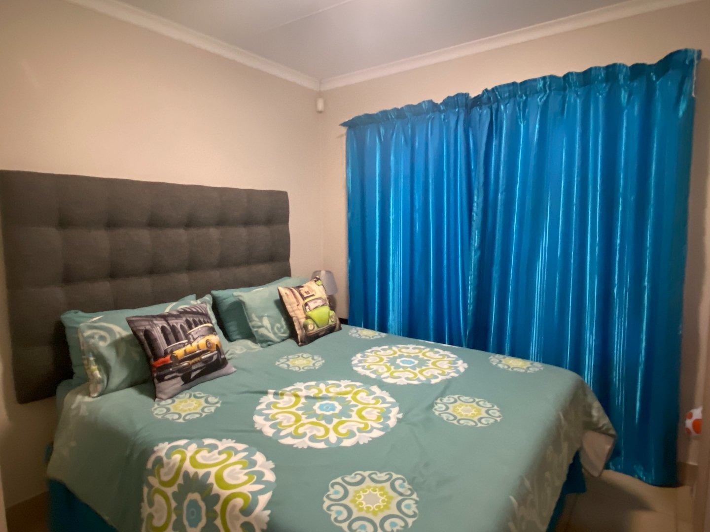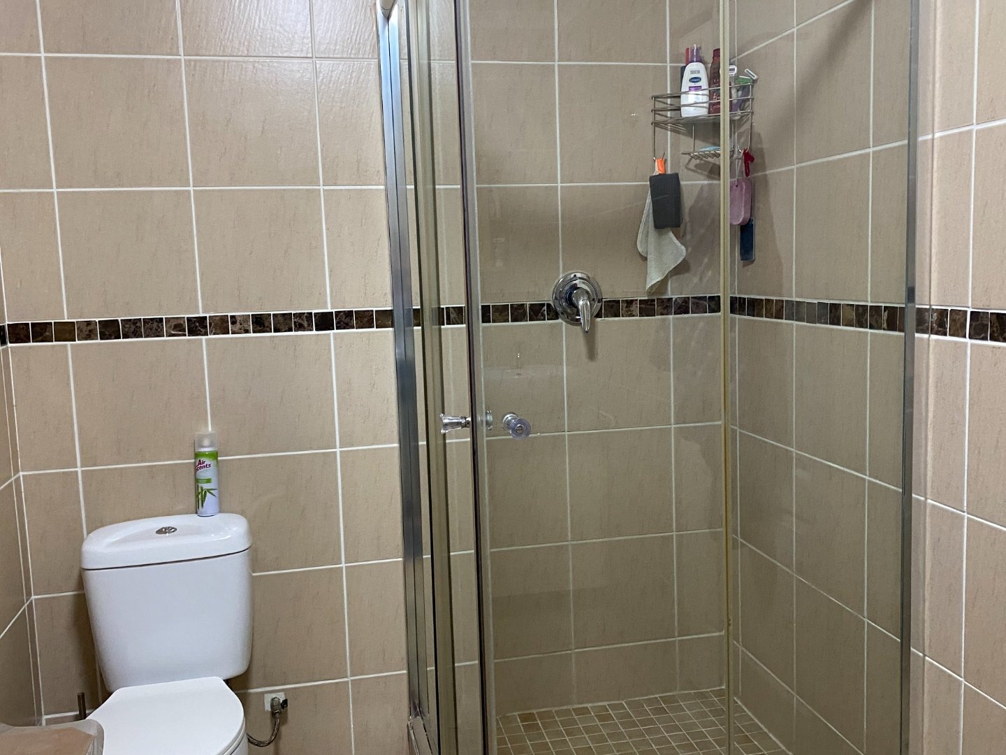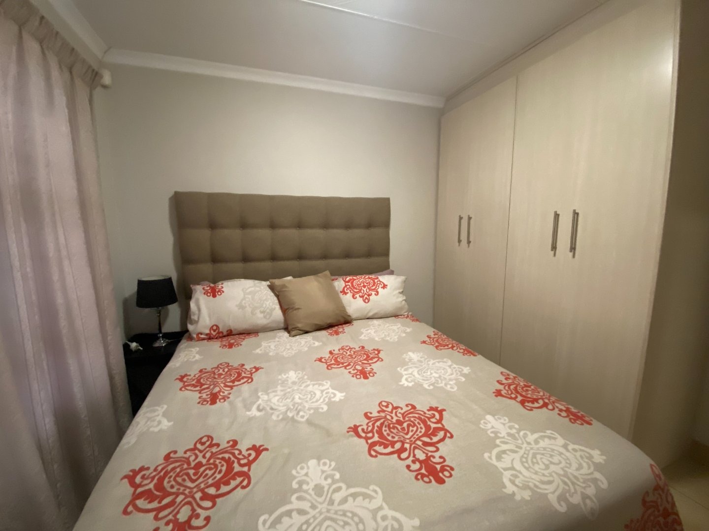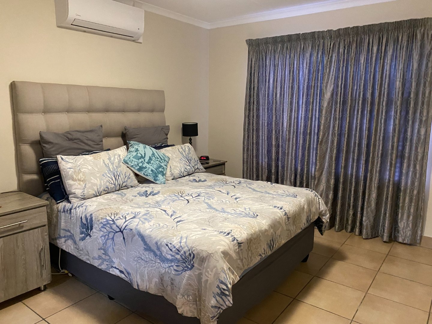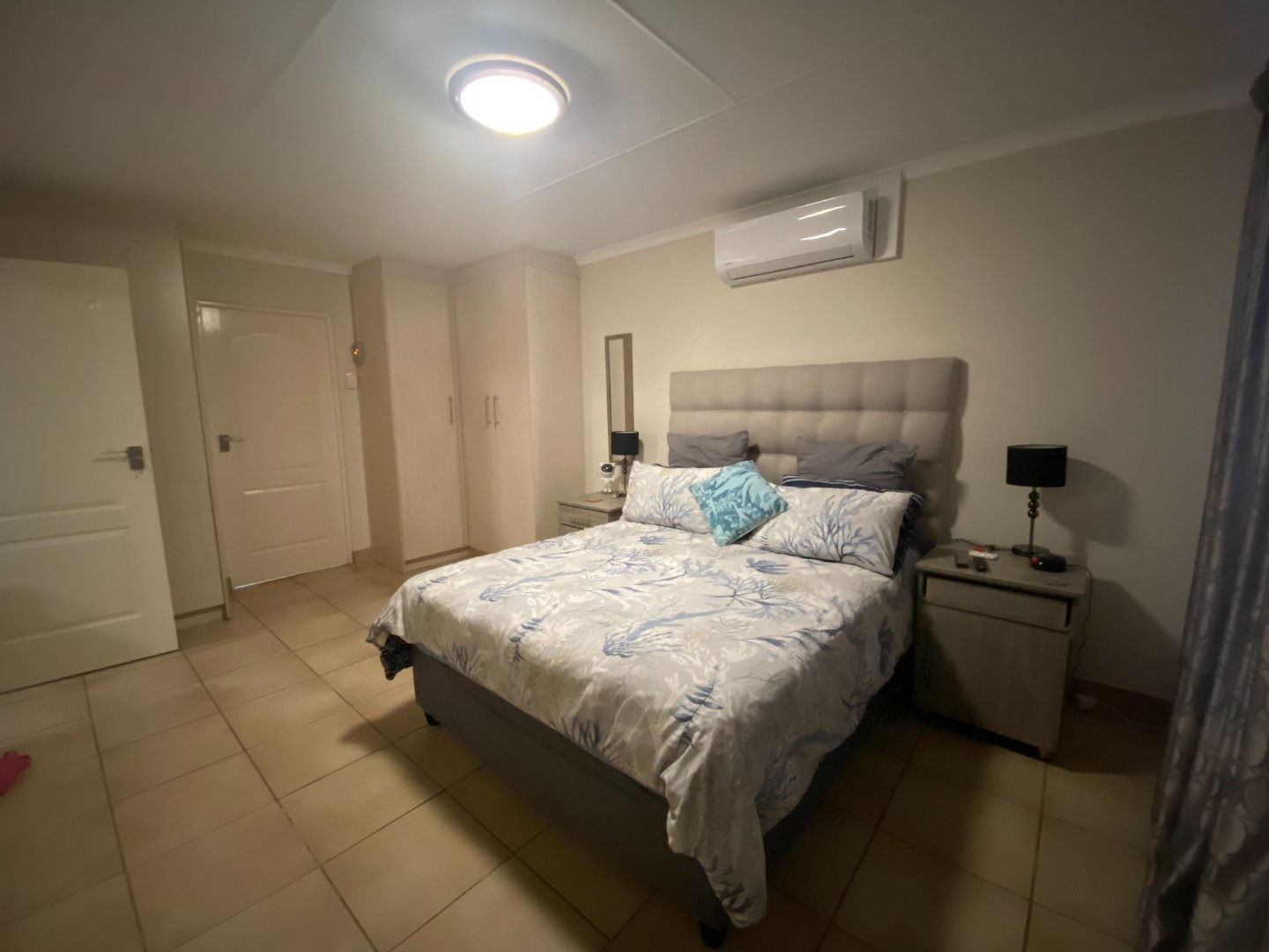 Main bedroom with queen bed, TV port, built in cupboards, en suite full bathroom. The other two bedrooms share in bathroom with shower. Bedrooms with tiled floors and curtain rails. Lot of extras in the unit: aircon in main bedroom.