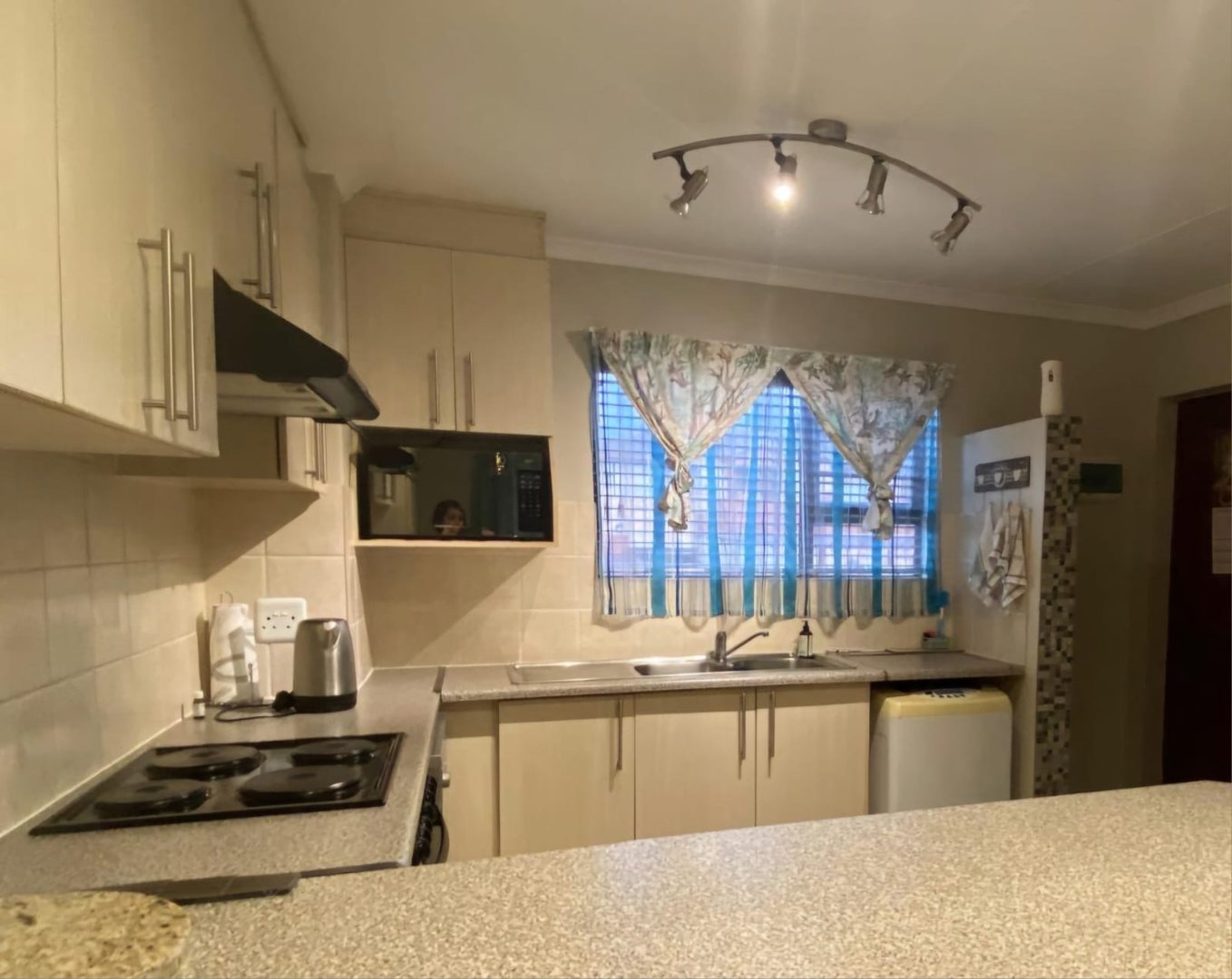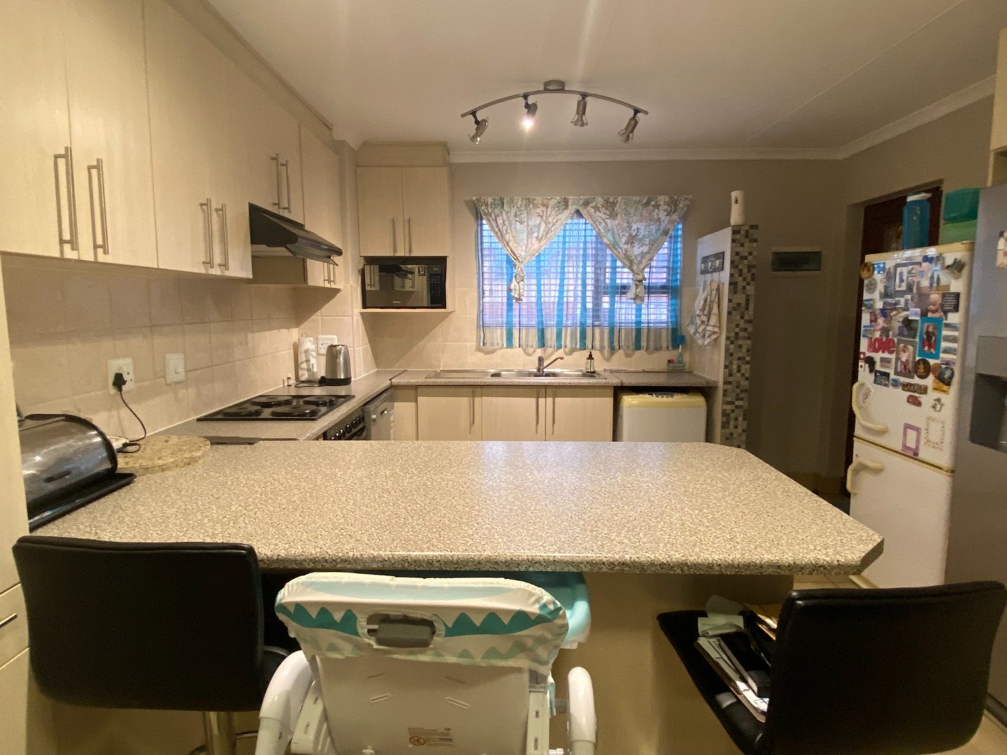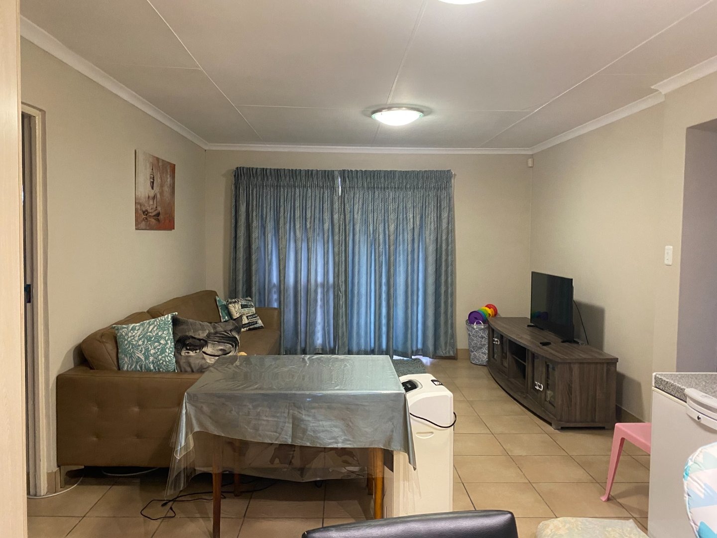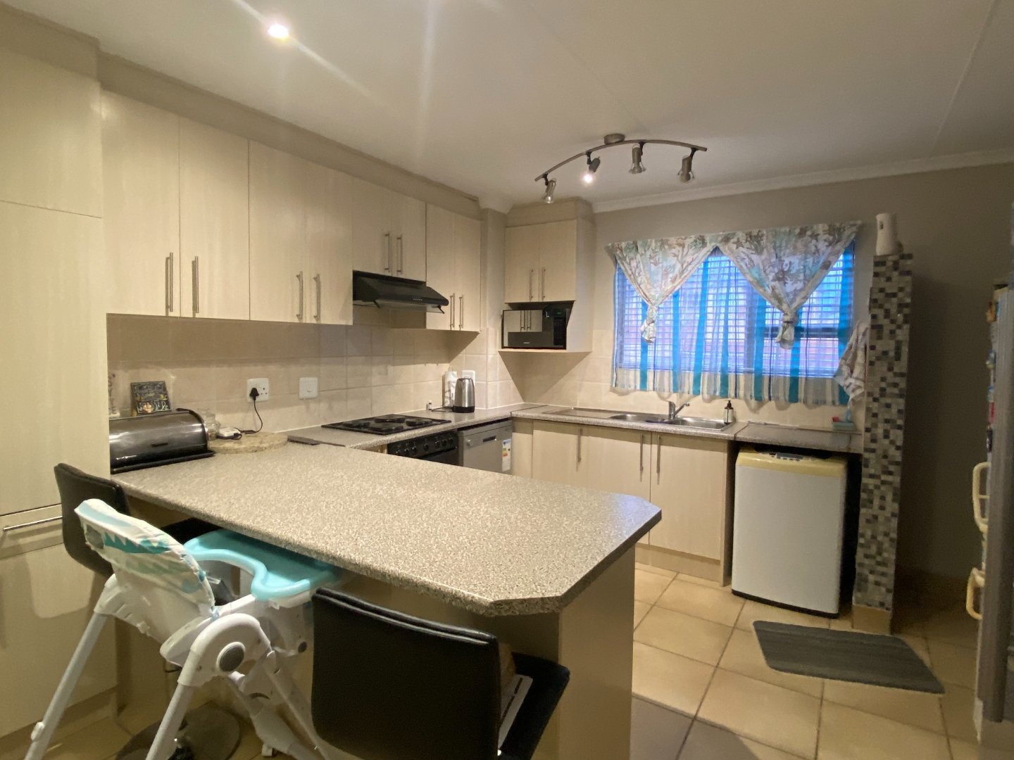 Charming 3 bedroom apartment with an open plan lay out for the living area and the kitchen. The kitchen with more than you need. Ample cupboards, electric hob, under counter oven, Water point for the washing machine, Eiland to use as breakfast nook. Tiles on the floor through out the whole unit. Blinds at almost all the windows. Spacious living area with sliding doors to the balcony.