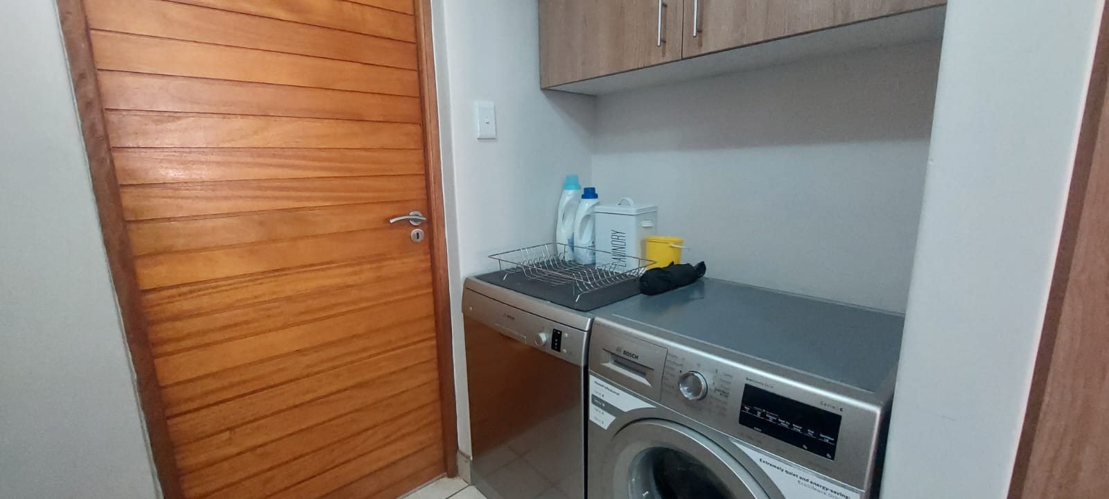 The contemporary kitchen is fitted with granite countertops, an under-counter oven, and a separate scullery with dedicated space for both a washing machine and dishwasher .
