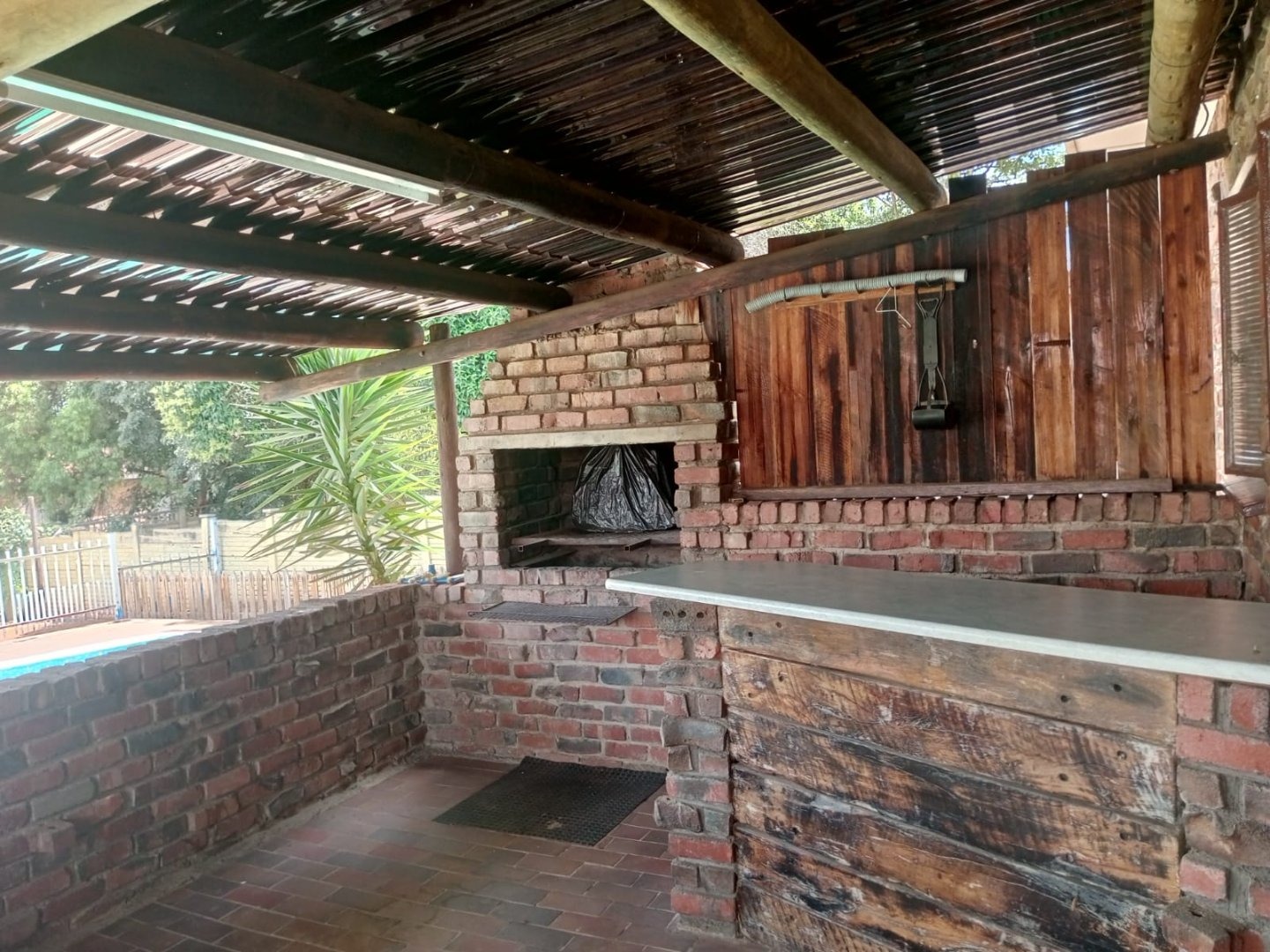 The outdoor entertainment area is designed for leisure, featuring a tiled patio with a built-in braai, and a pristine swimming pool.