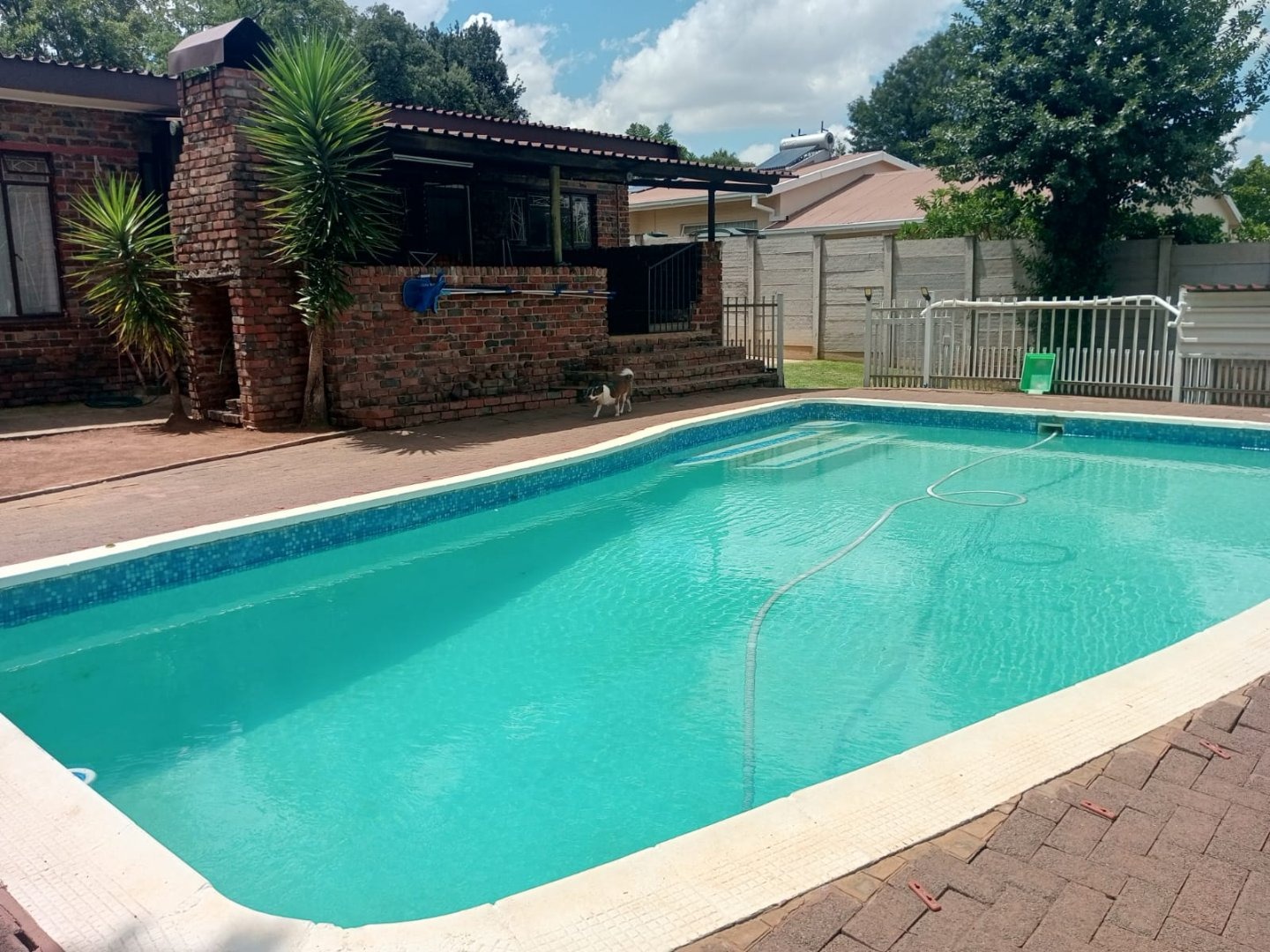 The outdoor entertainment area is designed for leisure, featuring a tiled patio with a built-in braai, and a pristine swimming pool.