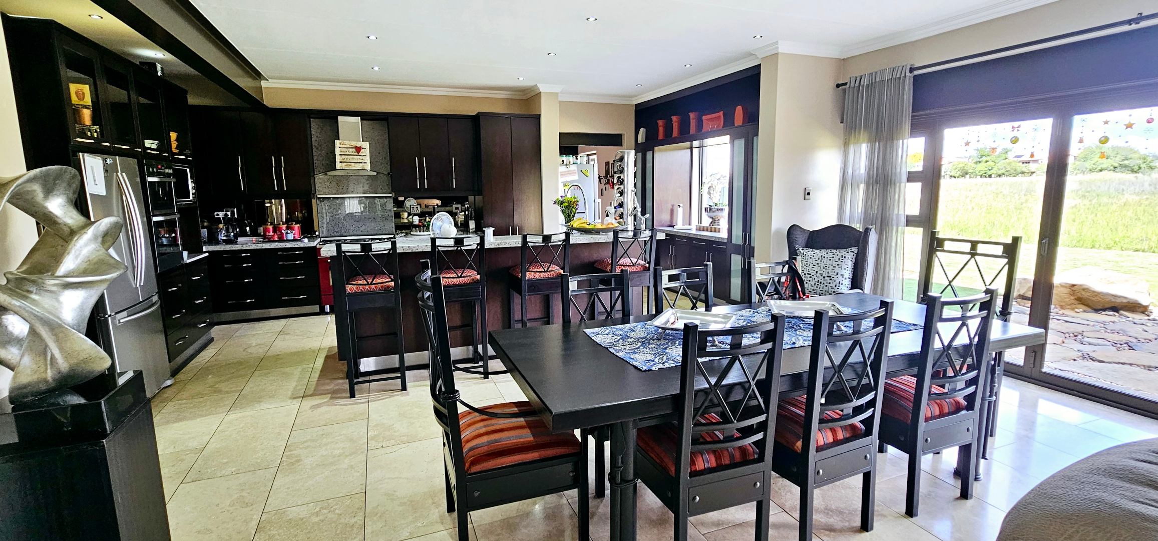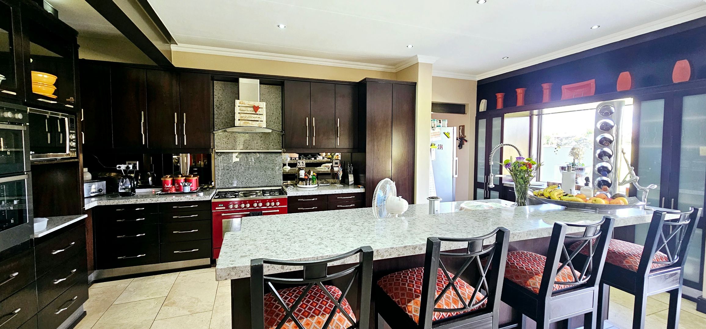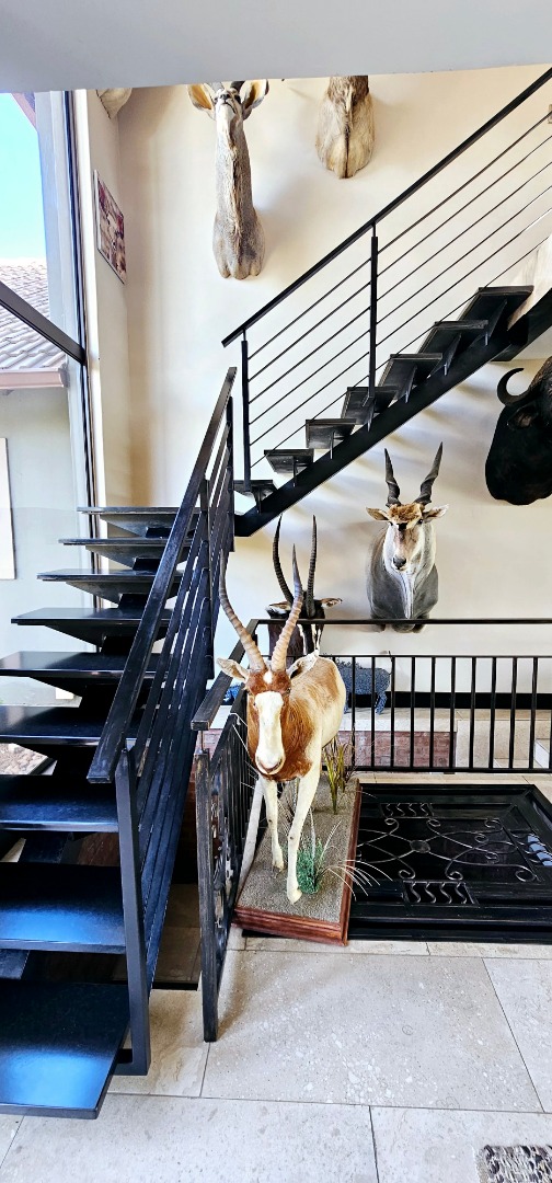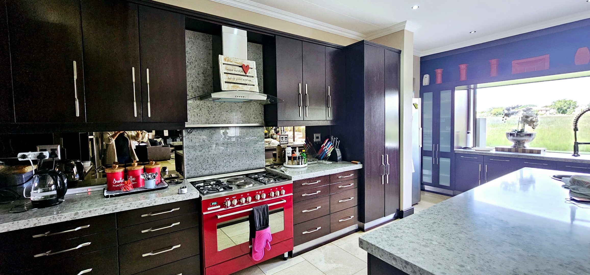 At the heart of this residence lies the gourmet kitchen, complete with a generous center island and sophisticated grey Caesarstone tops. The striking big red stove is sure to capture the heart of any chef, perfect for gatherings while you admire playful Nyala and badgers outside the window. The kitchen is complemented by a separate scullery, laundry room, and enclosed courtyard for ultimate convenience.