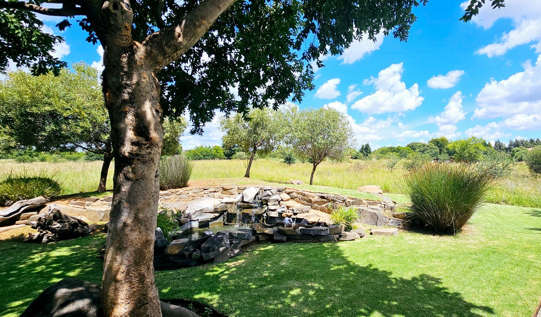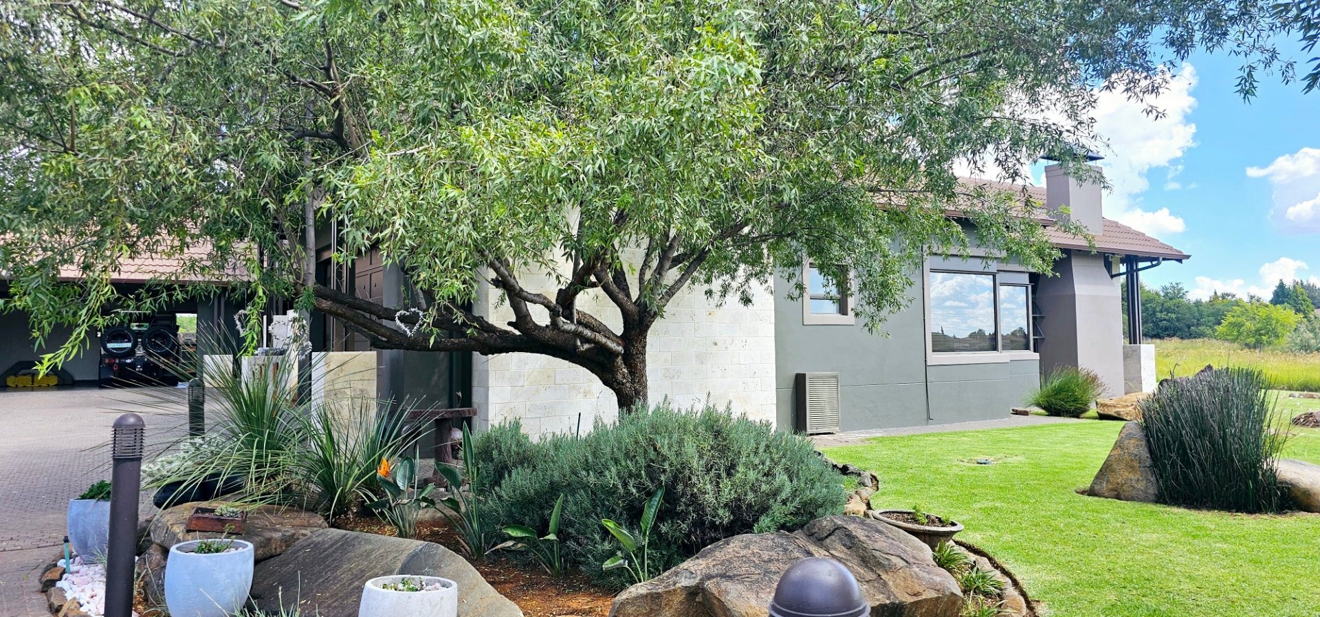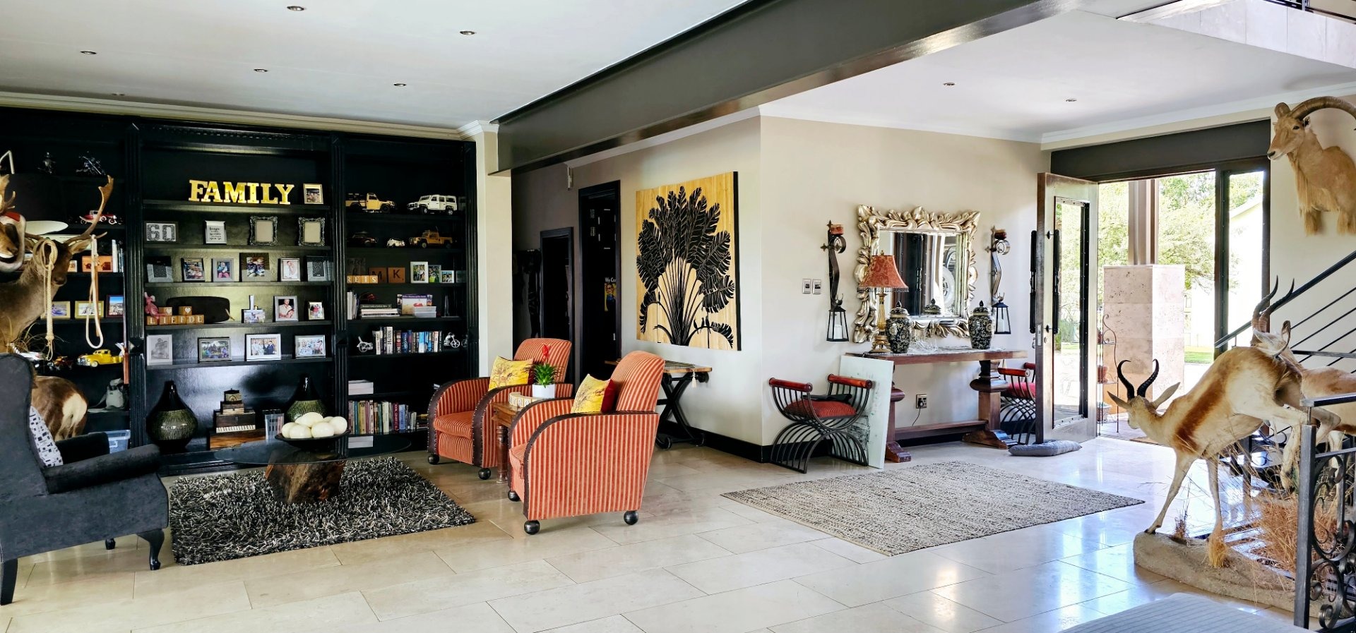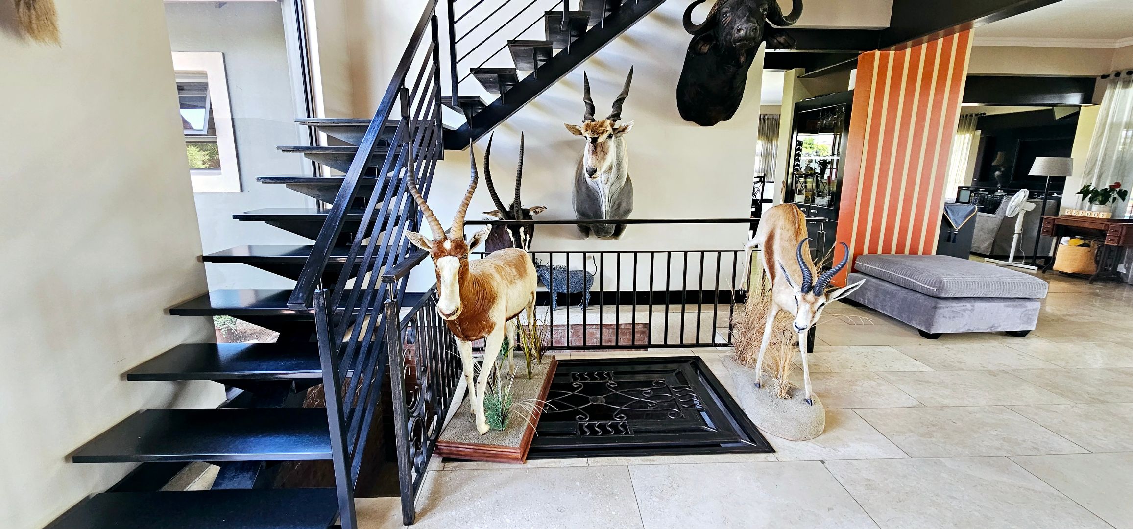 At the heart of this residence lies the gourmet kitchen, complete with a generous center island and sophisticated grey Caesarstone tops. The striking big red stove is sure to capture the heart of any chef, perfect for gatherings while you admire playful Nyala and badgers outside the window. The kitchen is complemented by a separate scullery, laundry room, and enclosed courtyard for ultimate convenience.