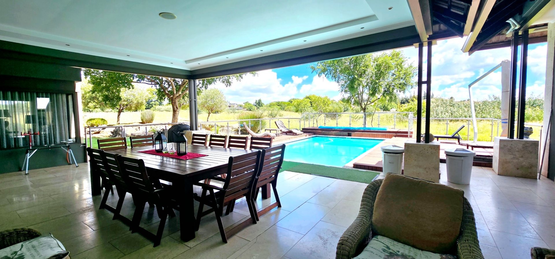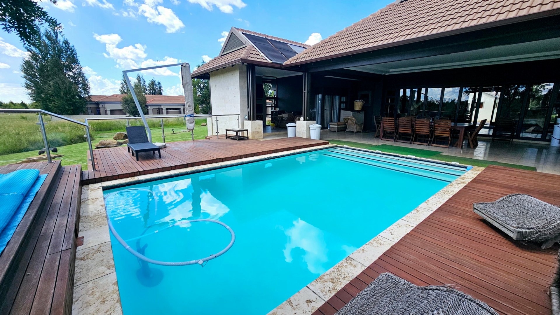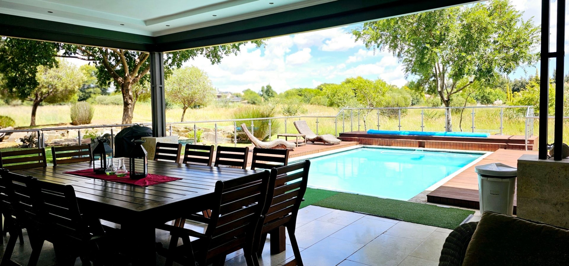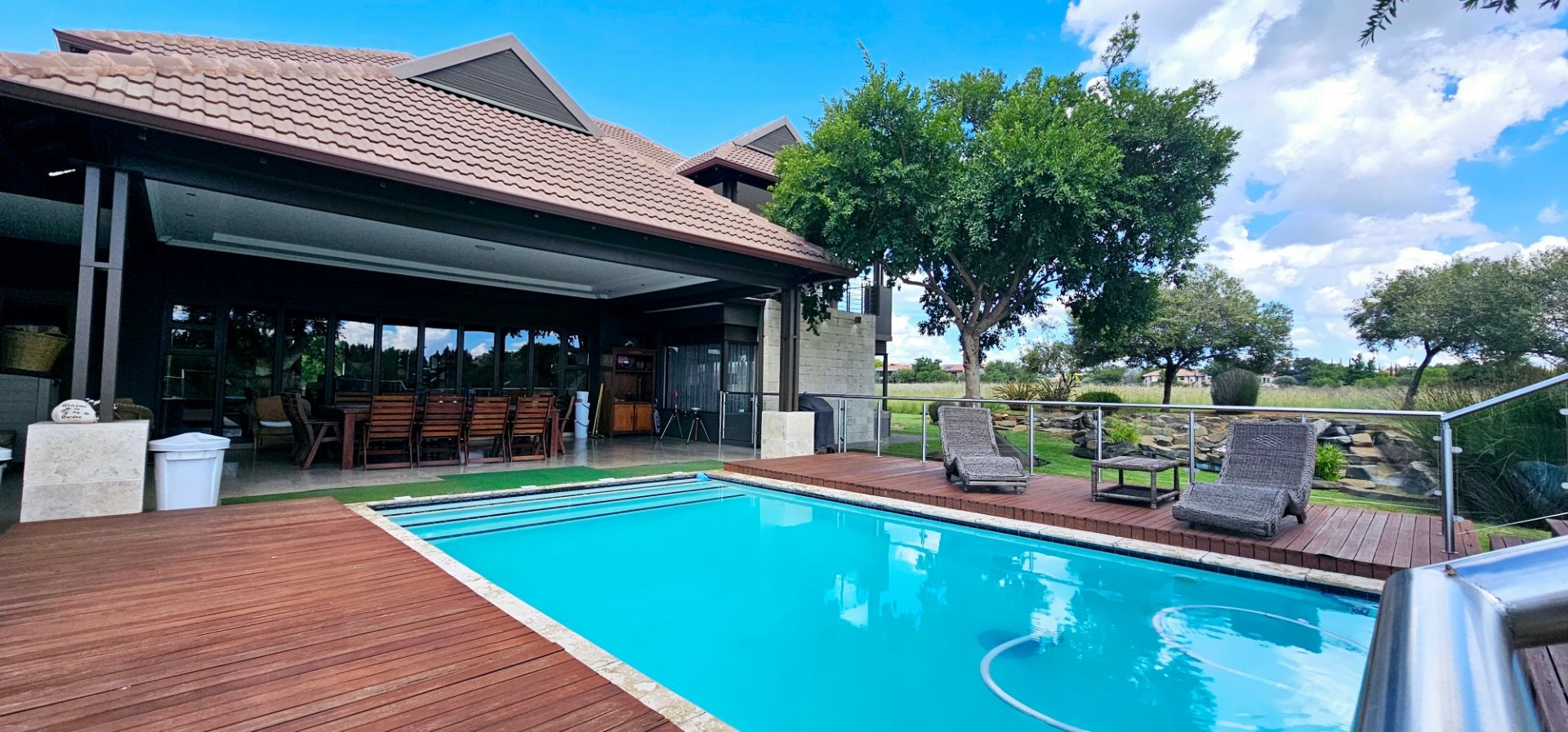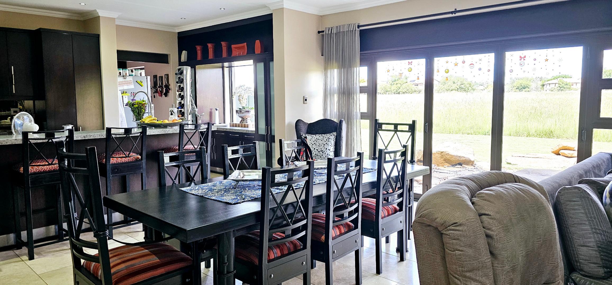 The expansive entertainment area, adorned with stacked doors, opens up the heart of the home—a spacious central living space that flows onto a patio, braai room, pool deck, and pool. Experience magical views and the enchanting presence of Nyala and vibrant birdlife with family and friends.