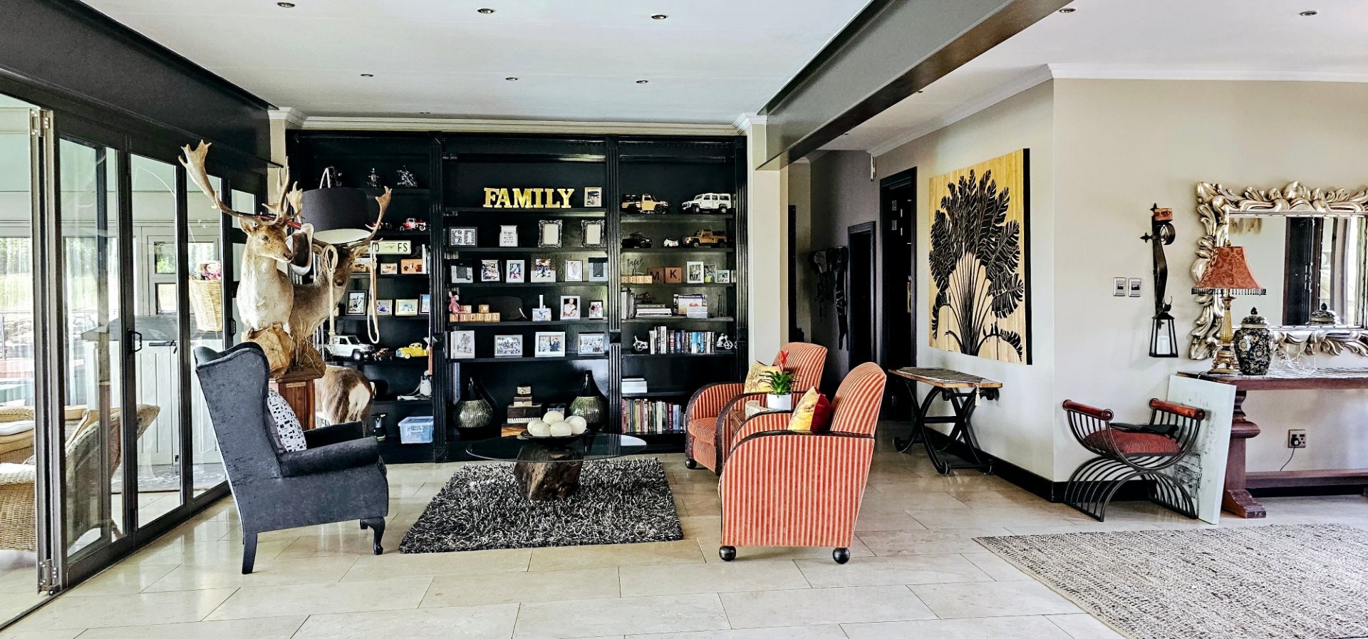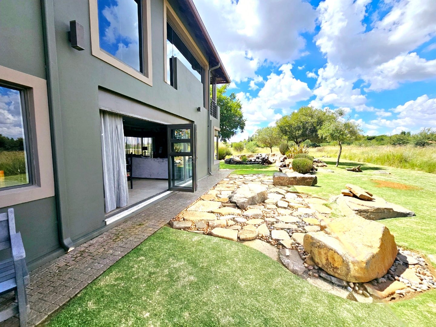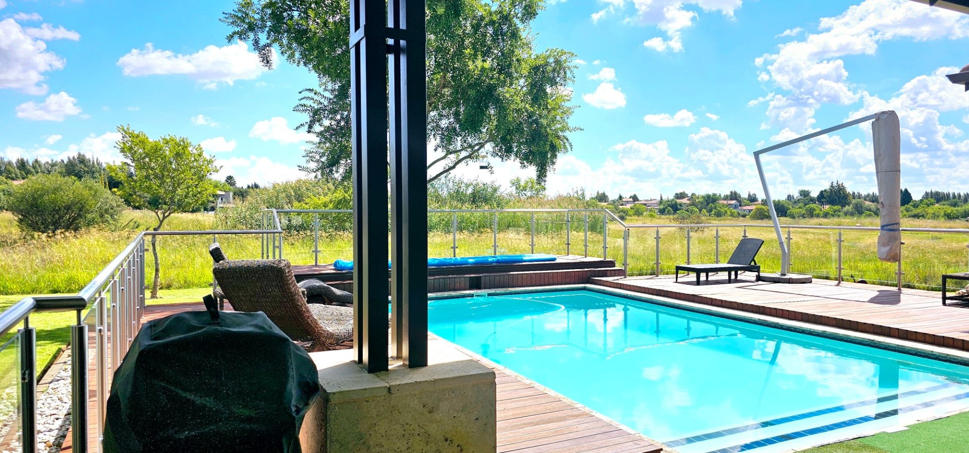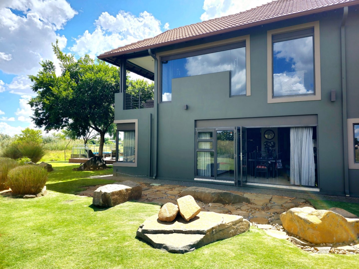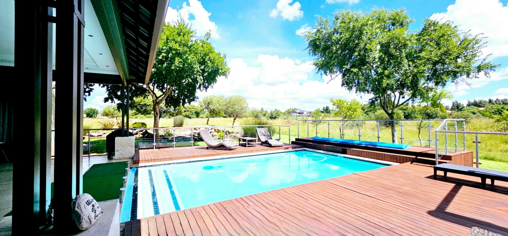 The expansive entertainment area, adorned with stacked doors, opens up the heart of the home—a spacious central living space that flows onto a patio, braai room, pool deck, and pool. Experience magical views and the enchanting presence of Nyala and vibrant birdlife with family and friends.