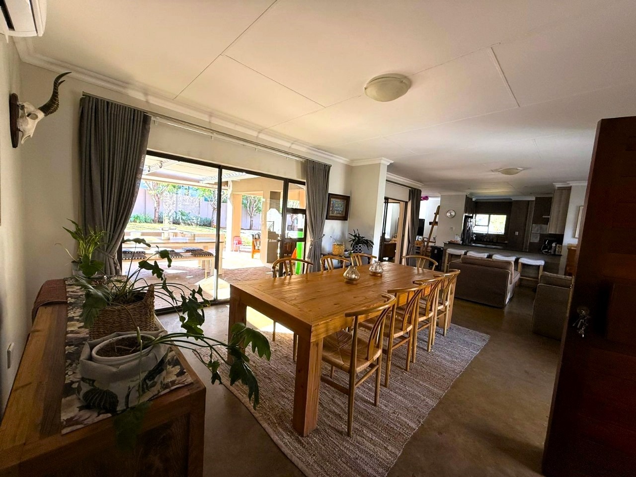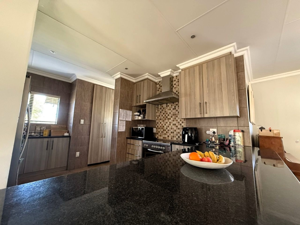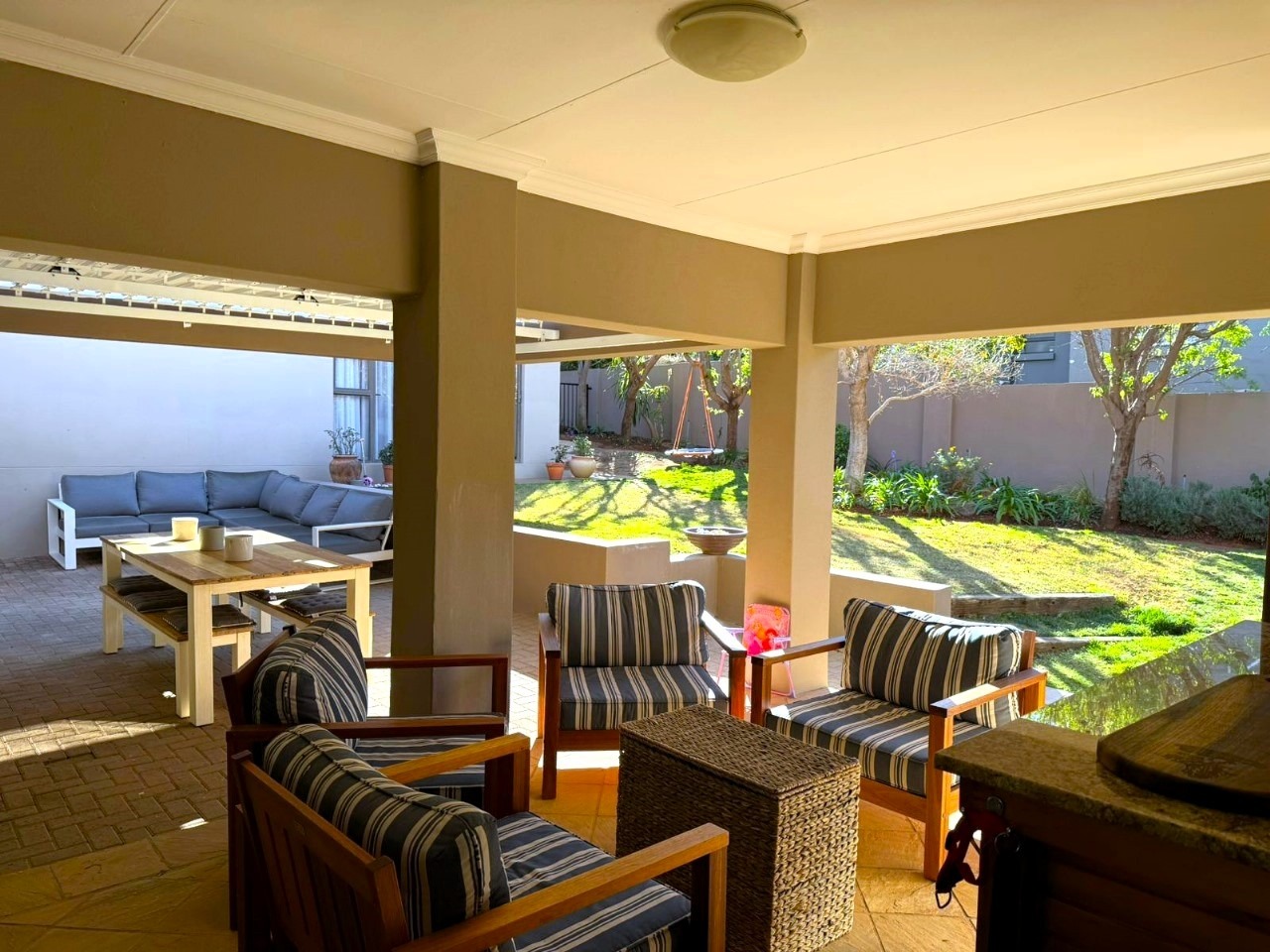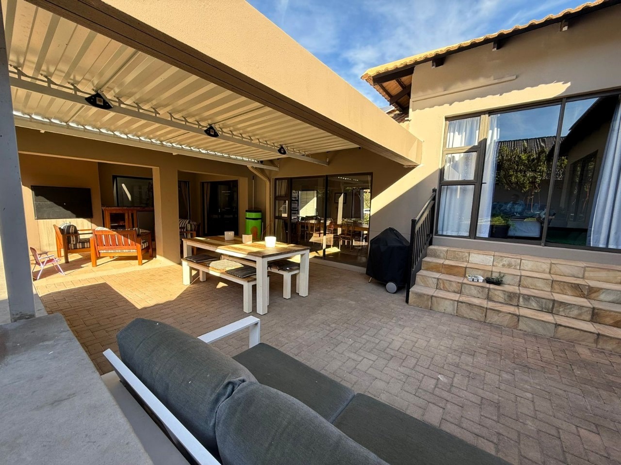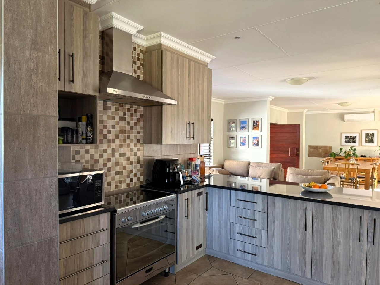 The open-plan kitchen, dining, and living area forms the heart of the home, complemented by a large scullery with space for all appliances. Sliding doors lead to a stylish braai area with an adjustable louvre roof, overlooking the pool and garden—perfect for entertaining.