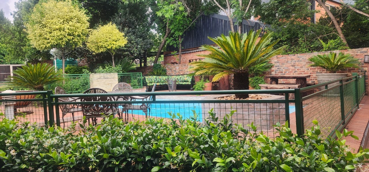 The outdoor area is a true delight — a fully enclosed pool area provides privacy and relaxation space for the entire family. A separate Wendy house currently serves as an additional home office.