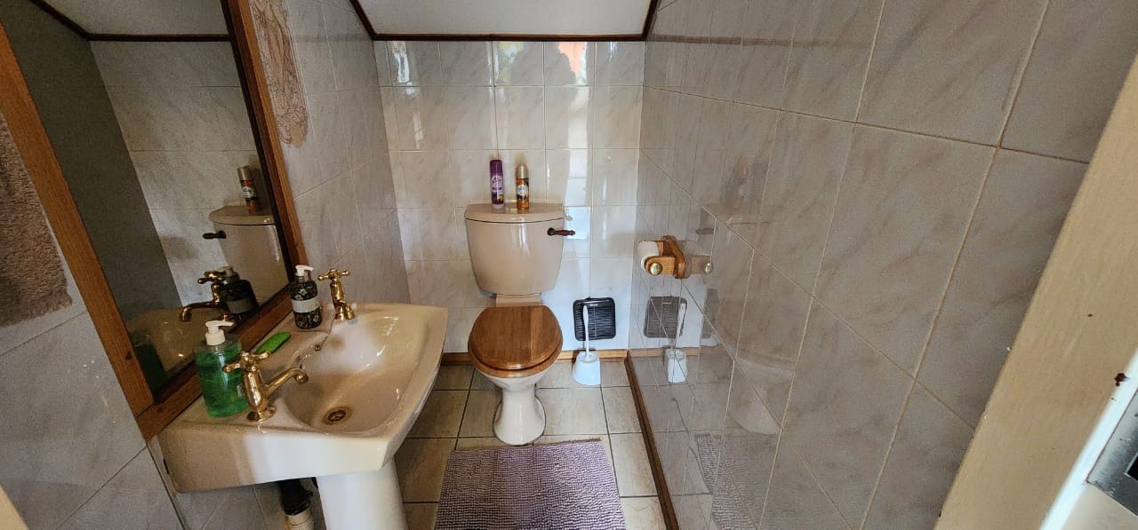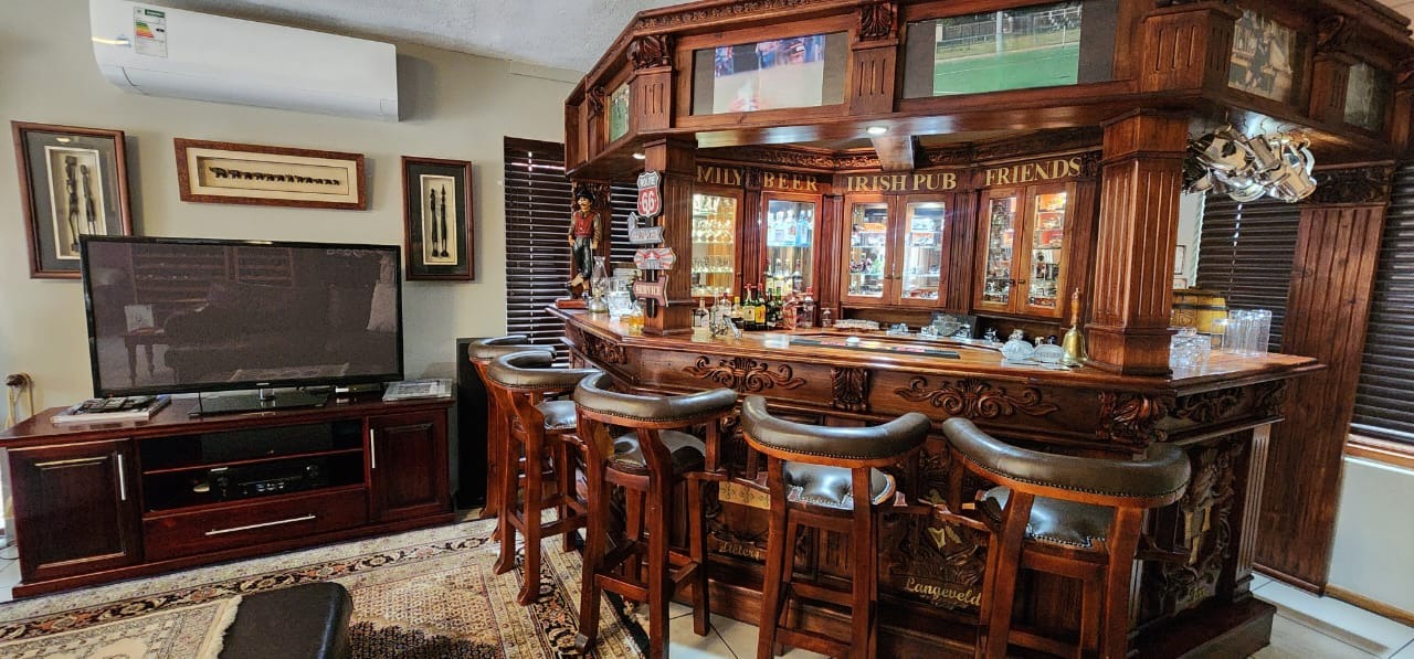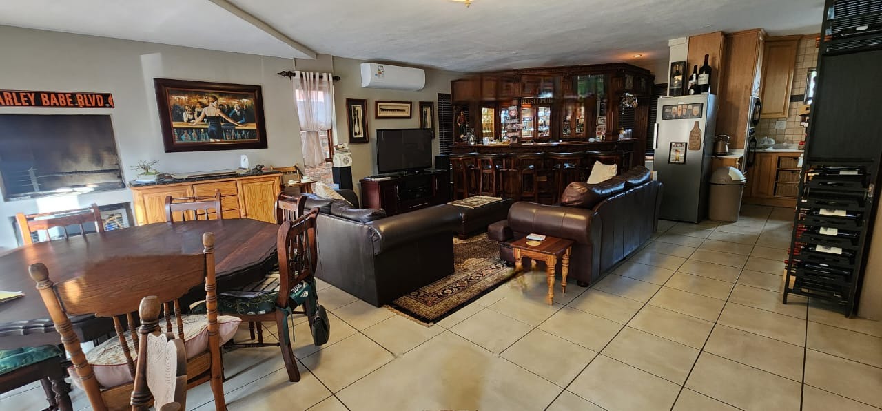 The ground floor welcomes you with an open-plan layout encompassing the lounge, dining room, and a well-appointed kitchen featuring a centre island and spacious scullery. The entertainment area includes a built-in braai and solid wooden bar, creating the perfect setting for family gatherings. A convenient guest bathroom completes the ground level.