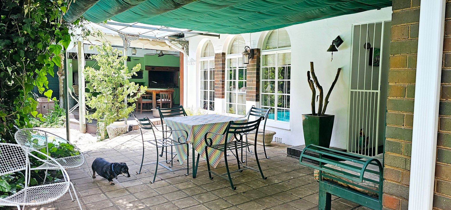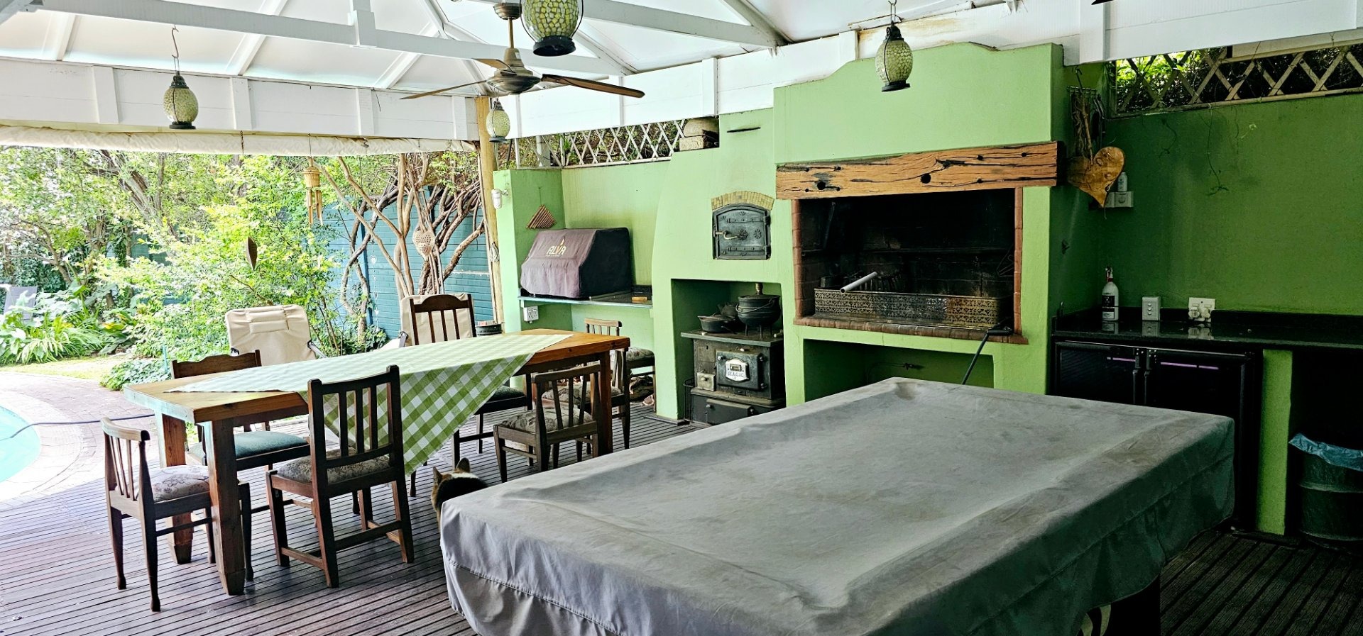 a large, covered patio with pizza oven and built-in braai, and a sparkling pool