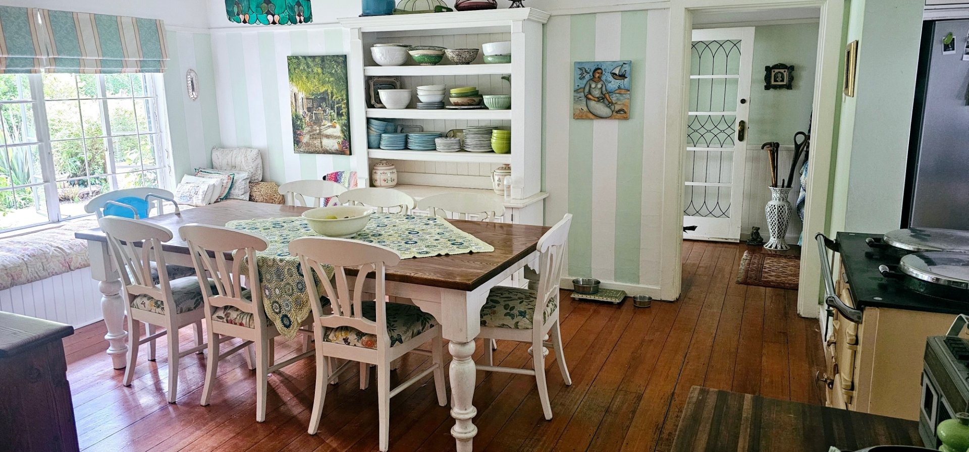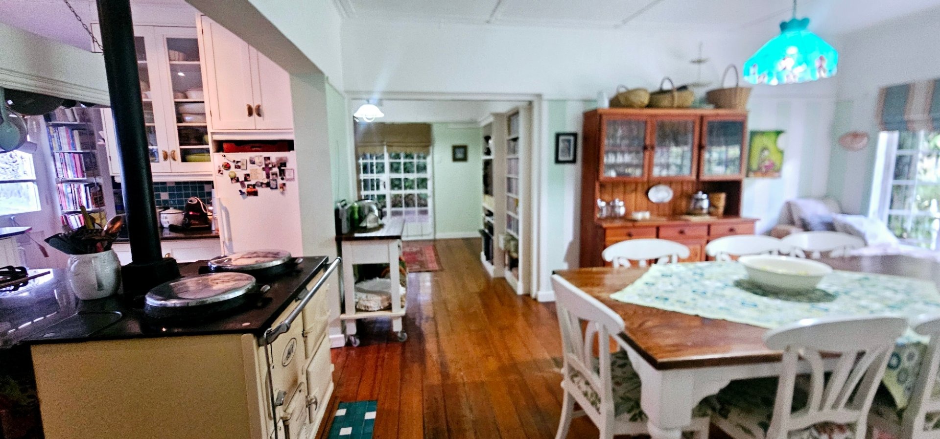 At the heart of the home lies a bright farm-style kitchen, centered around a beautiful coal stove. It flows seamlessly into the dining room, where a large family table invites conversation and togetherness. A separate scullery and generous pantry add convenience, while doors lead to an outside courtyard and a large utility room.