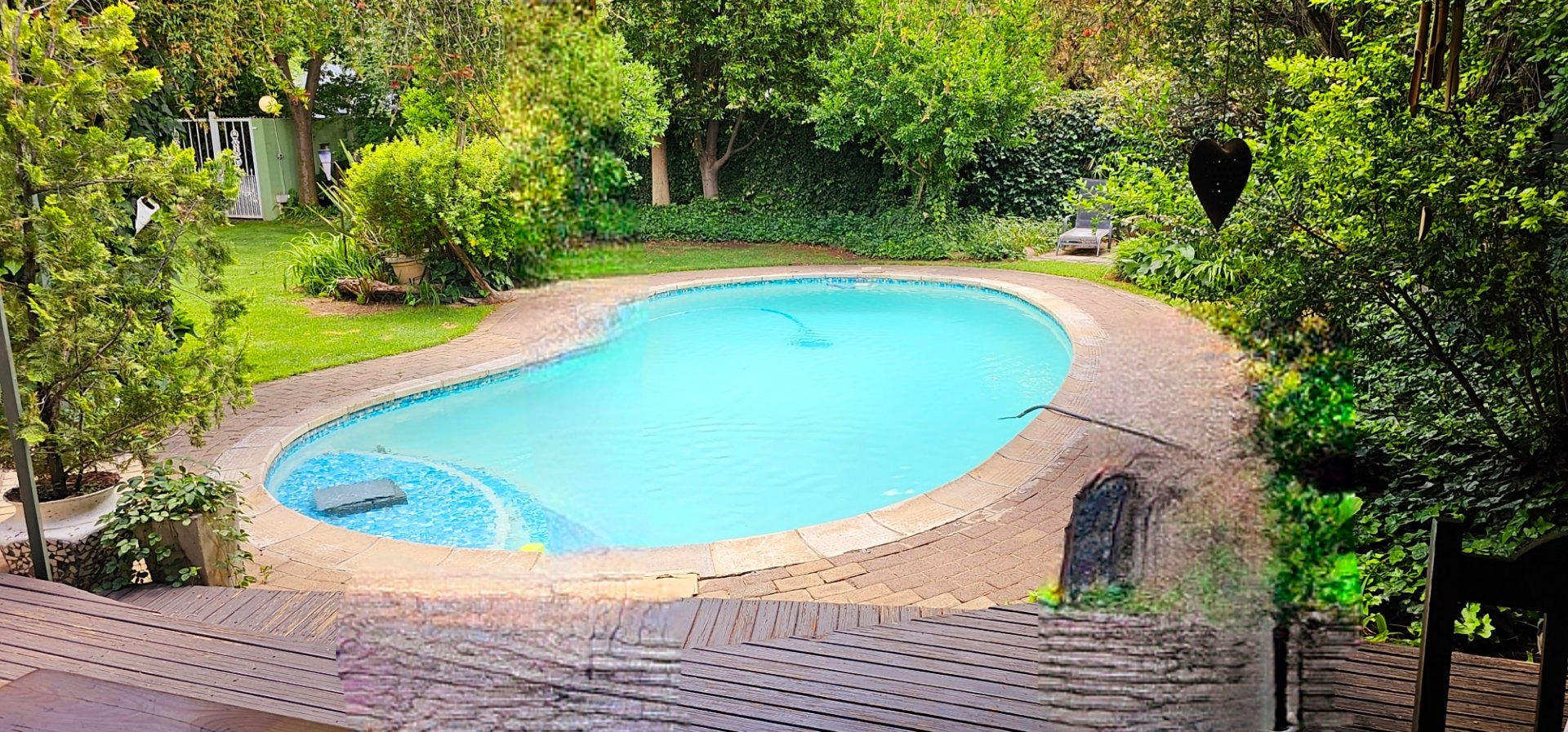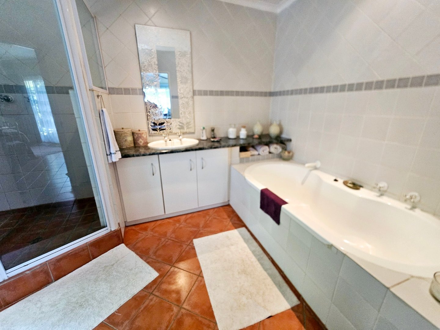 This home offers 4 spacious bedrooms and 3 bathrooms, all with abundant natural light and built-in cupboards. The master suite features a private en suite bathroom and doors opening onto a patio and pool, creating a tranquil retreat.