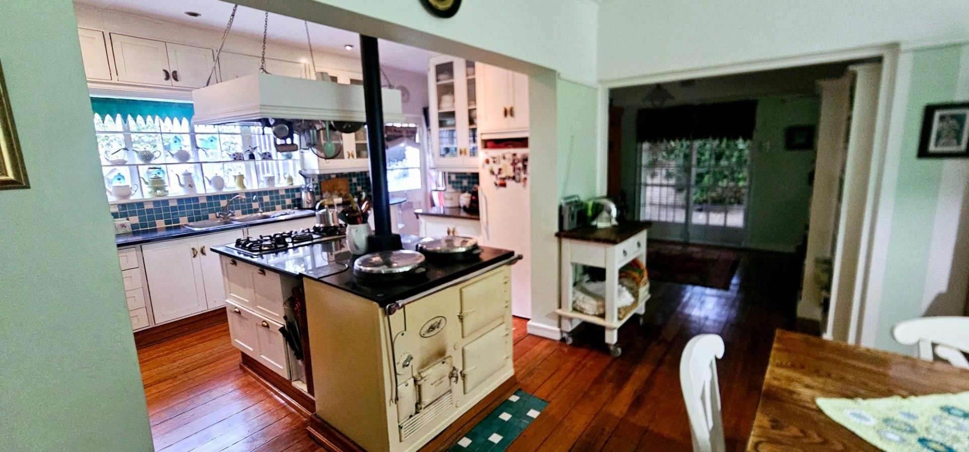 At the heart of the home lies a bright farm-style kitchen, centered around a beautiful coal stove. It flows seamlessly into the dining room, where a large family table invites conversation and togetherness. A separate scullery and generous pantry add convenience, while doors lead to an outside courtyard and a large utility room.