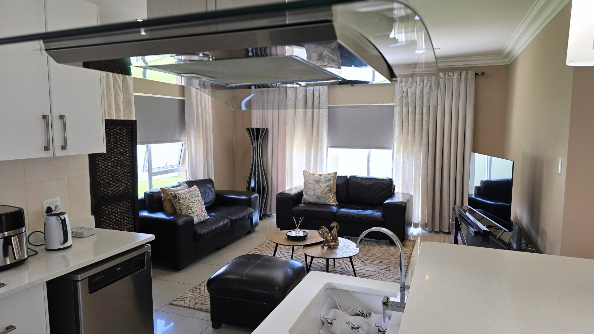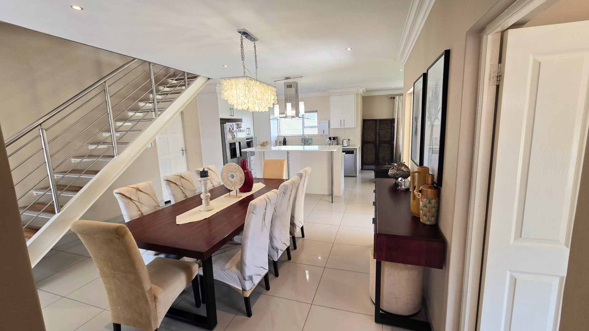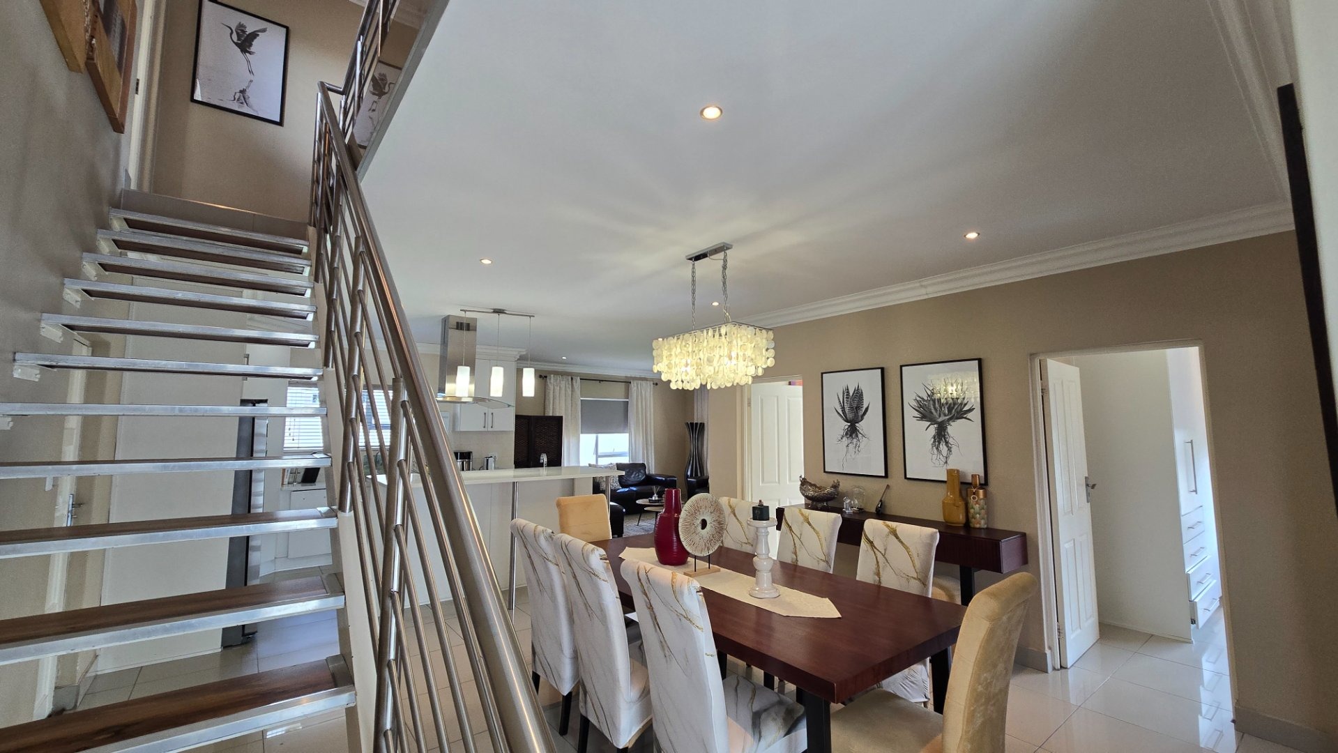 Living Excellence: The heart of the home features a contemporary open-plan kitchen, dining, and TV room. High-quality finishing including black out blinds on most windows, exclusive floor tiles, custom cabinetry, and elegant chandeliers creating an atmosphere of sophisticated luxury.