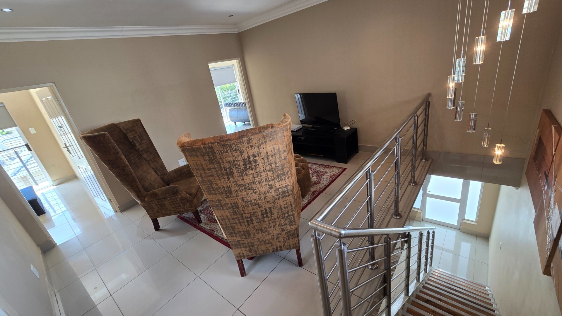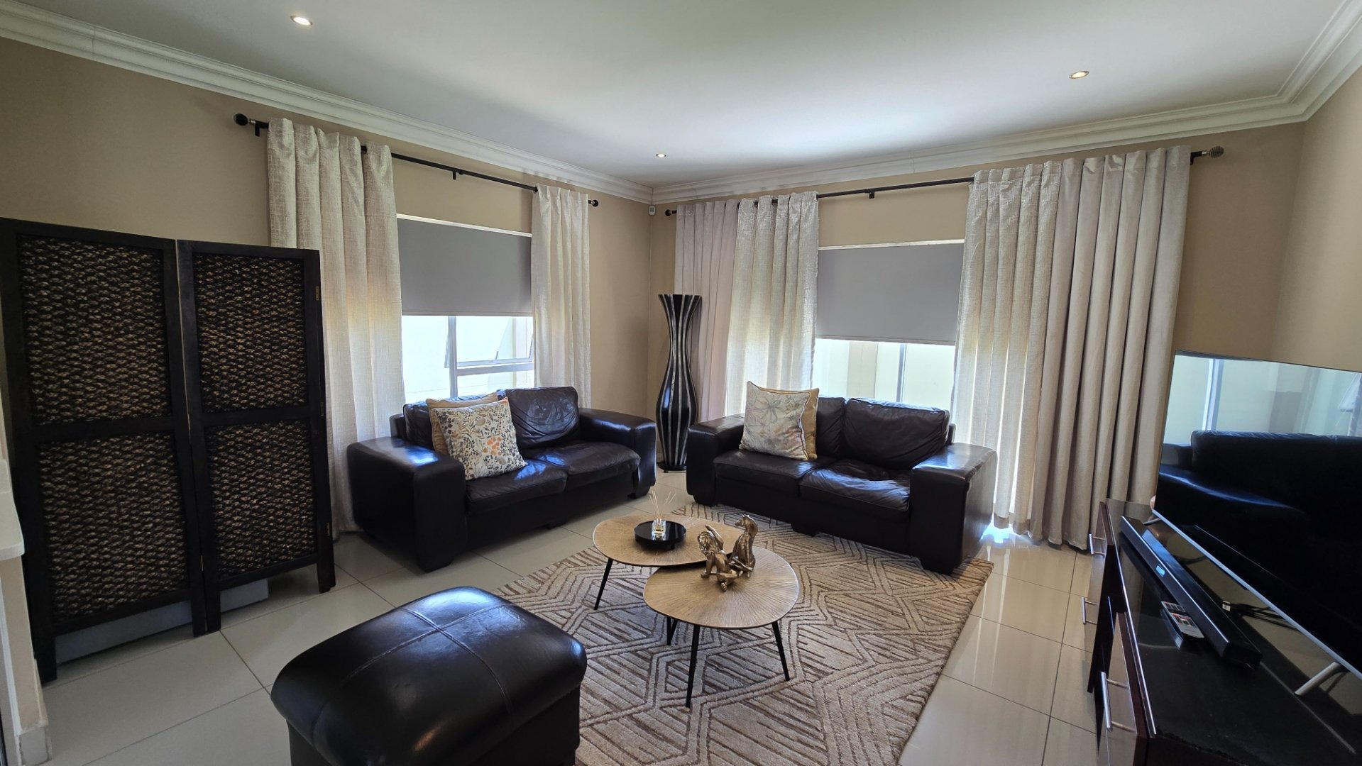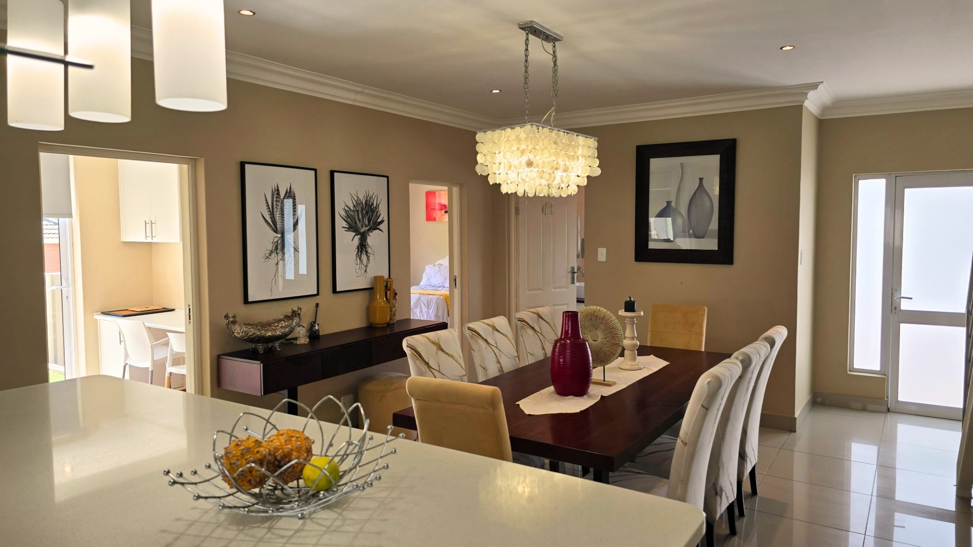 Living Excellence: The heart of the home features a contemporary open-plan kitchen, dining, and TV room. High-quality finishing including black out blinds on most windows, exclusive floor tiles, custom cabinetry, and elegant chandeliers creating an atmosphere of sophisticated luxury.
