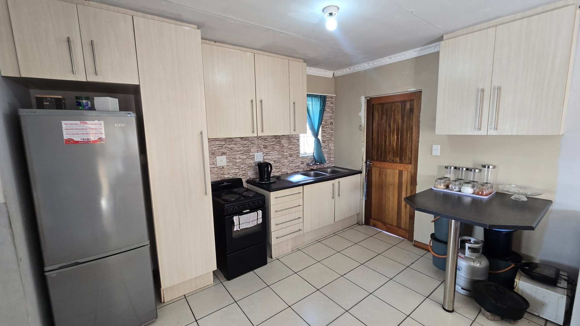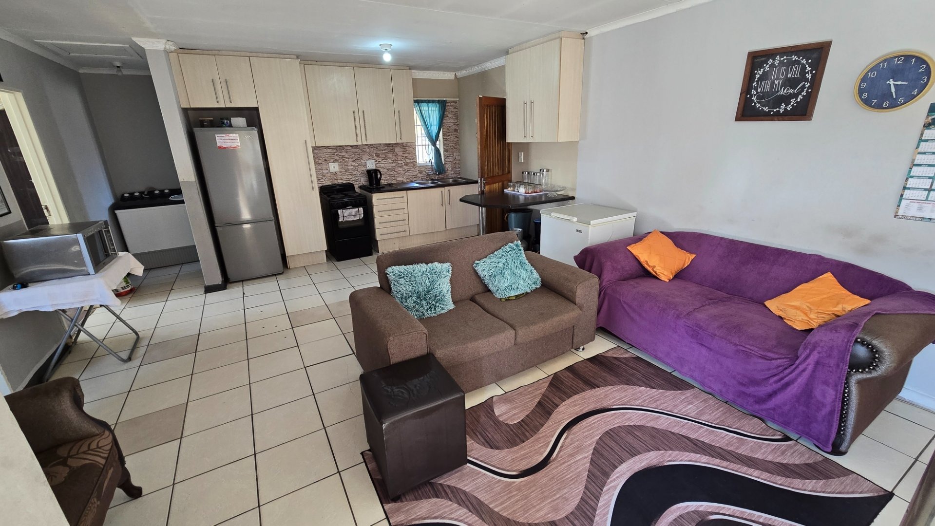 Step into a well-maintained interior featuring a neat kitchen that flows into an open-plan lounge area, creating a welcoming and functional living space. The home is fully tiled throughout, offering a clean, modern look that is both stylish and easy to maintain.