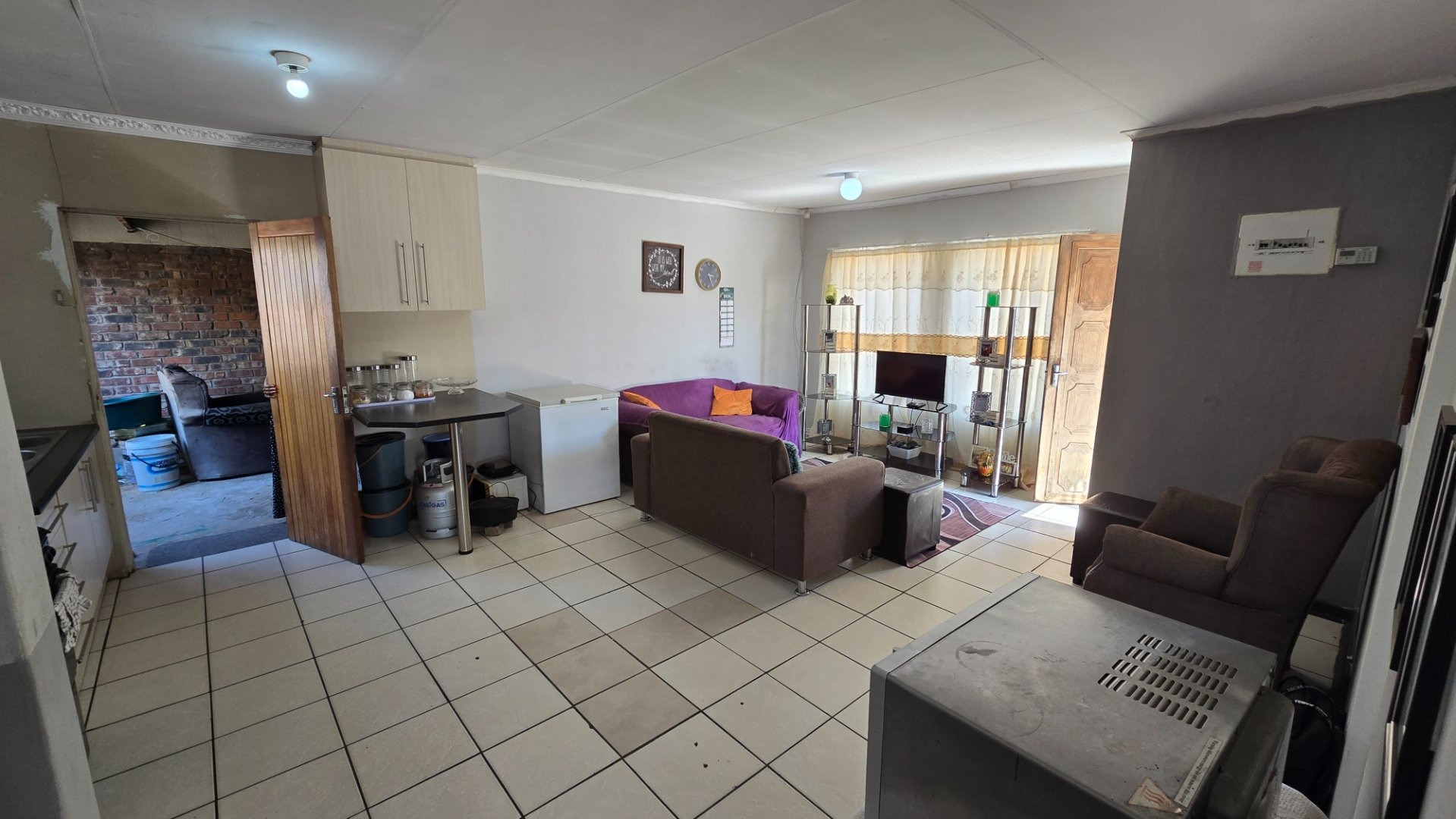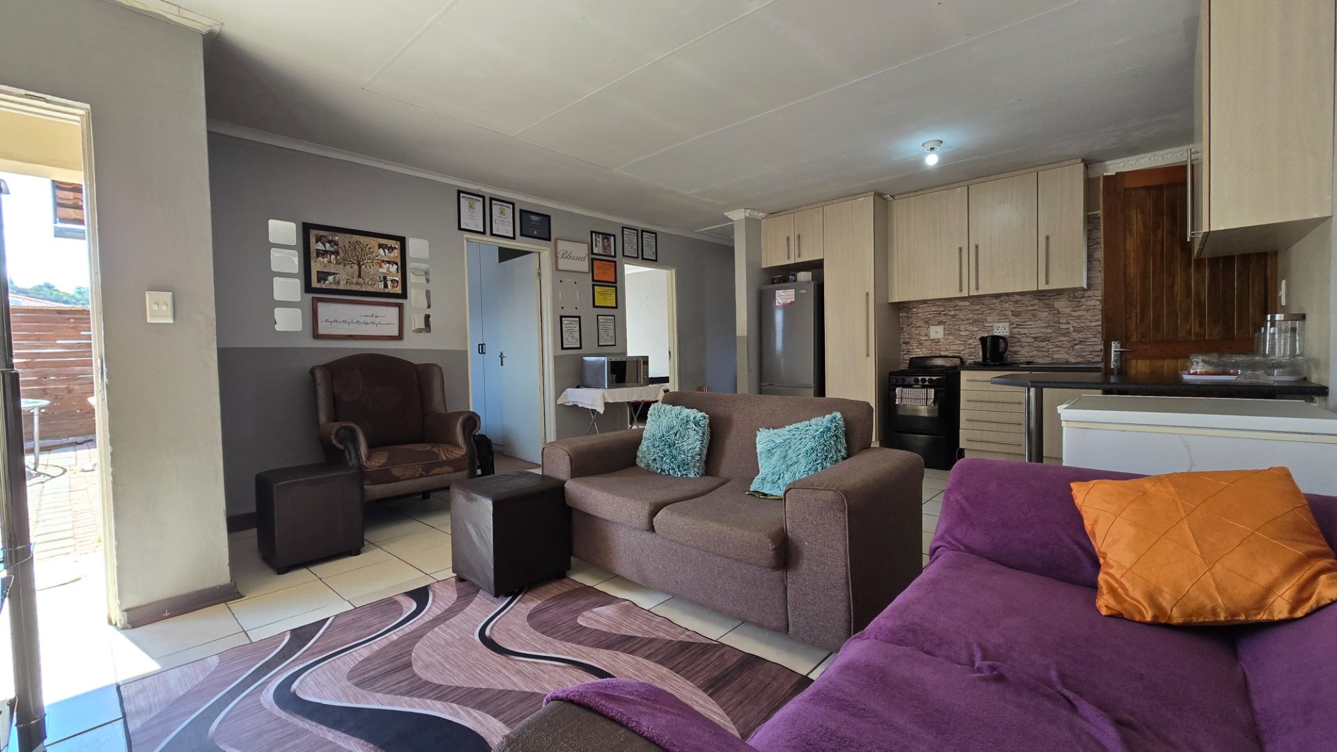 Step into a well-maintained interior featuring a neat kitchen that flows into an open-plan lounge area, creating a welcoming and functional living space. The home is fully tiled throughout, offering a clean, modern look that is both stylish and easy to maintain.