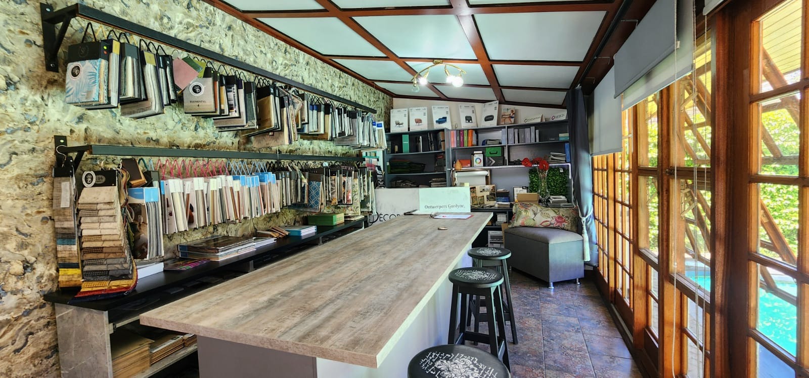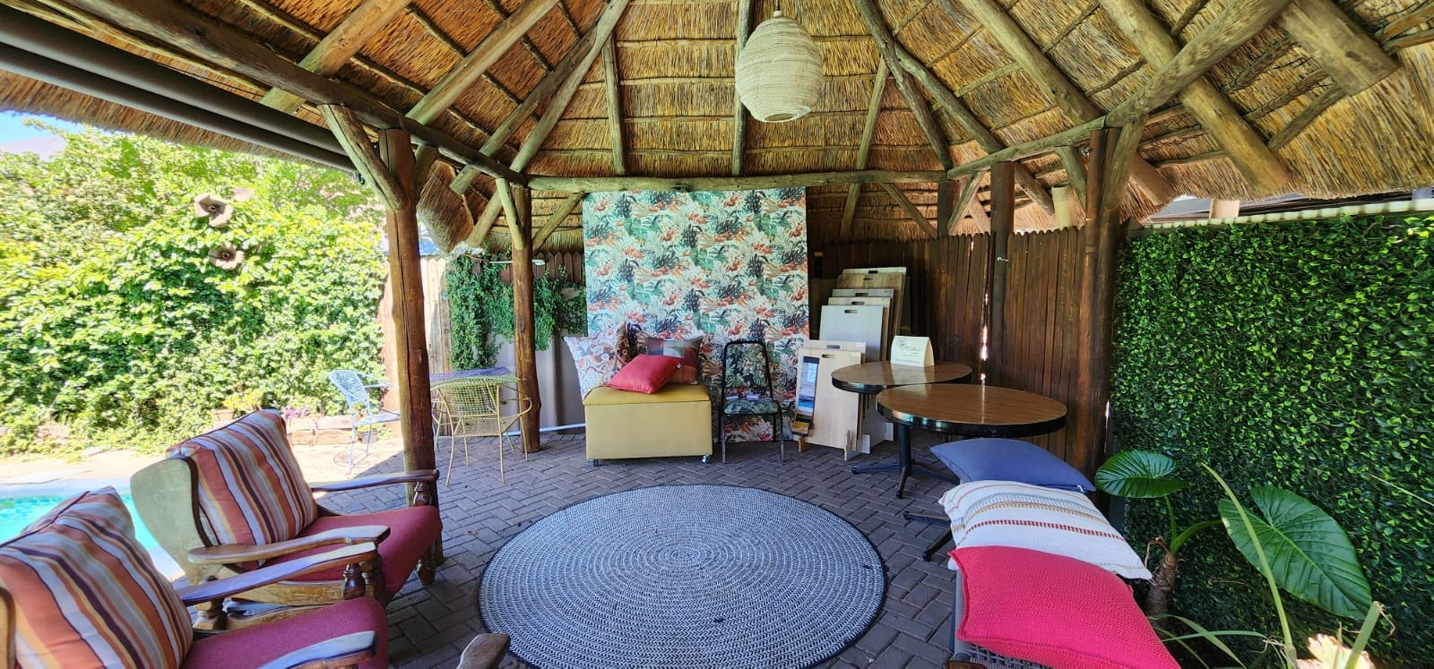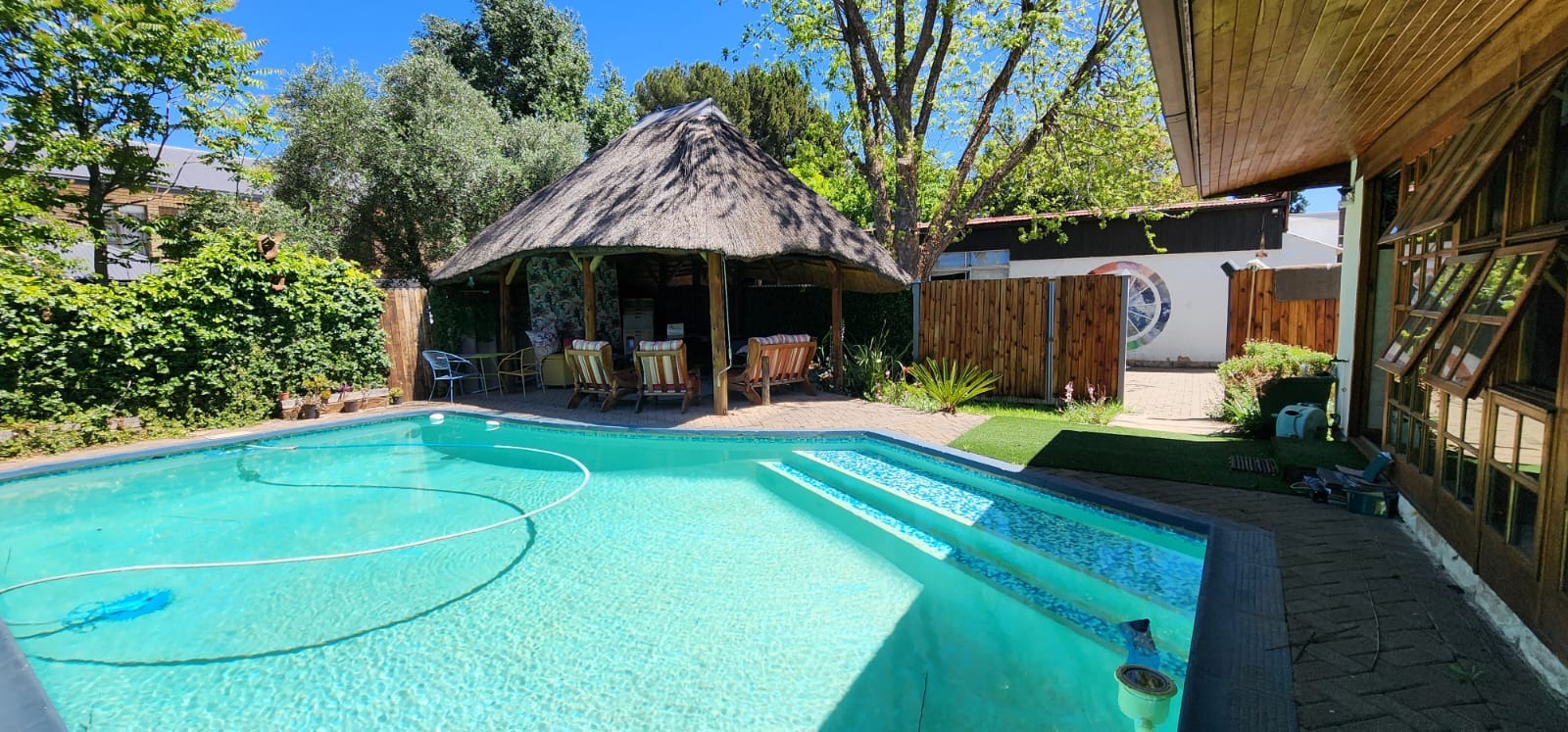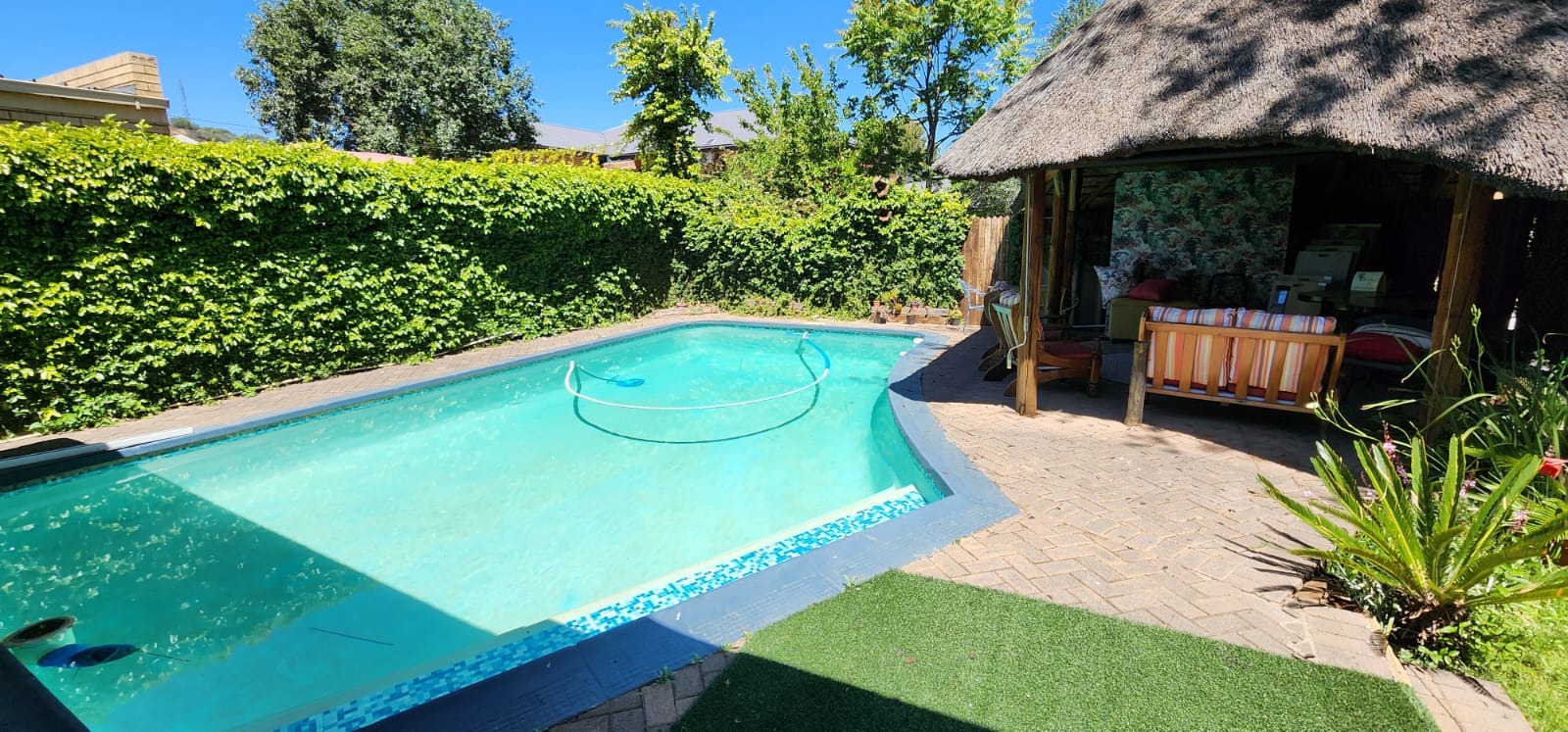 The layout features a welcoming reception area, flanked by expansive open-plan spaces — perfectly suited for a showroom, salon, or café environment. The kitchen leads into the one showroom. Down the passage are two beautiful, upgraded, bathrooms, additional private offices, and a coffee station for staff or clients to enjoy the view over the entertainment area, complete with a sparkling pool and lapa, offering the perfect spot for informal gatherings or staff relaxation. The outbuildings include a separate workshop, and there are three smaller covered areas that can serve as storage, parking, or additional creative work areas.