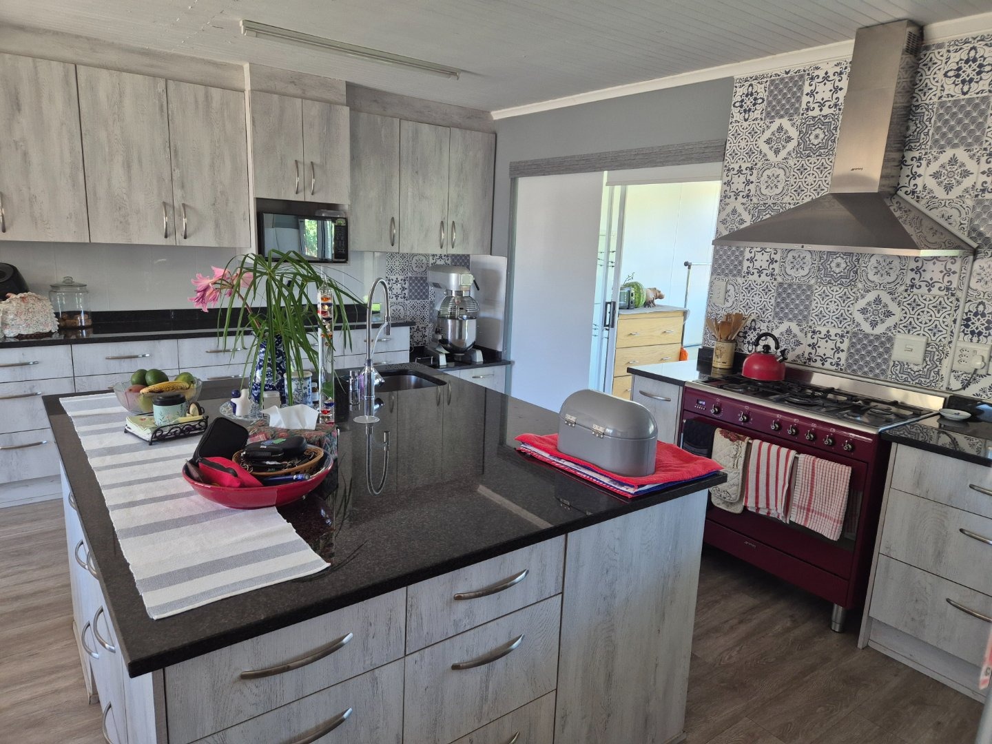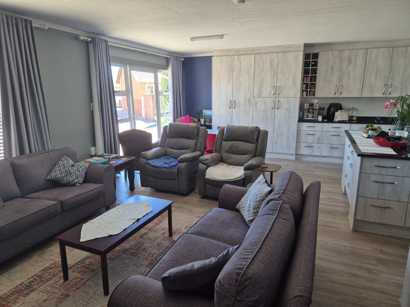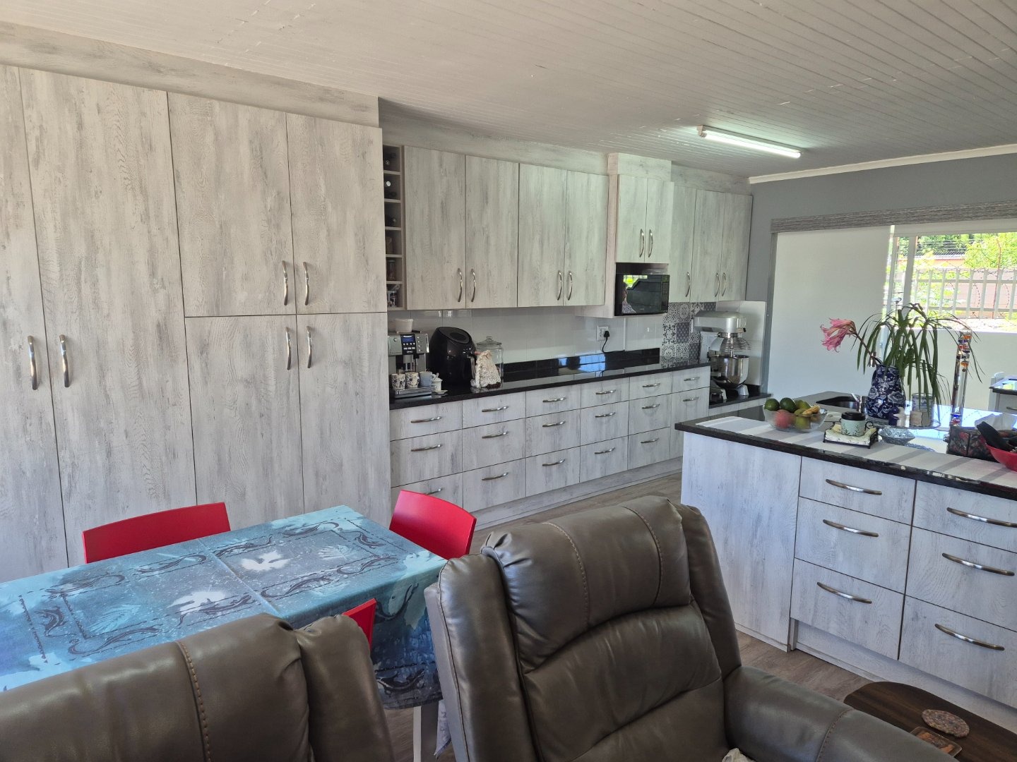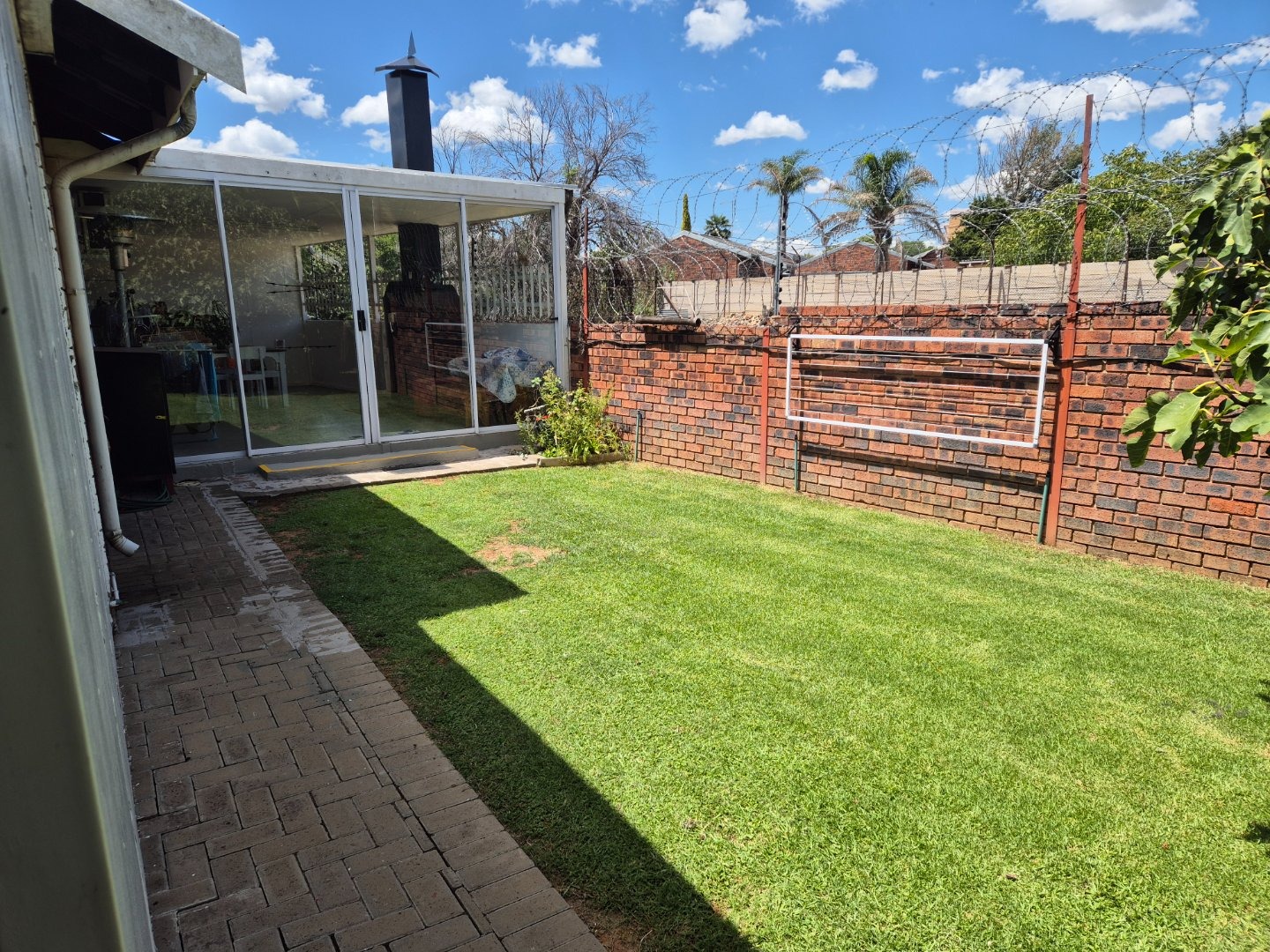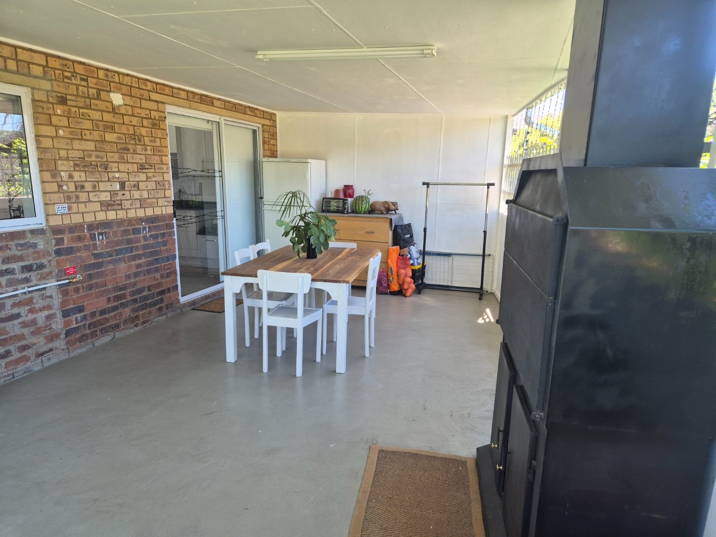Sliding doors opening onto a covered patio with built-in braai — the ideal space for morning coffee, relaxed afternoons, or entertaining loved ones.