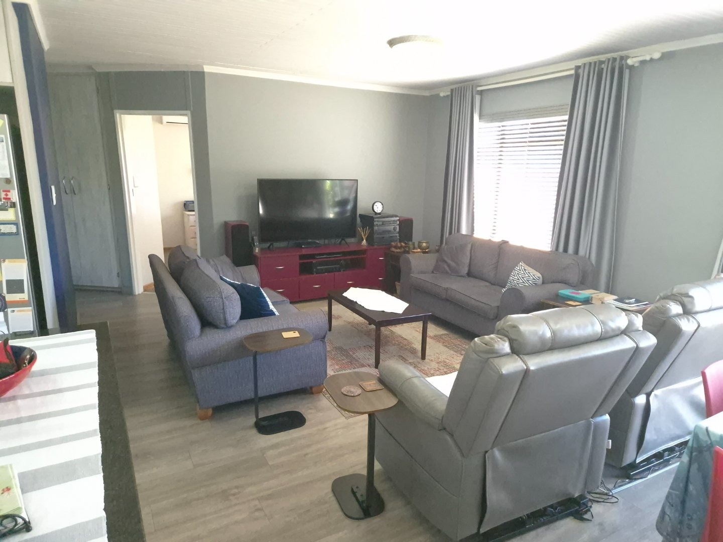 A bright open-plan lounge and dining area, finished with stylish laminate flooring and complemented by a powerful air-conditioning unit.